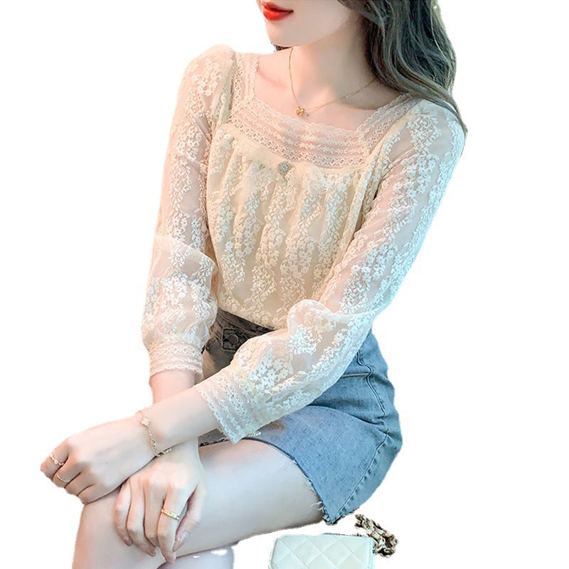 2024 새로운 이른 봄 레이스 셔츠 여자 유행 하이 엔드 스퀘어 칼라 쉬폰 셔츠 여성을위한 올 매치 탑