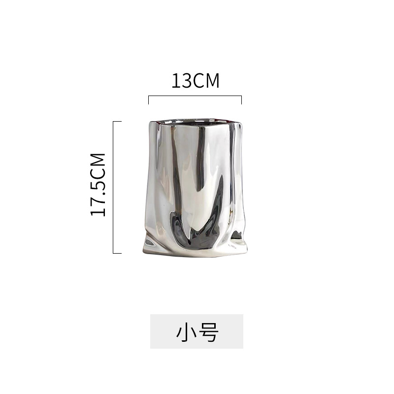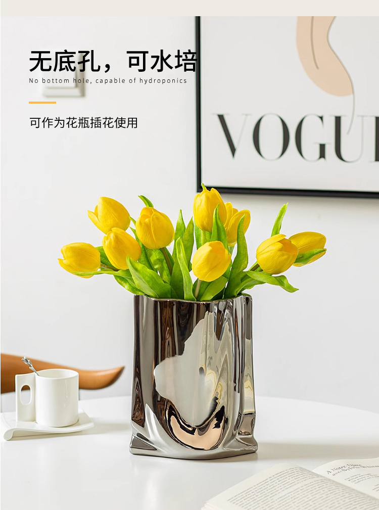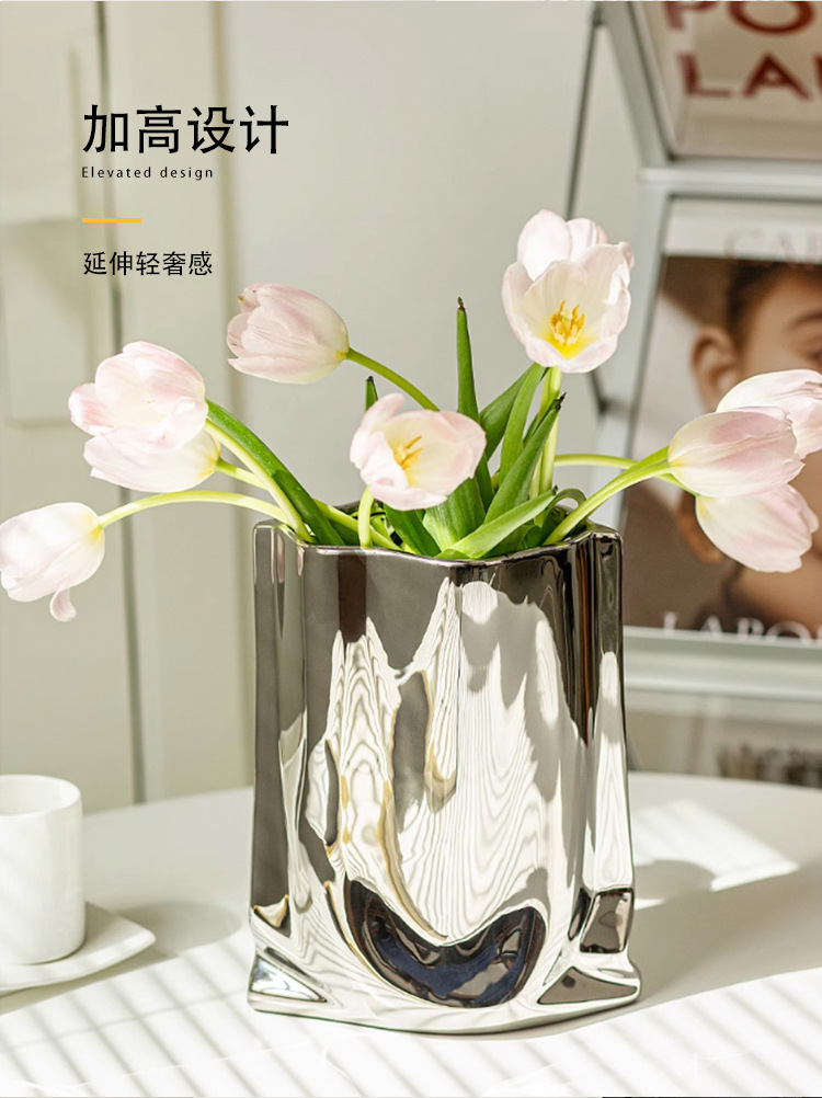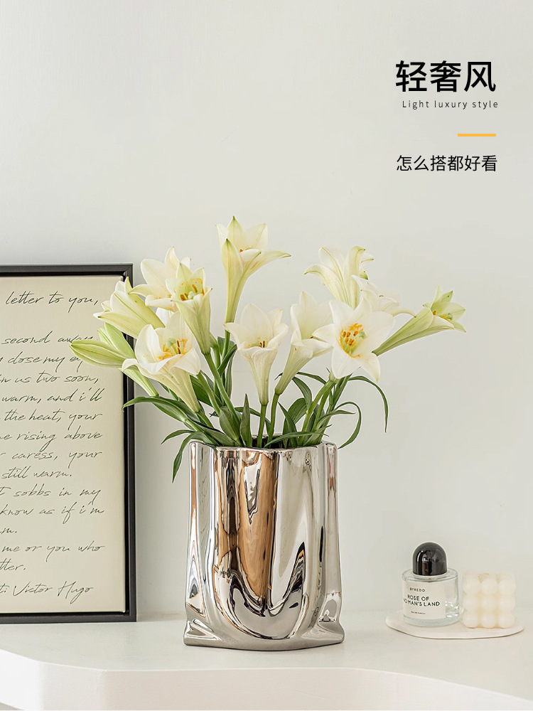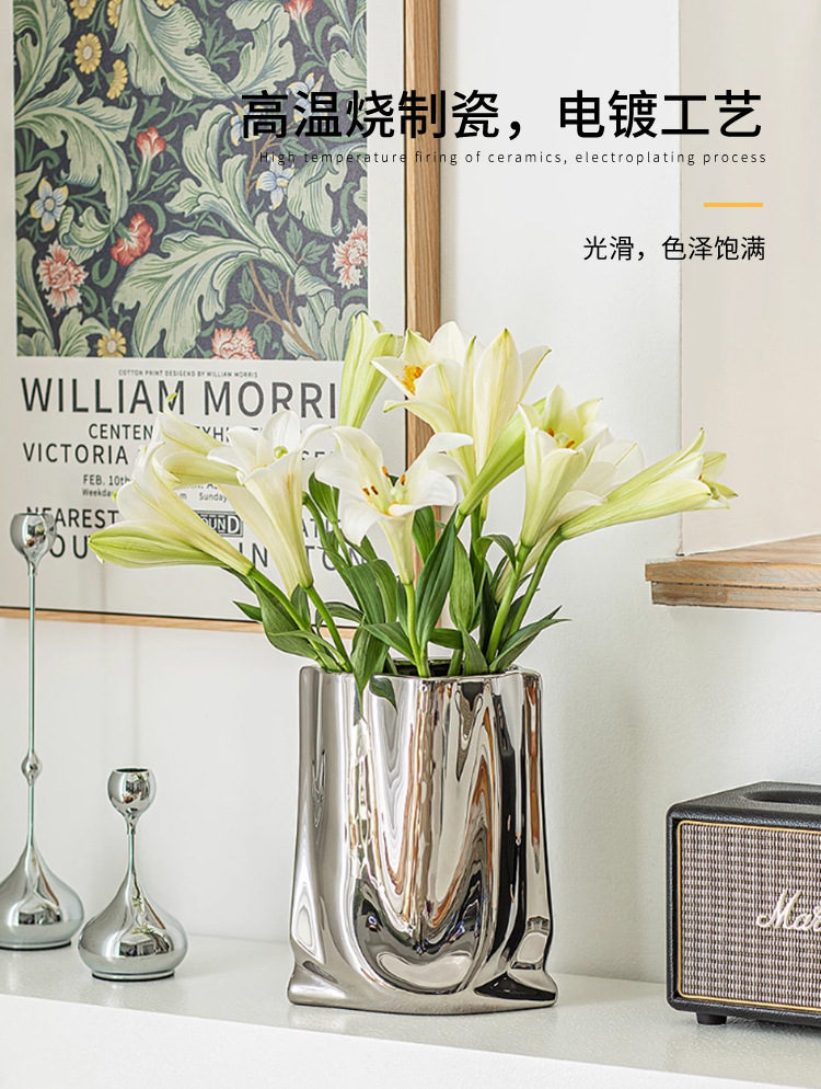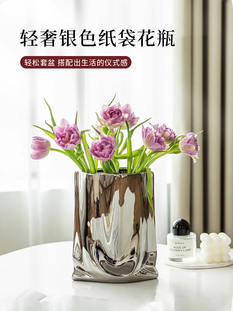 은색 꽃병, 가벼운 럭셔리 및 고급 전기 도금 세라믹 꽃병 장식품, 거실 장식, 종이 봉투 꽃꽂이, 작은 꽃병