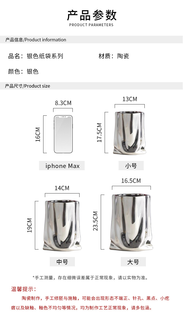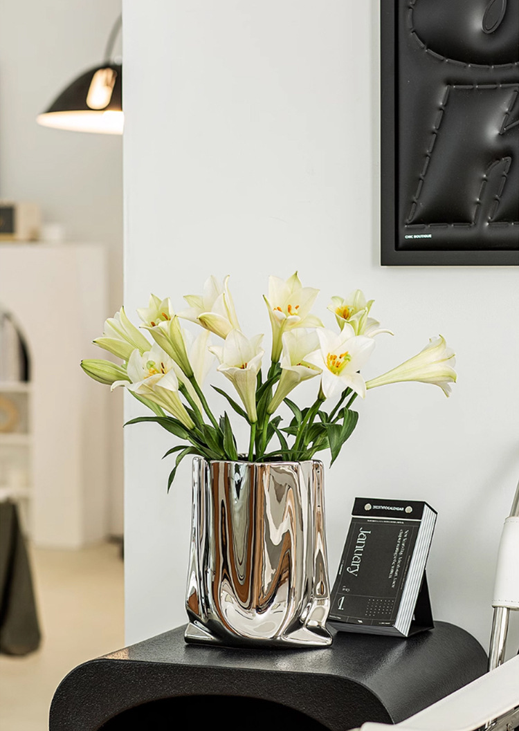 은색 꽃병, 가벼운 럭셔리 및 고급 전기 도금 세라믹 꽃병 장식품, 거실 장식, 종이 봉투 꽃꽂이, 작은 꽃병스토어 가기