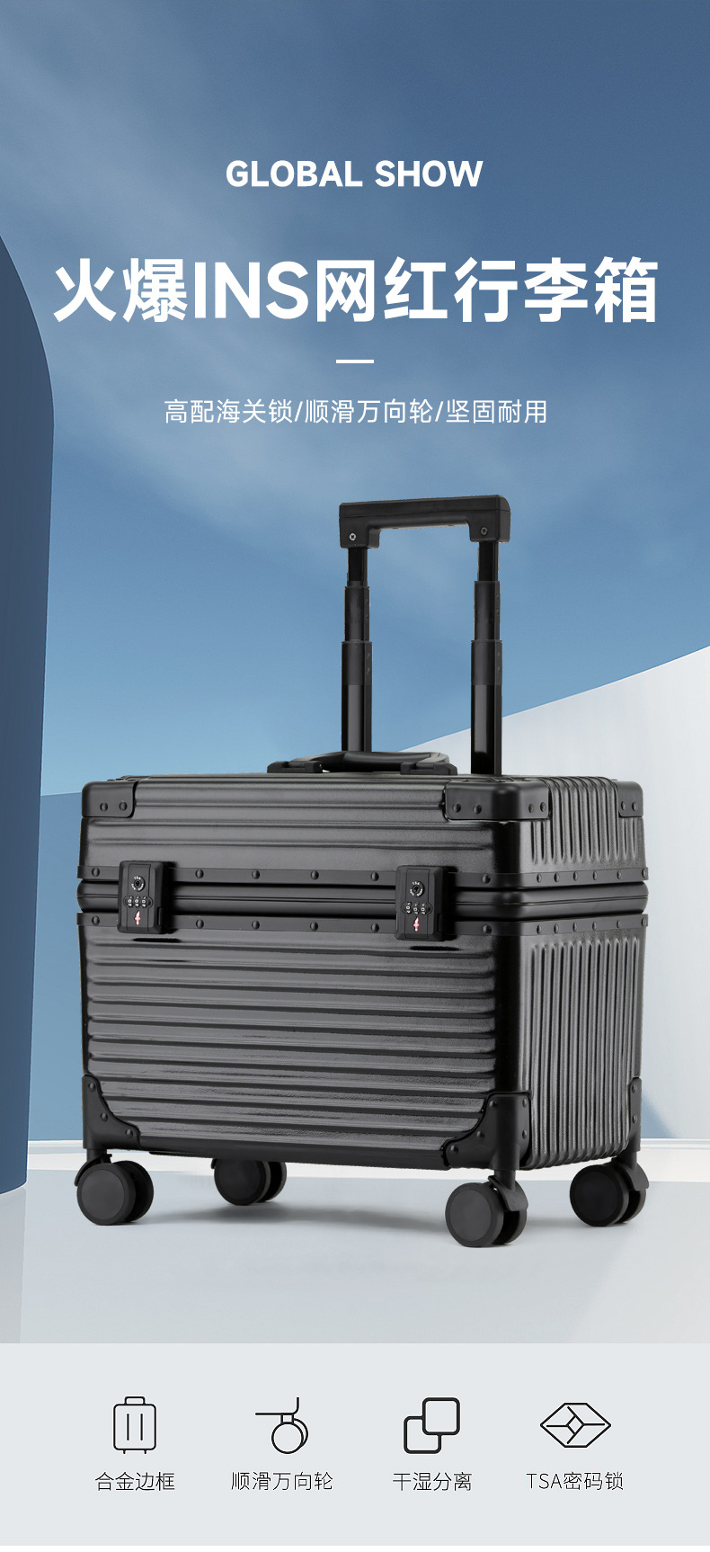 18 인치 긴 박스 항공 탑승 케이스 패션 사진 상자 알루미늄 프레임 수하물 남성과 여성의 유니버설 휠 여행 트롤리 케이스스토어 가기