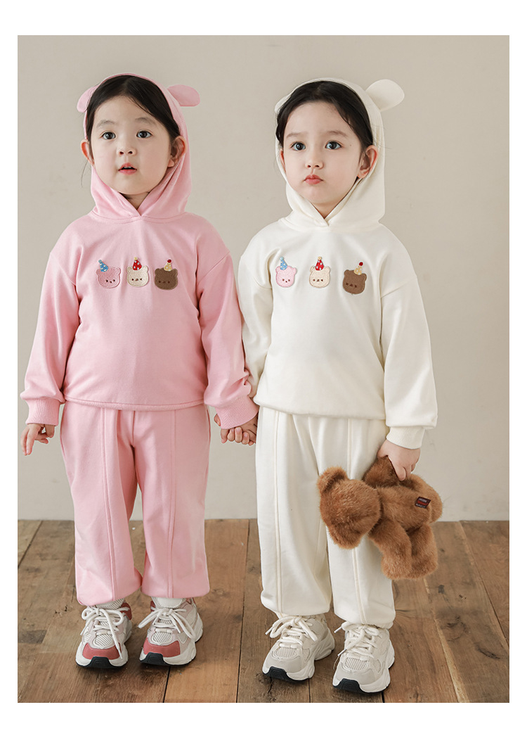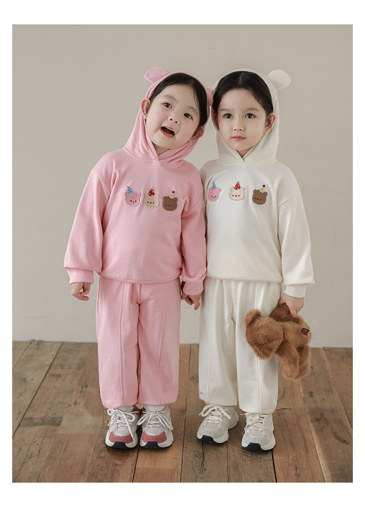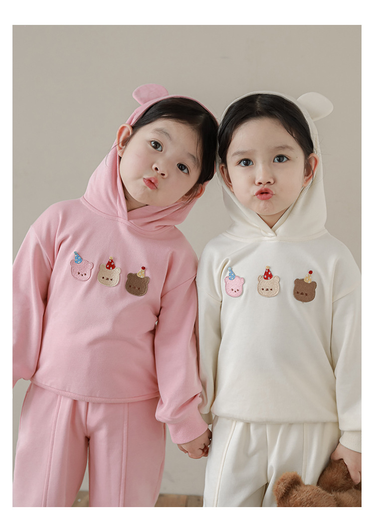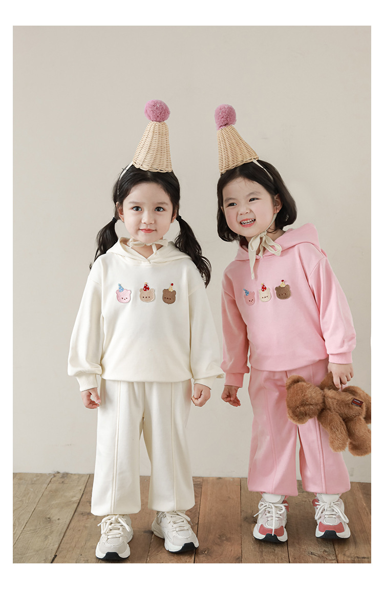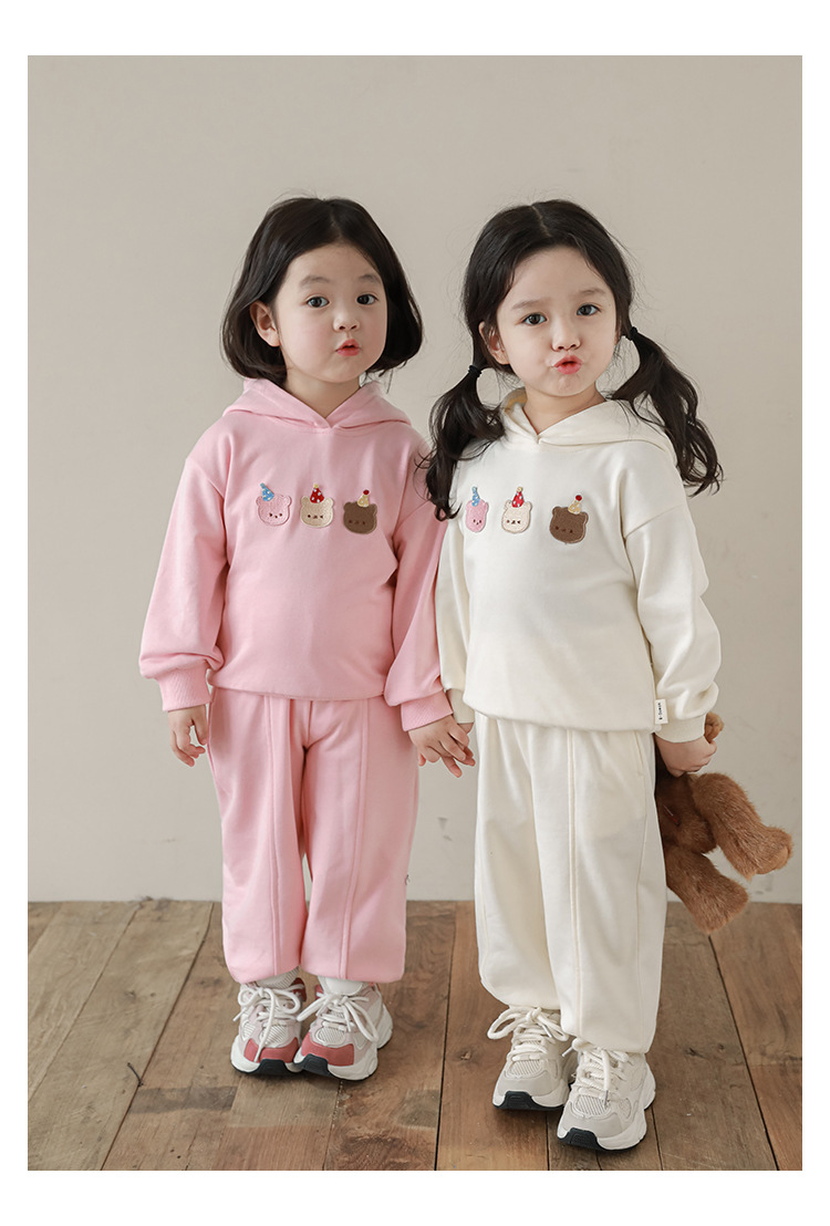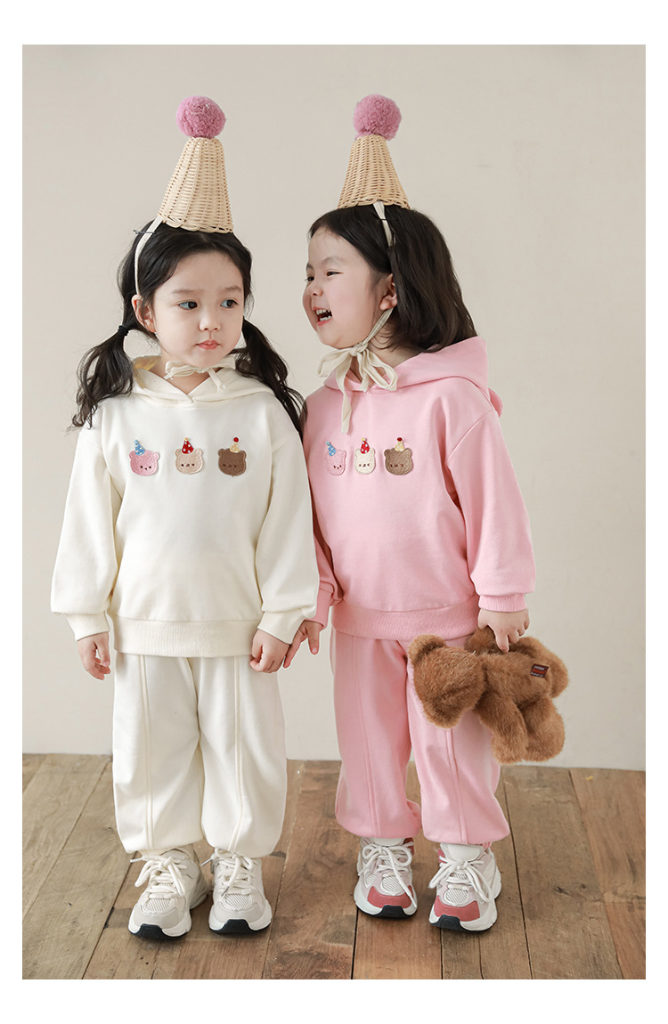 Qiu Duomeng 소녀 곰 수 놓은 세트 2025 봄과 가을 새로운 어린이 만화 후드 착용 바지 투피스 세트