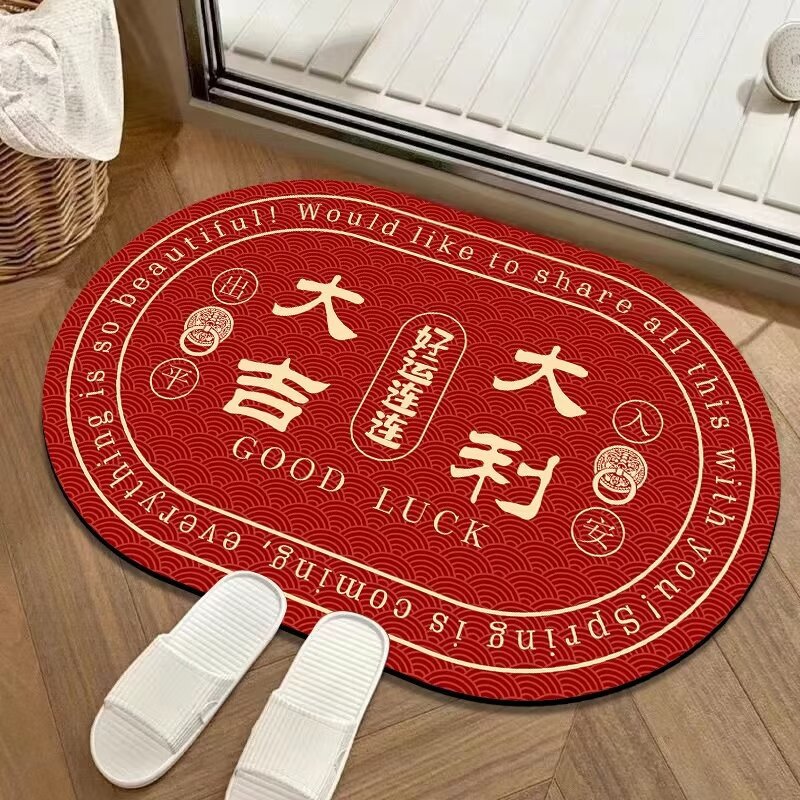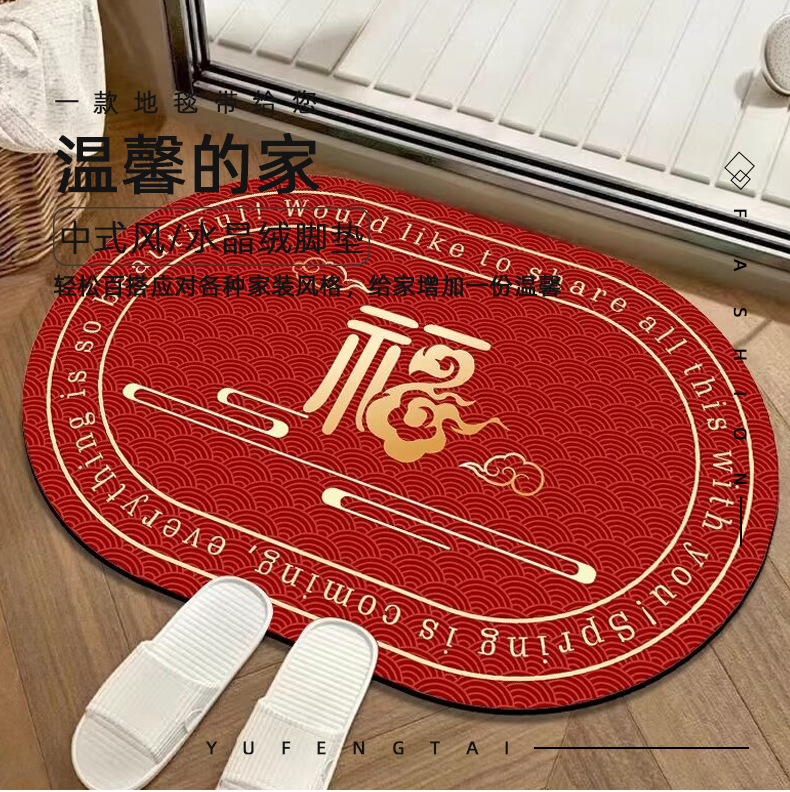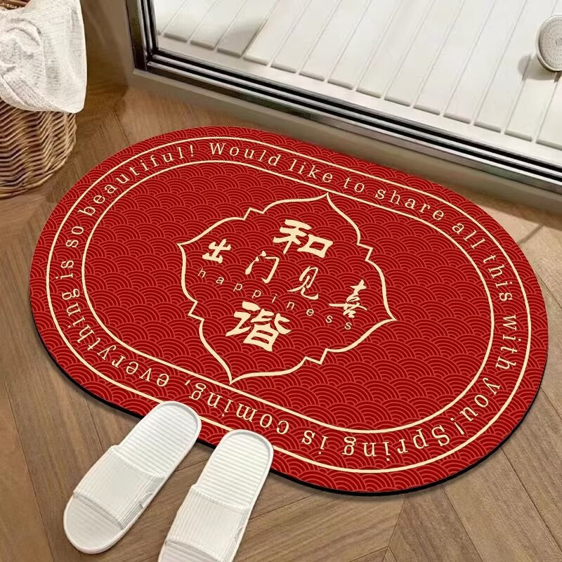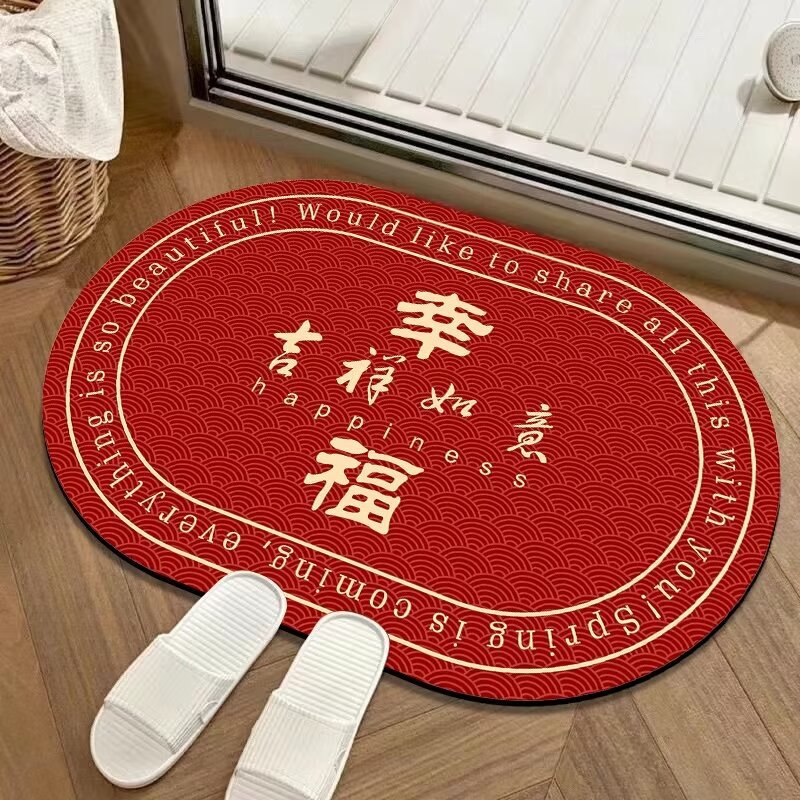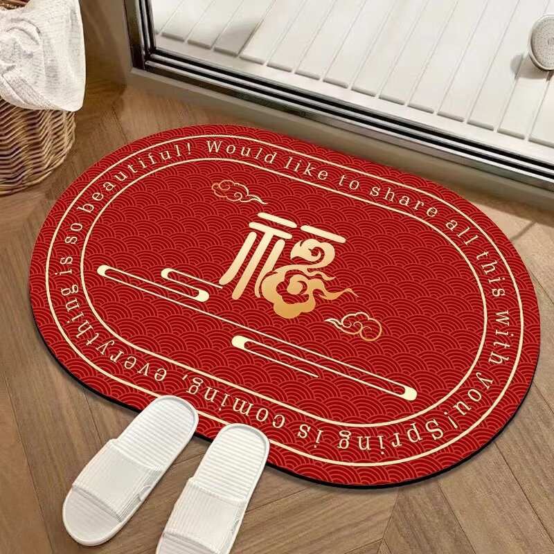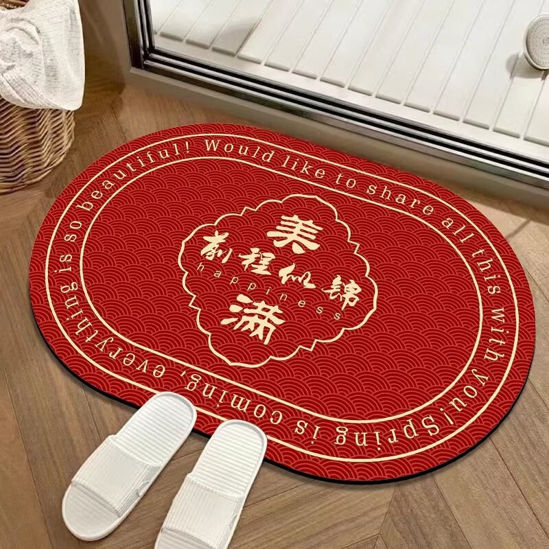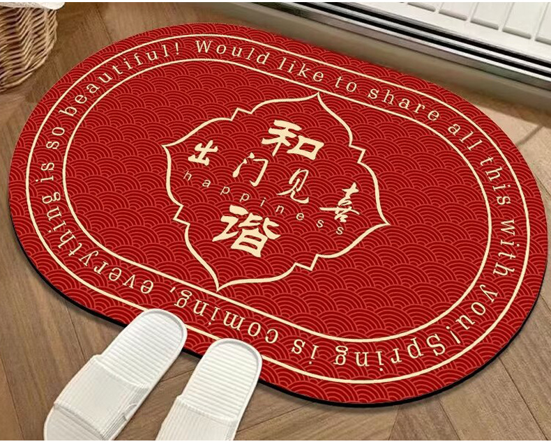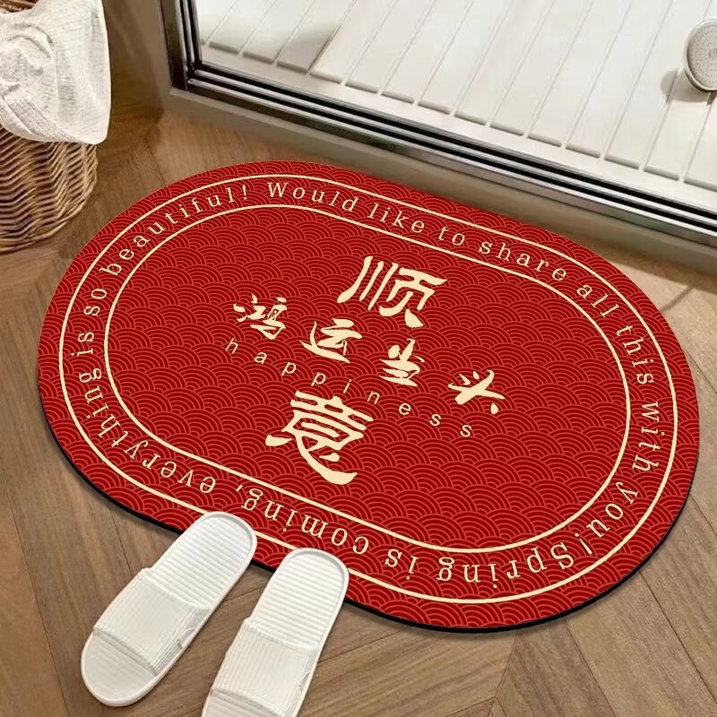 새해 빨간 입구 문 매트 타원형 크리스탈 벨벳 실리콘 바닥 문 매트 중국 미끄럼 방지 흡수 욕실 매트스토어 가기