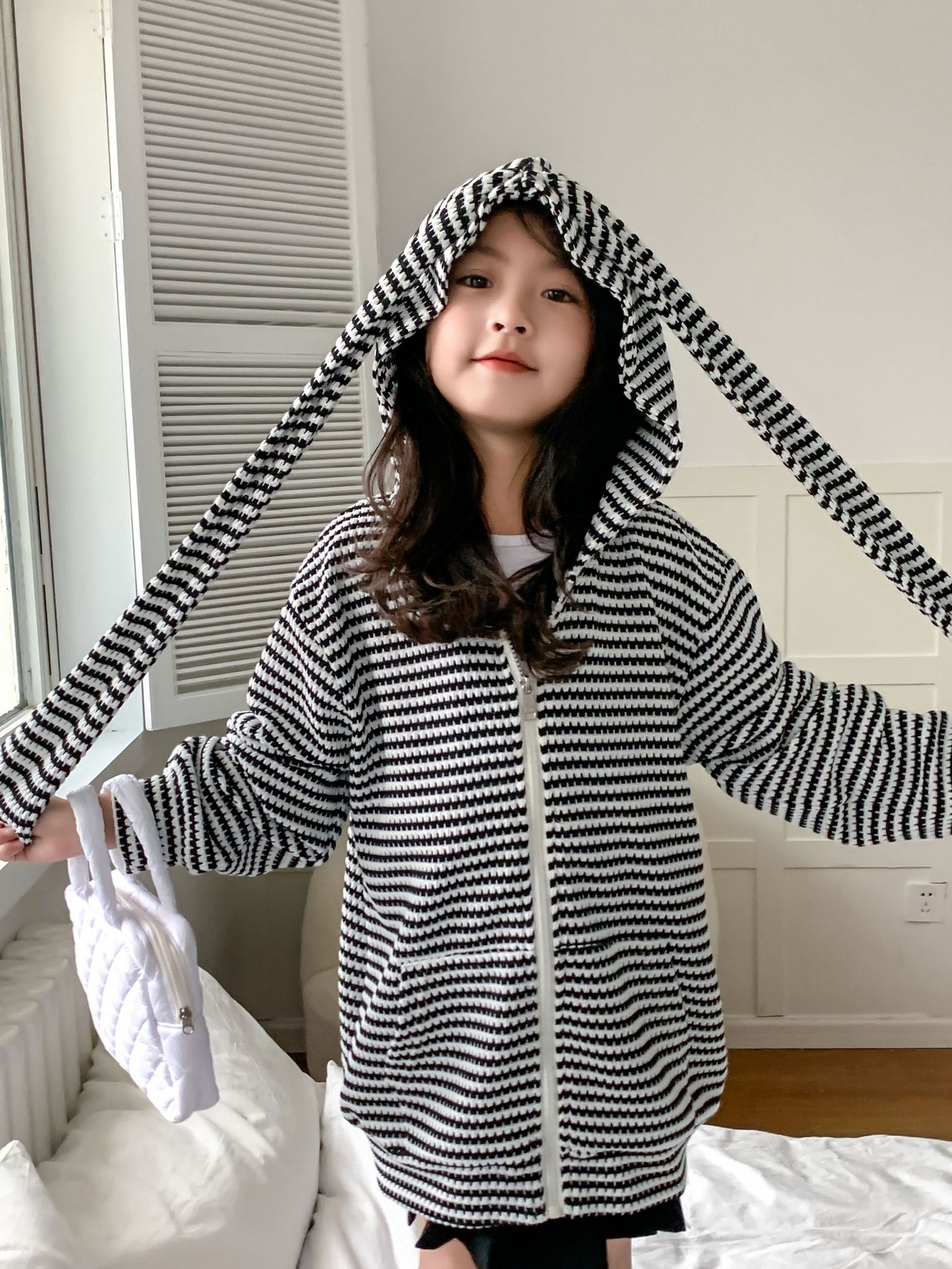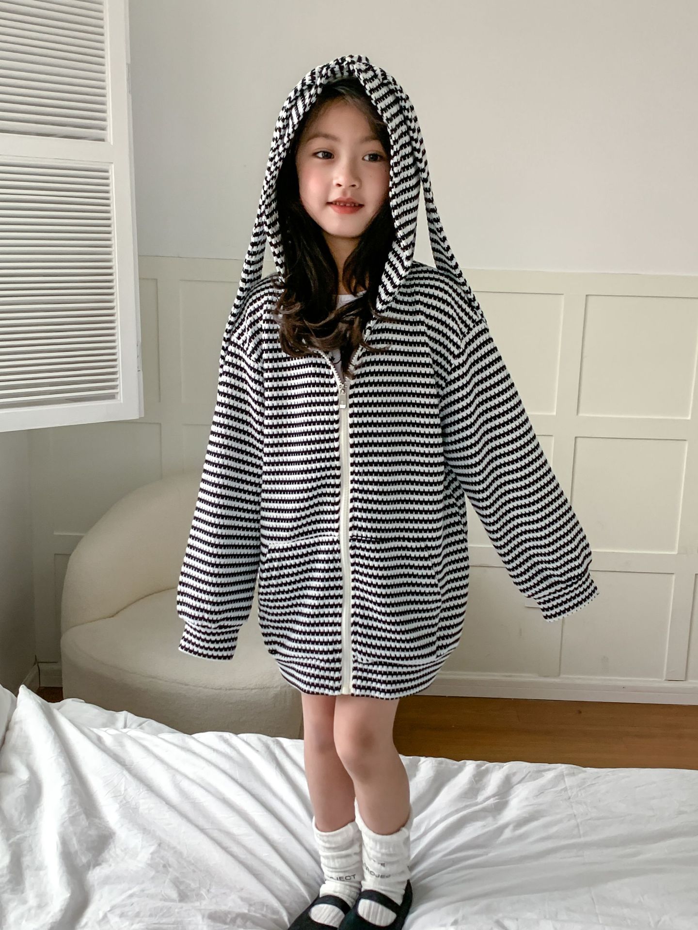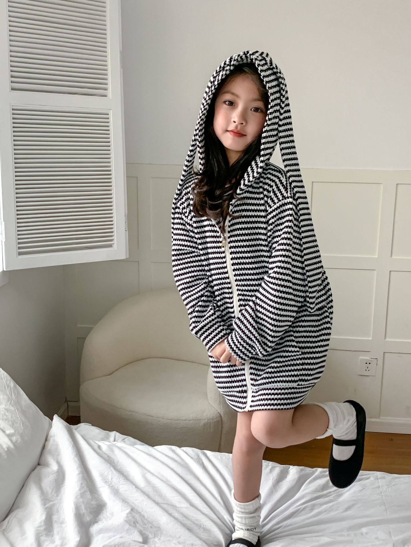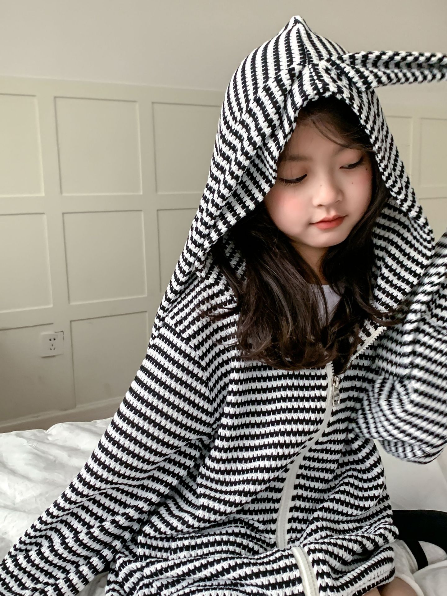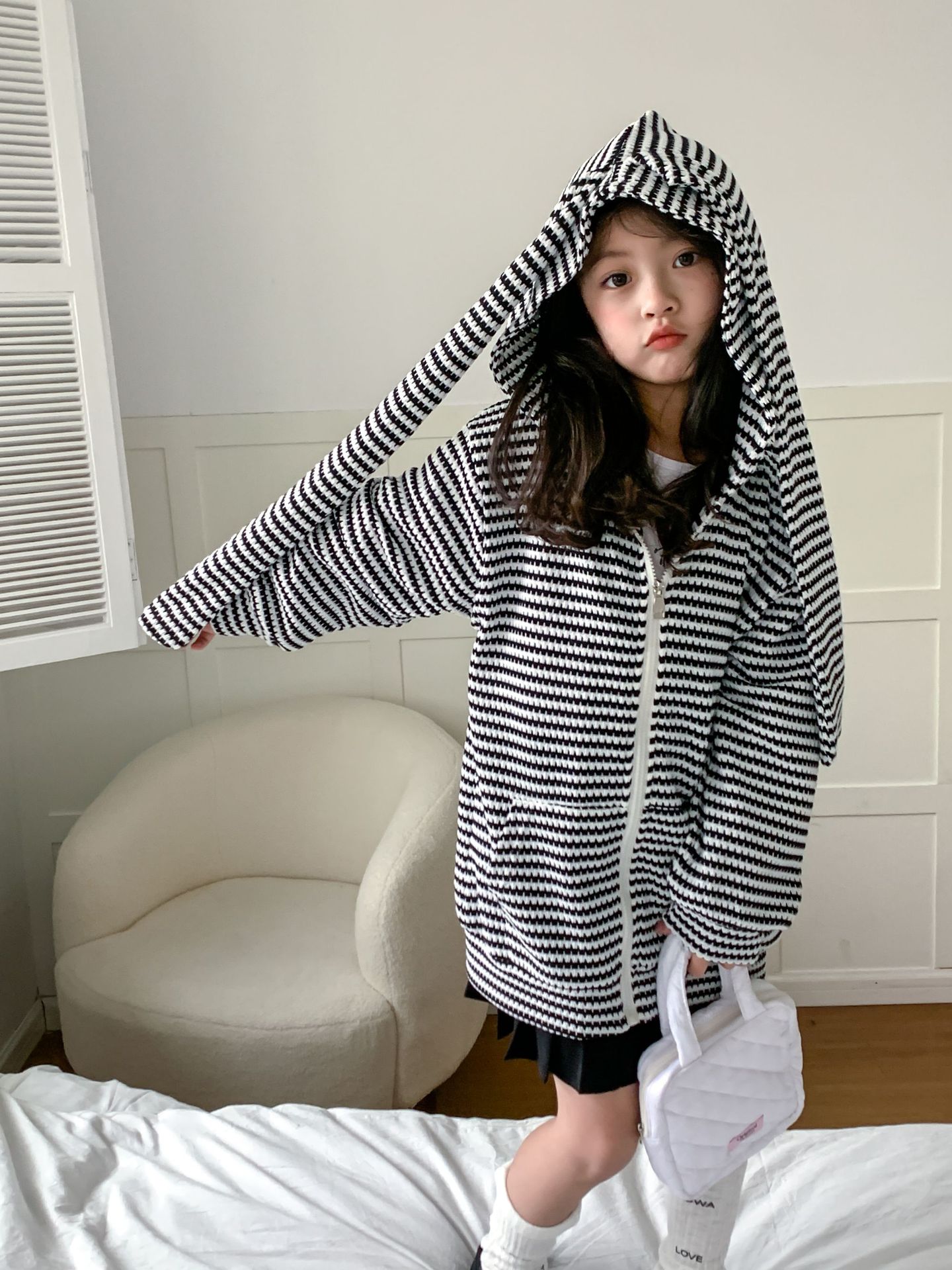 어린이 코트 2024 봄 소녀 줄무늬 토끼 귀 후드 코트 미디어와 큰 어린이 소녀의 트렌디 한 중간 길이 카디건스토어 가기