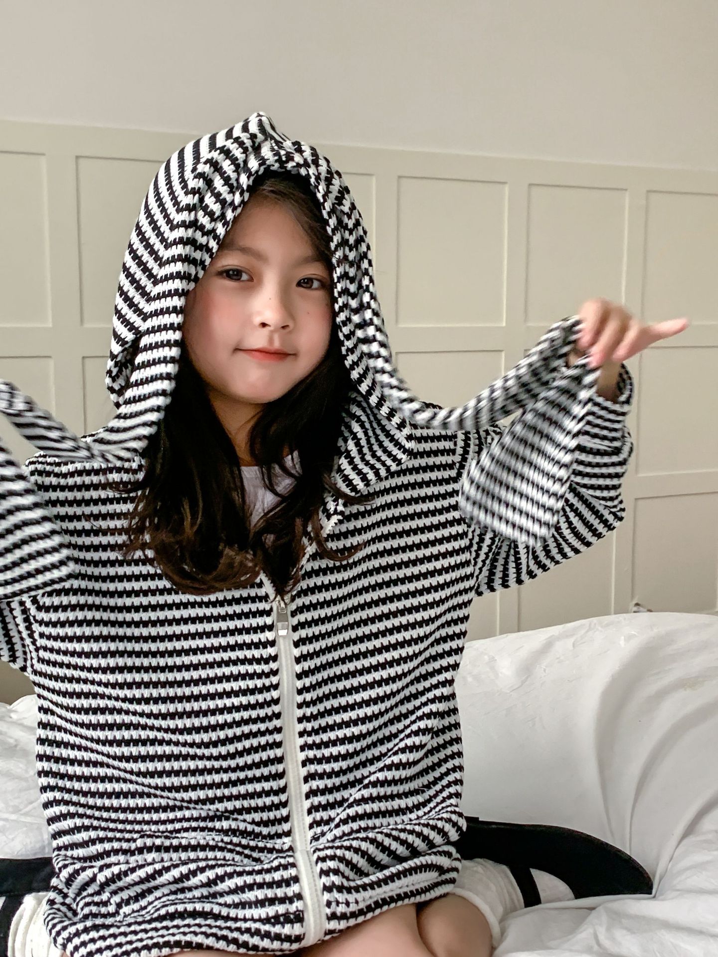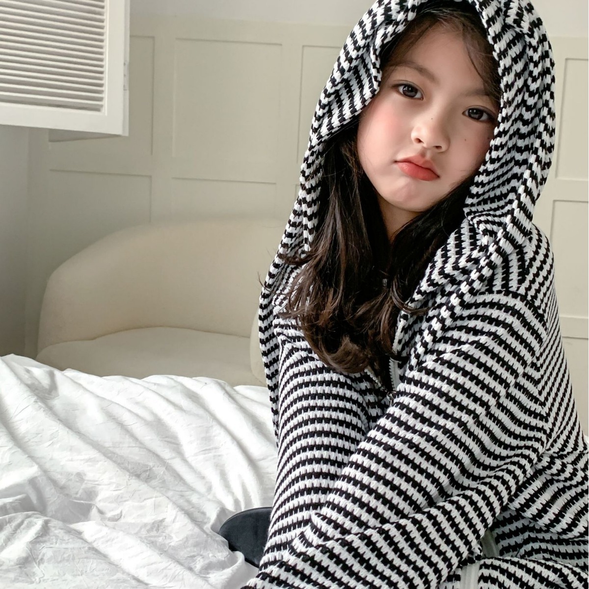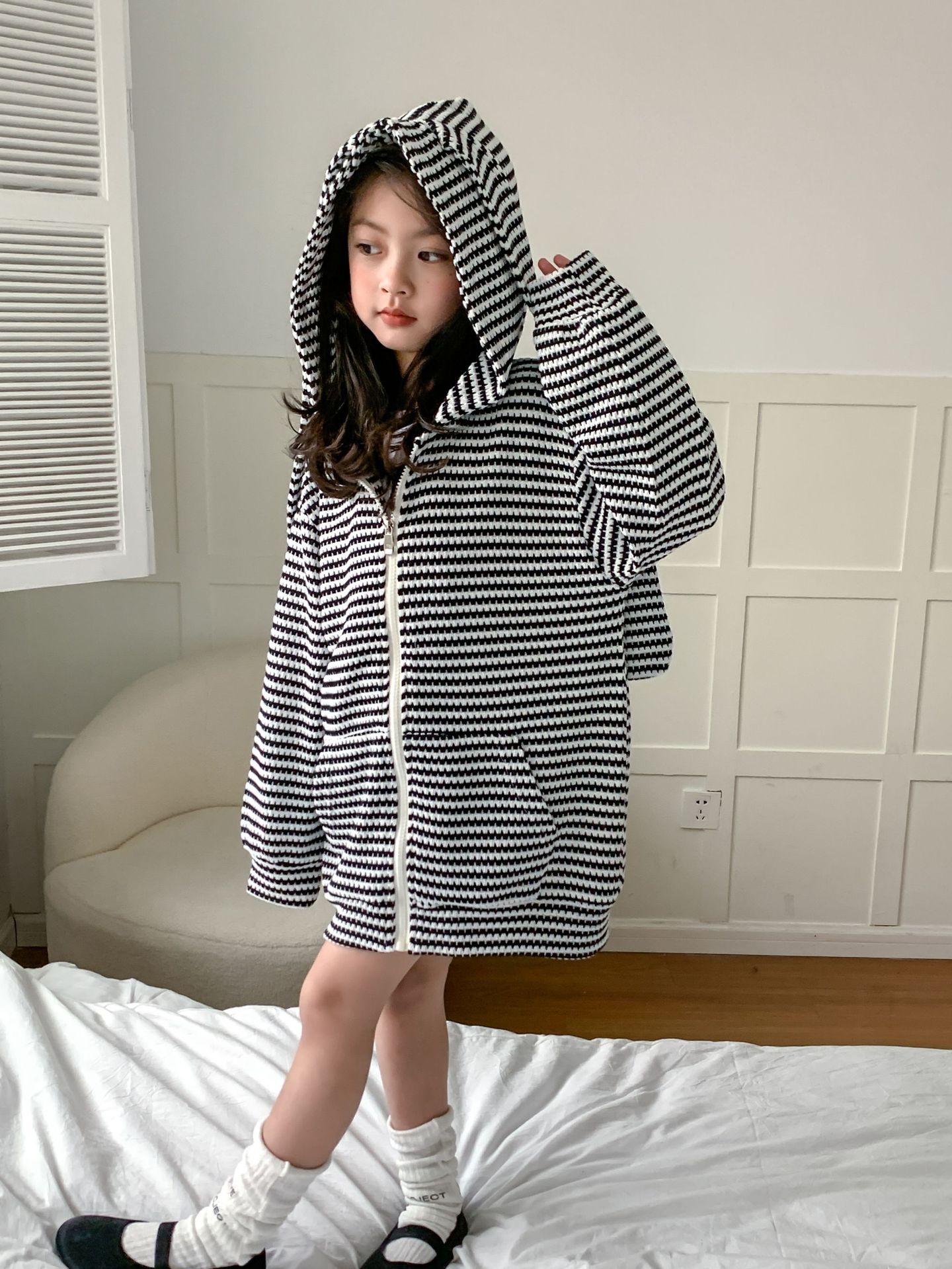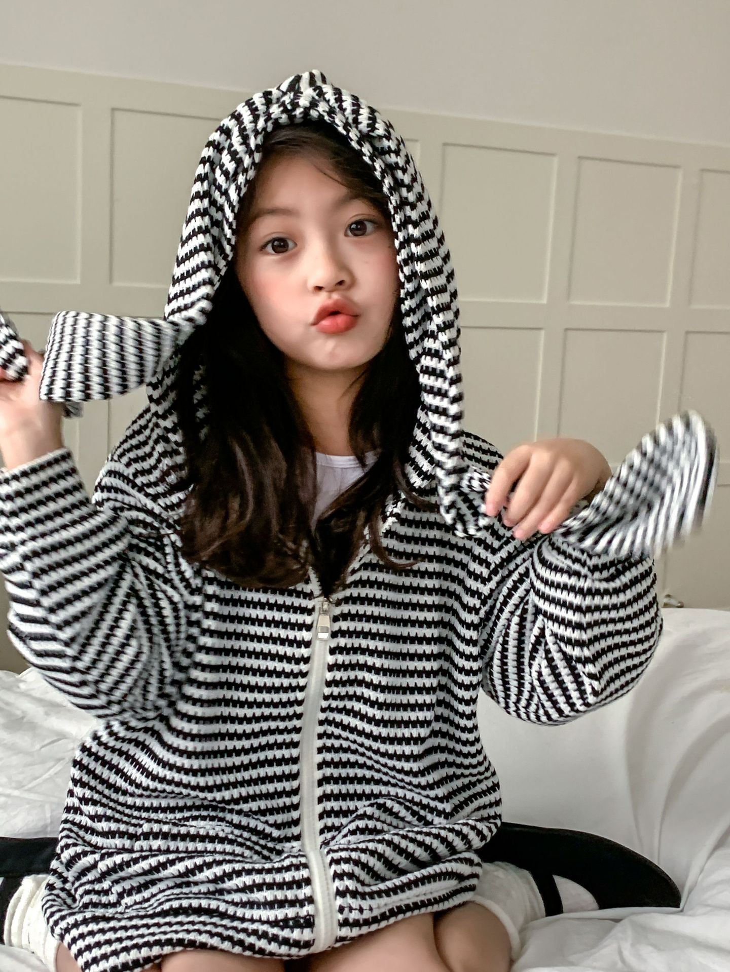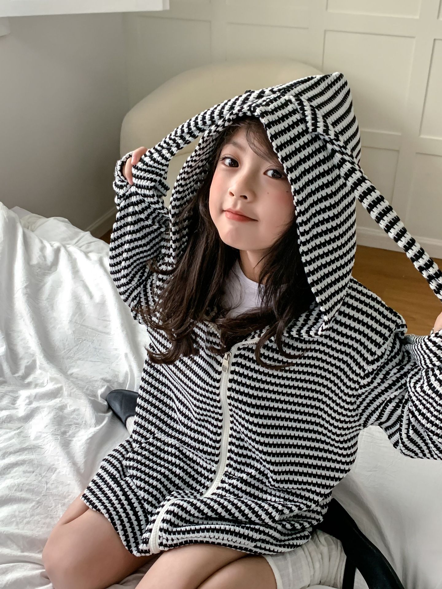 어린이 코트 2024 봄 소녀 줄무늬 토끼 귀 후드 코트 미디어와 큰 어린이 소녀의 트렌디 한 중간 길이 카디건스토어 가기