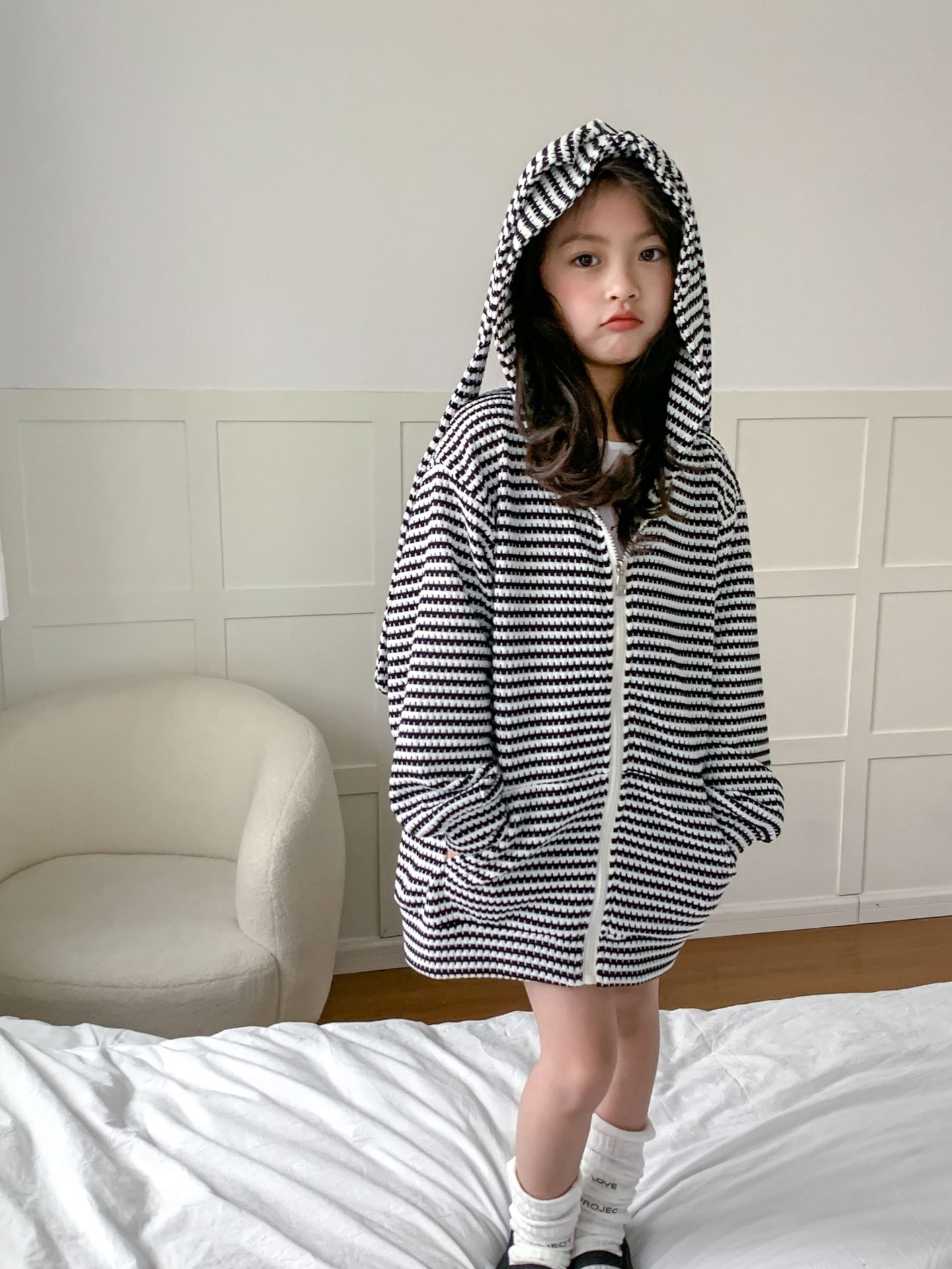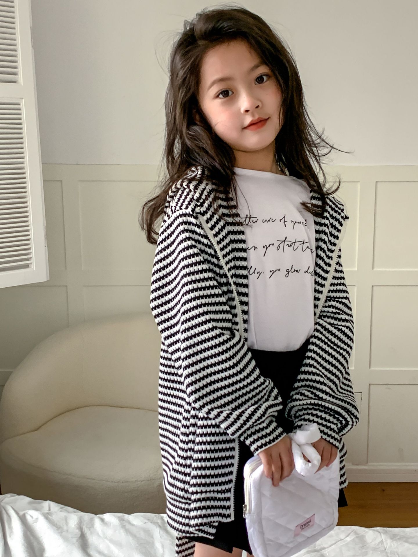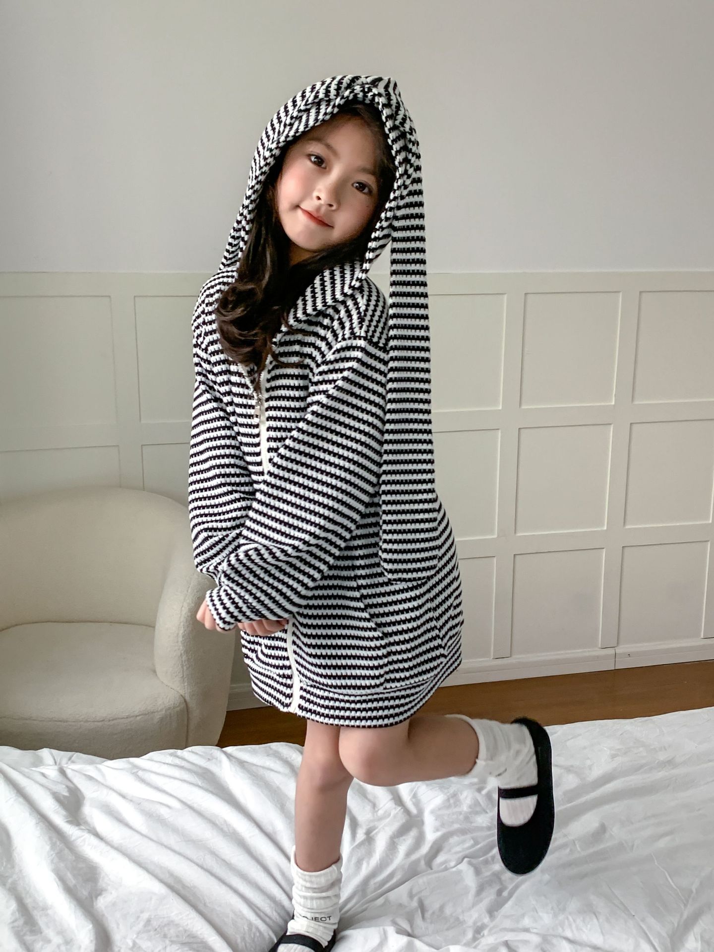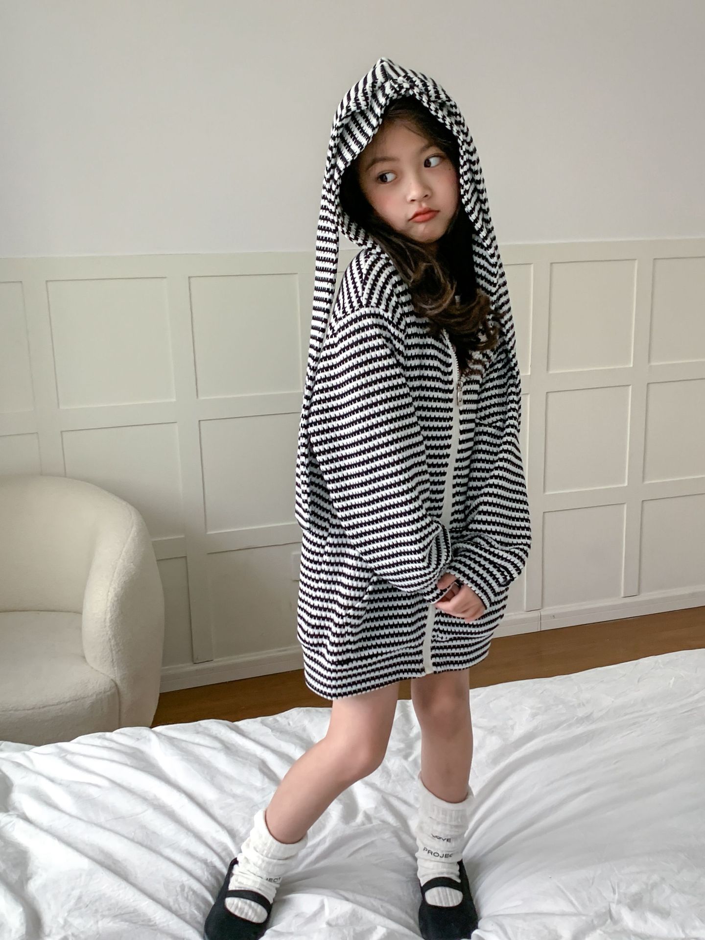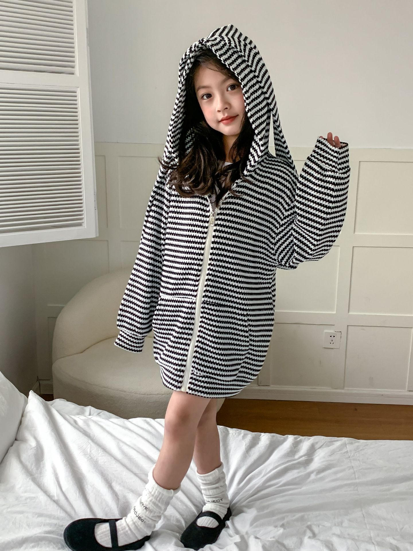 어린이 코트 2024 봄 소녀 줄무늬 토끼 귀 후드 코트 미디어와 큰 어린이 소녀의 트렌디 한 중간 길이 카디건스토어 가기