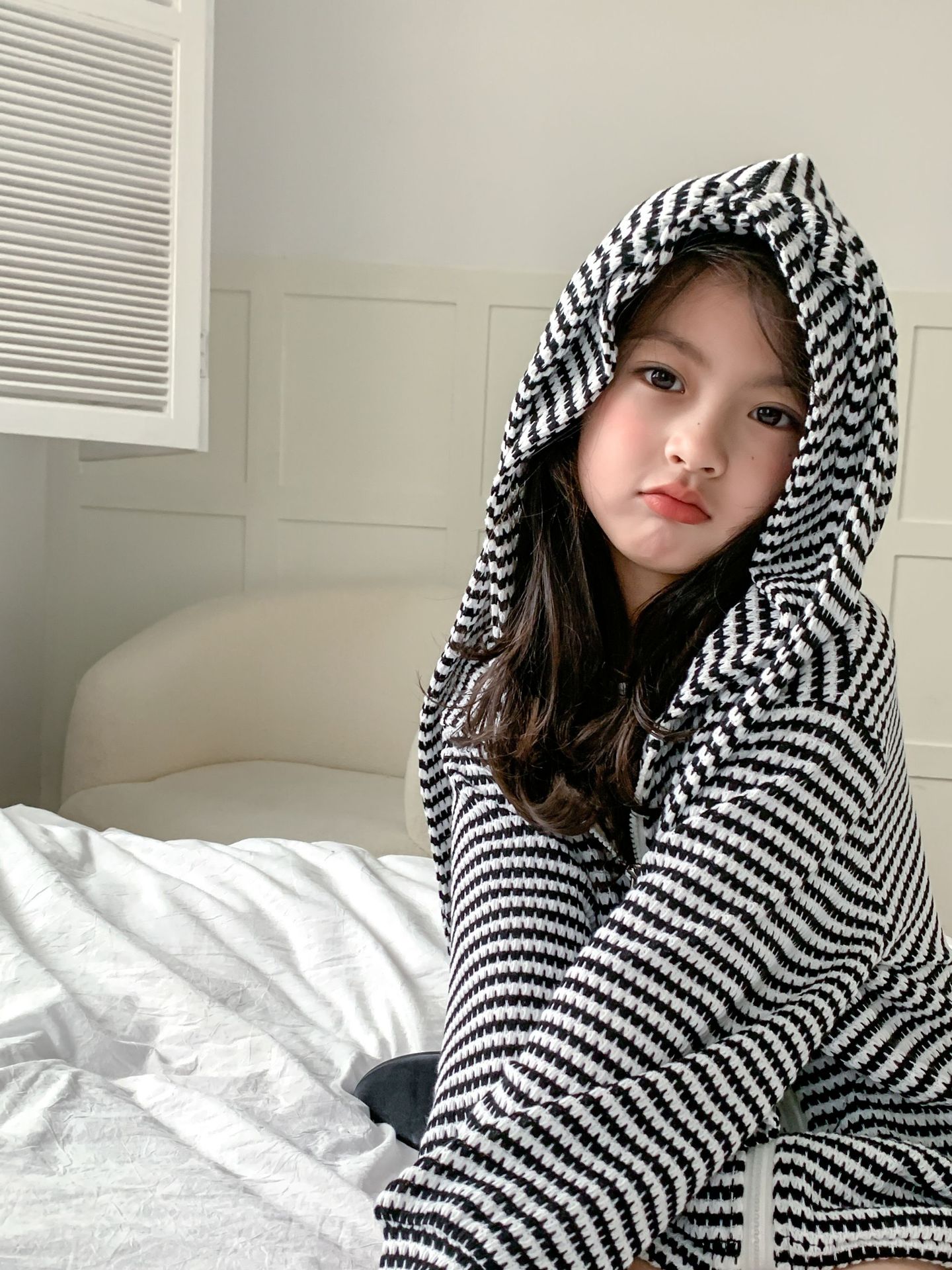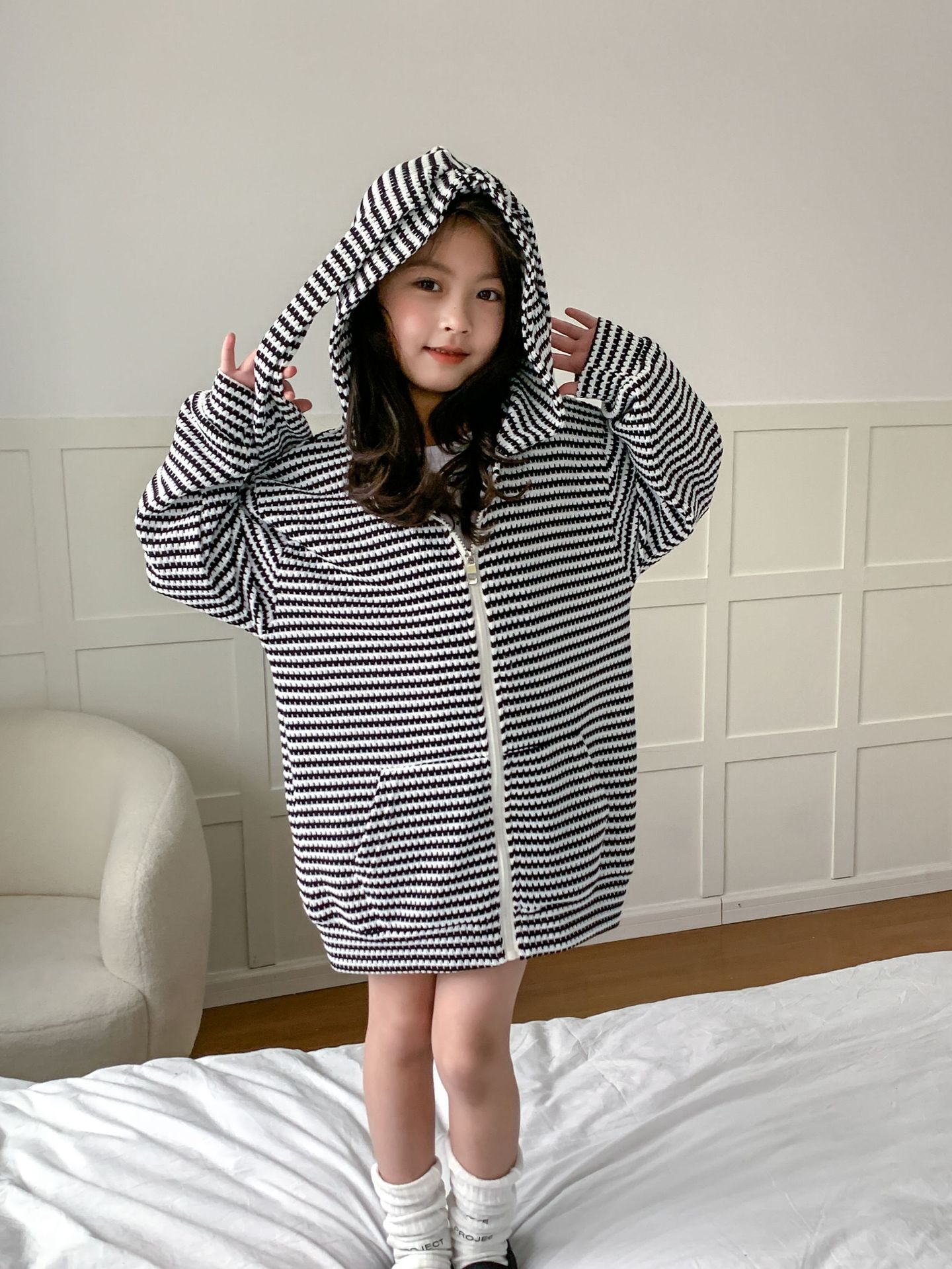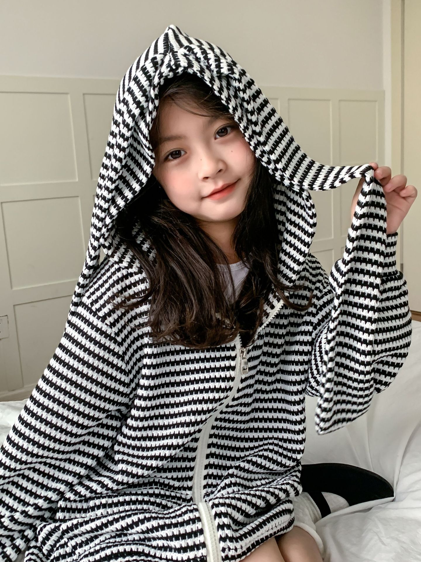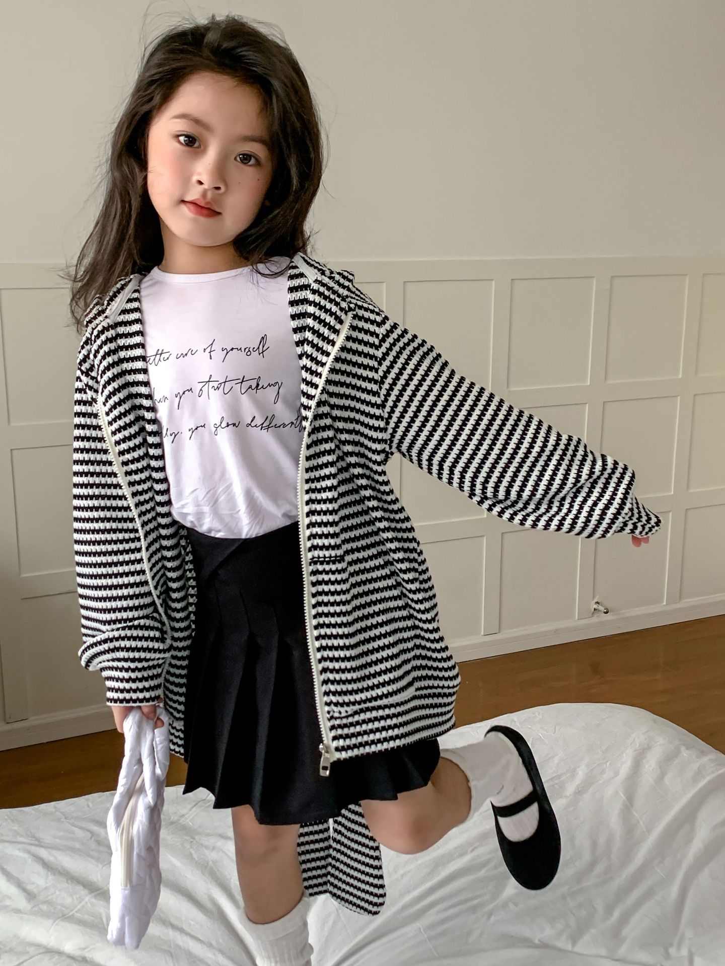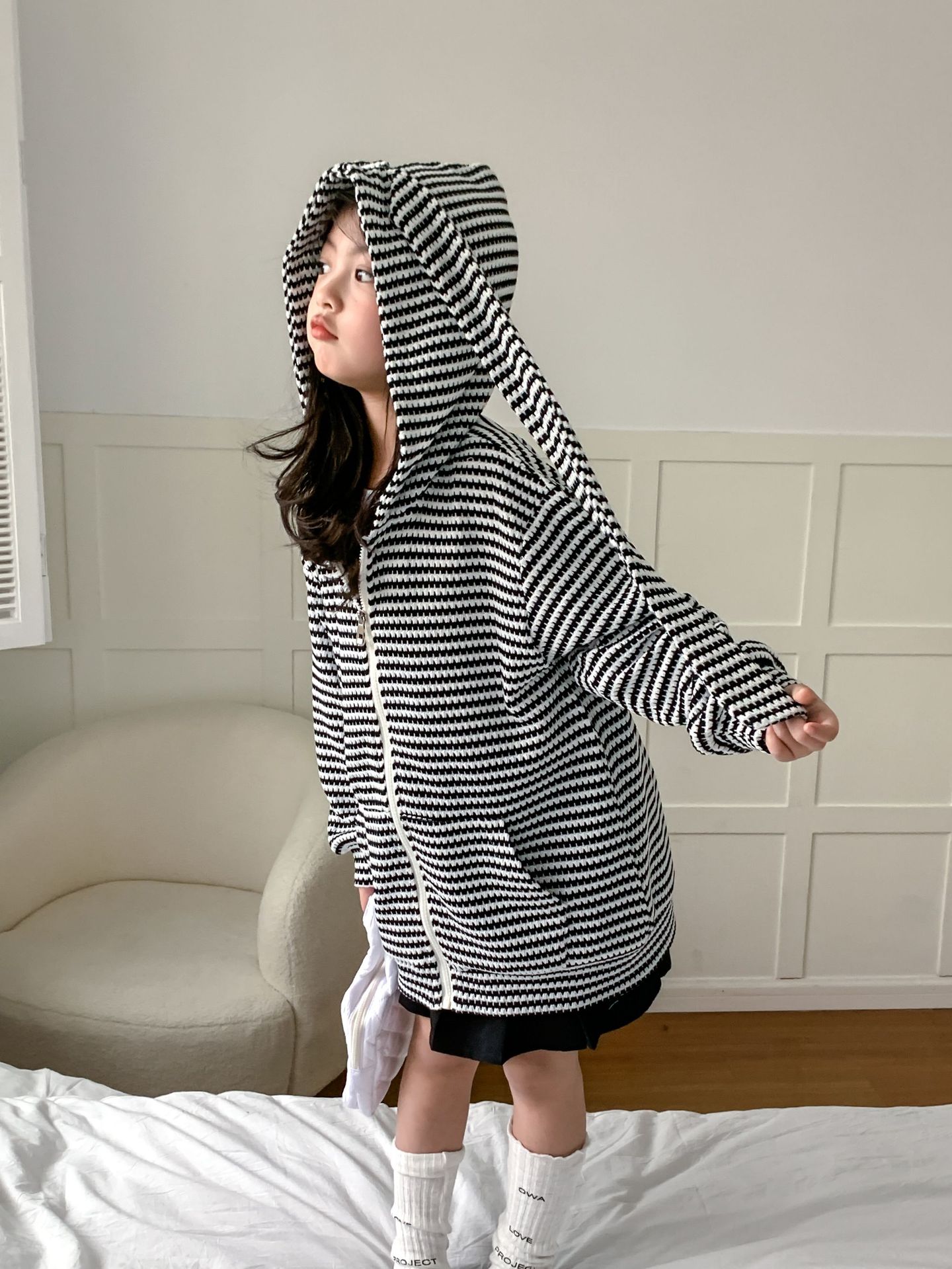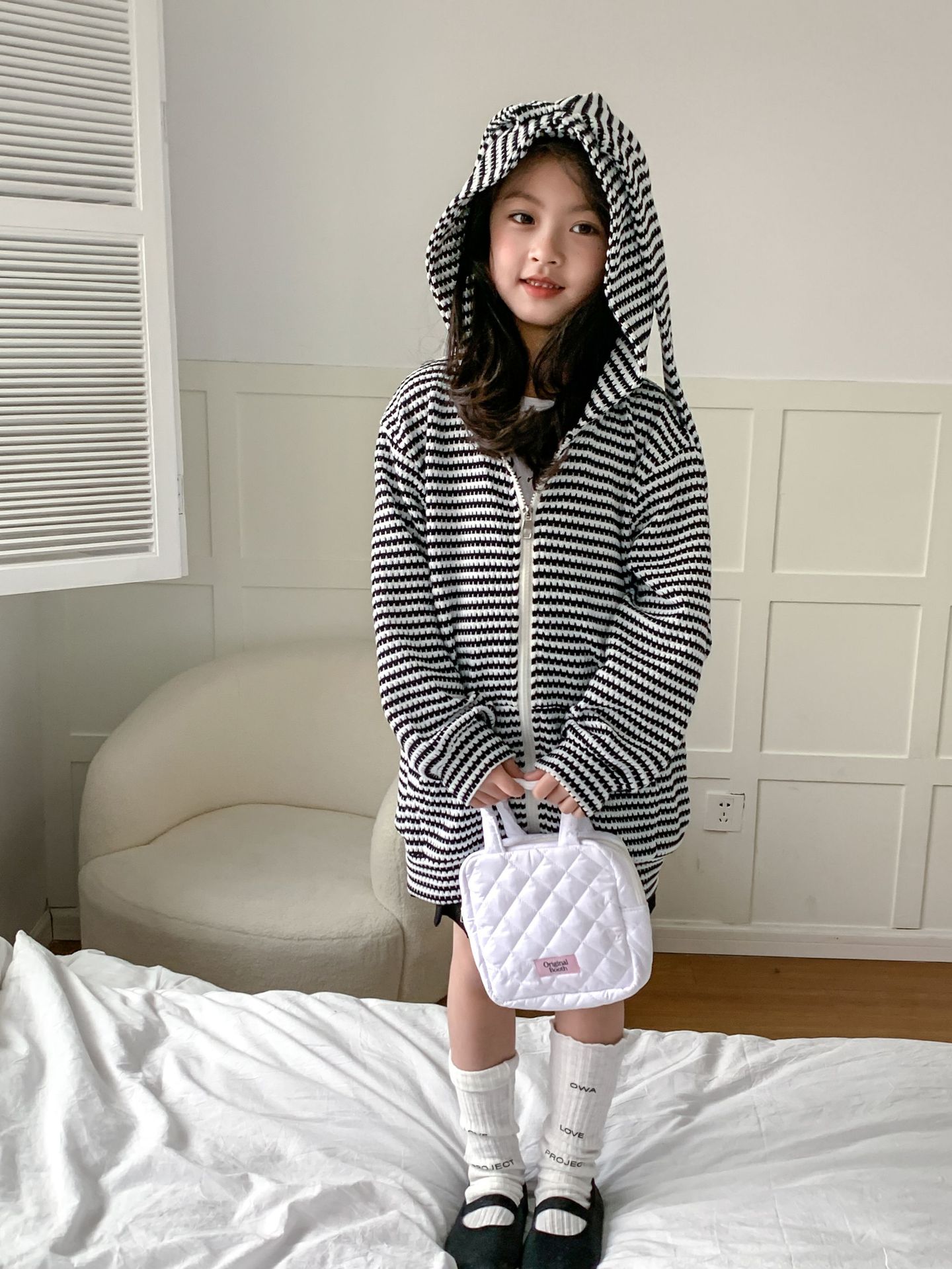 어린이 코트 2024 봄 소녀 줄무늬 토끼 귀 후드 코트 미디어와 큰 어린이 소녀의 트렌디 한 중간 길이 카디건스토어 가기
