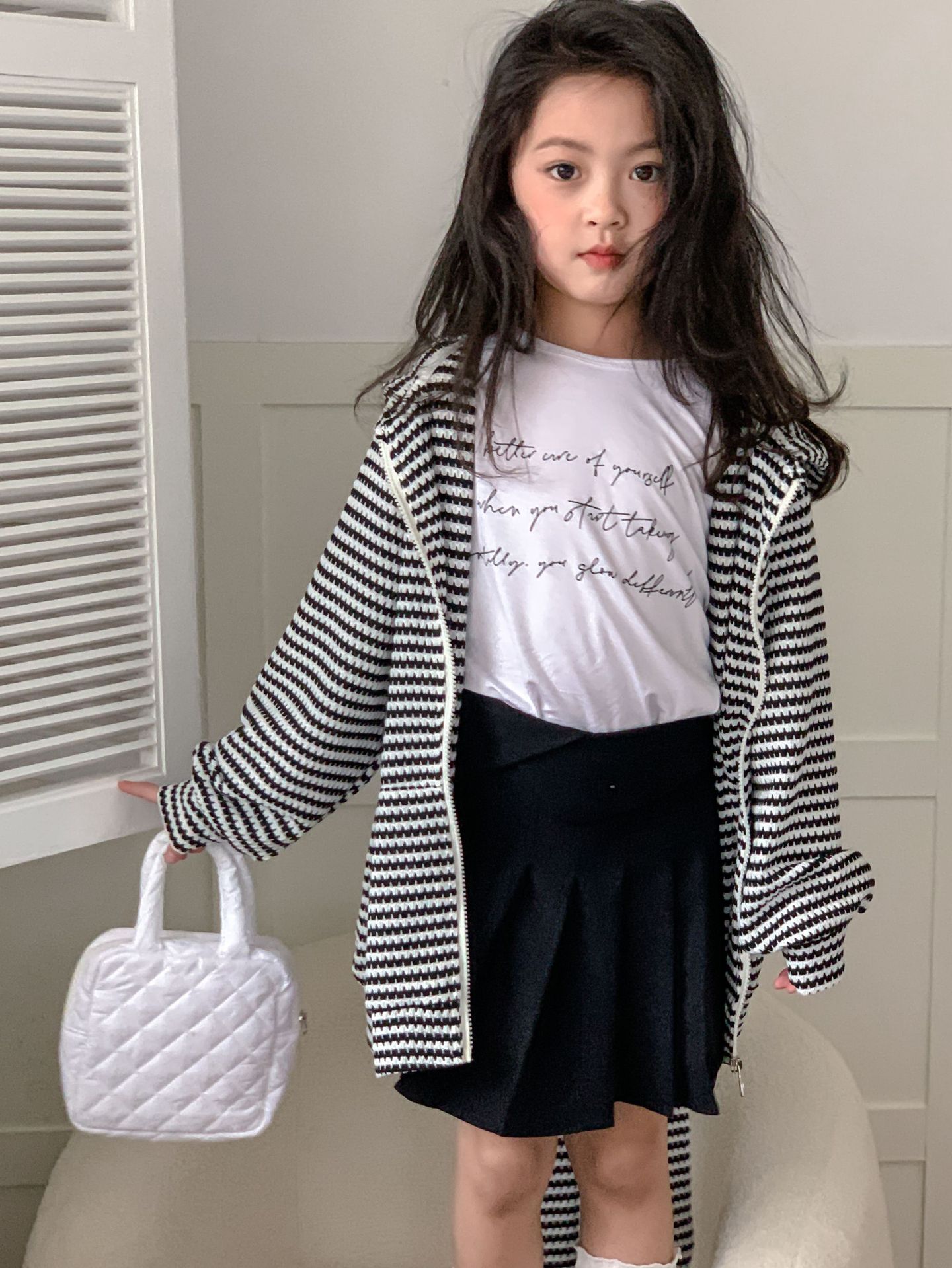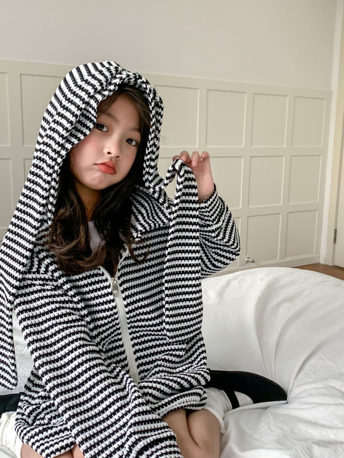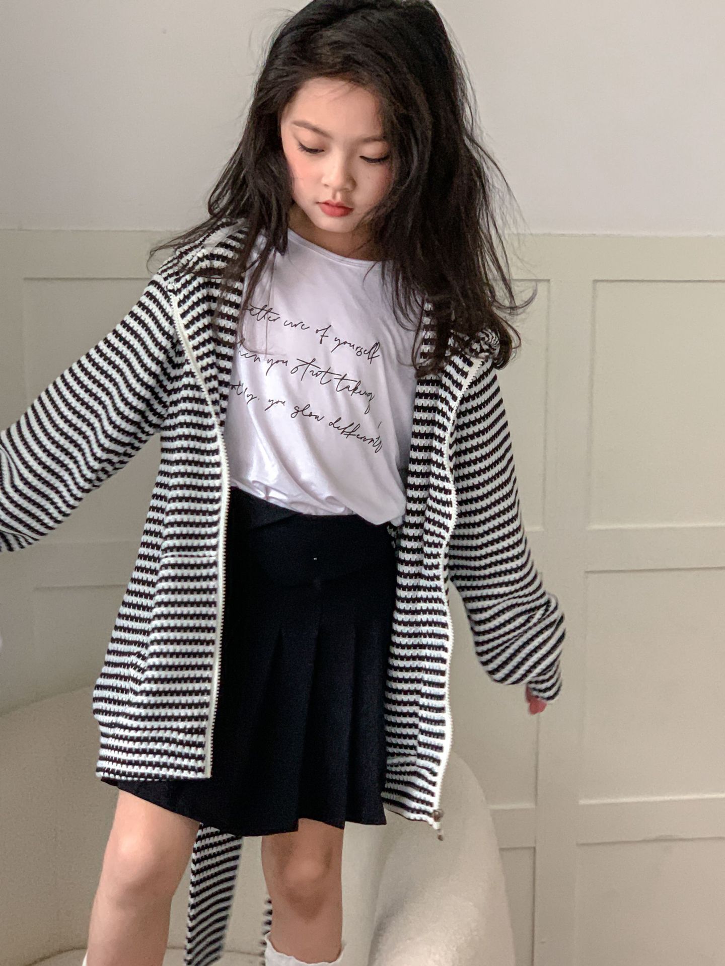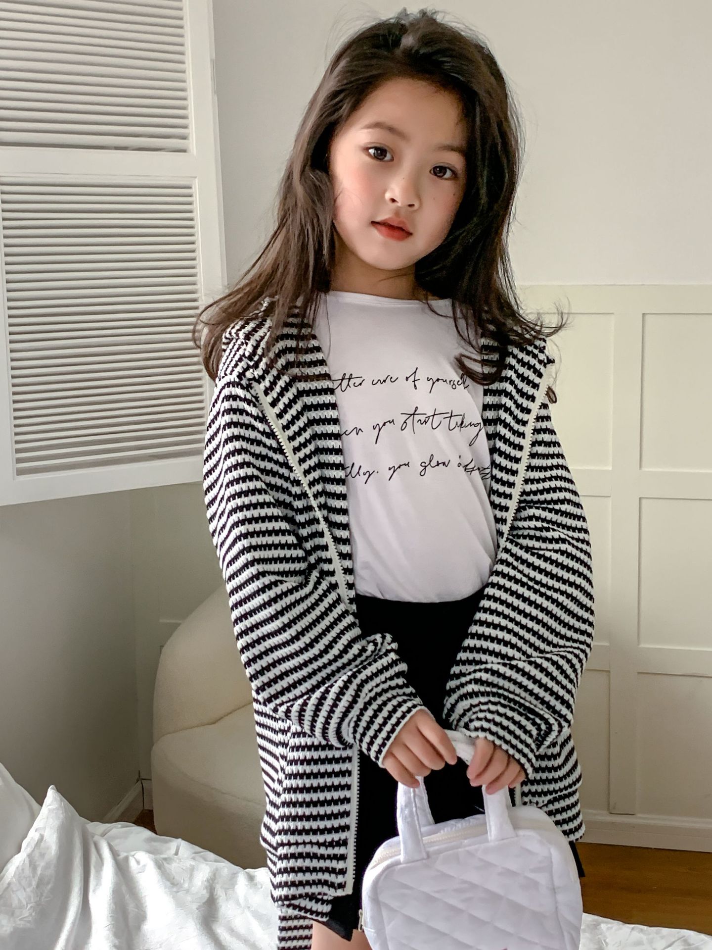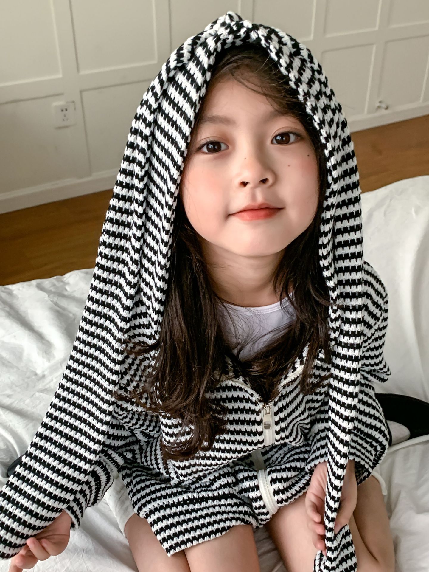 어린이 코트 2024 봄 소녀 줄무늬 토끼 귀 후드 코트 미디어와 큰 어린이 소녀의 트렌디 한 중간 길이 카디건스토어 가기