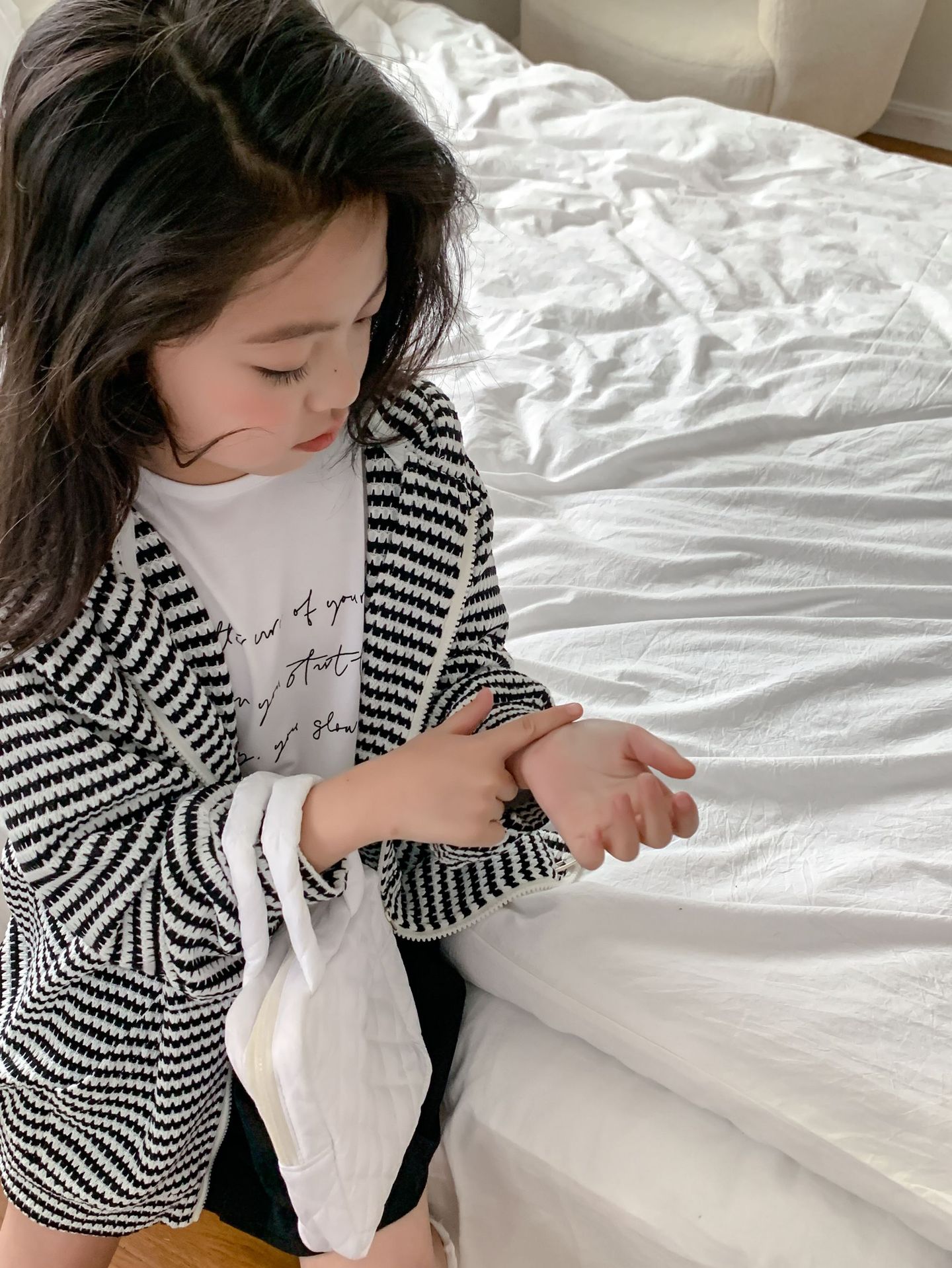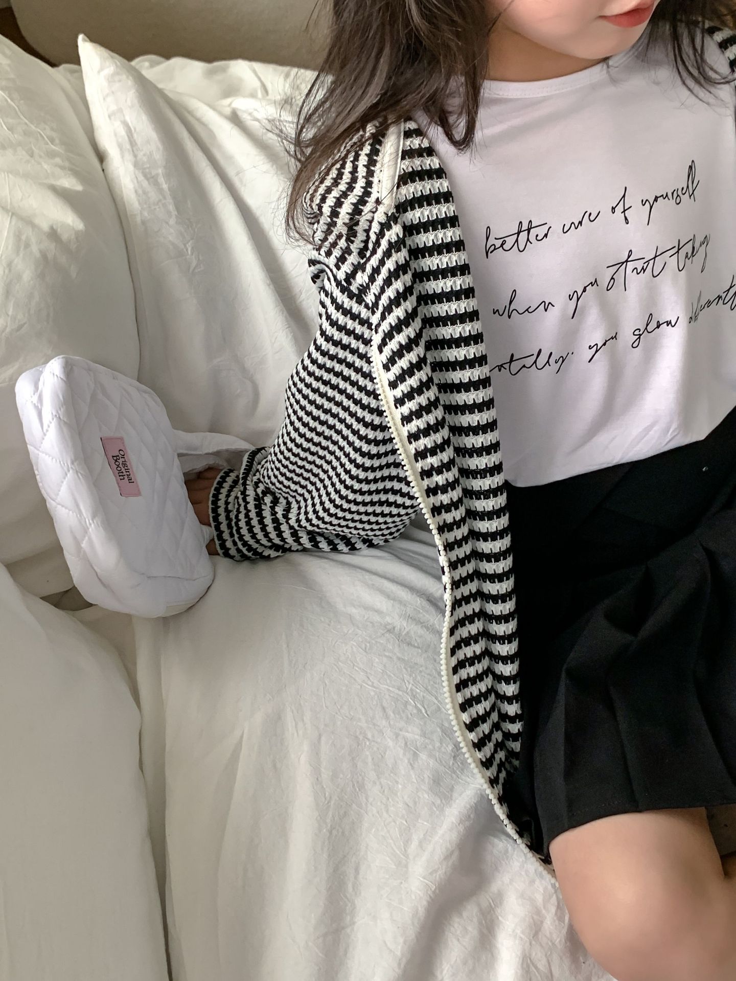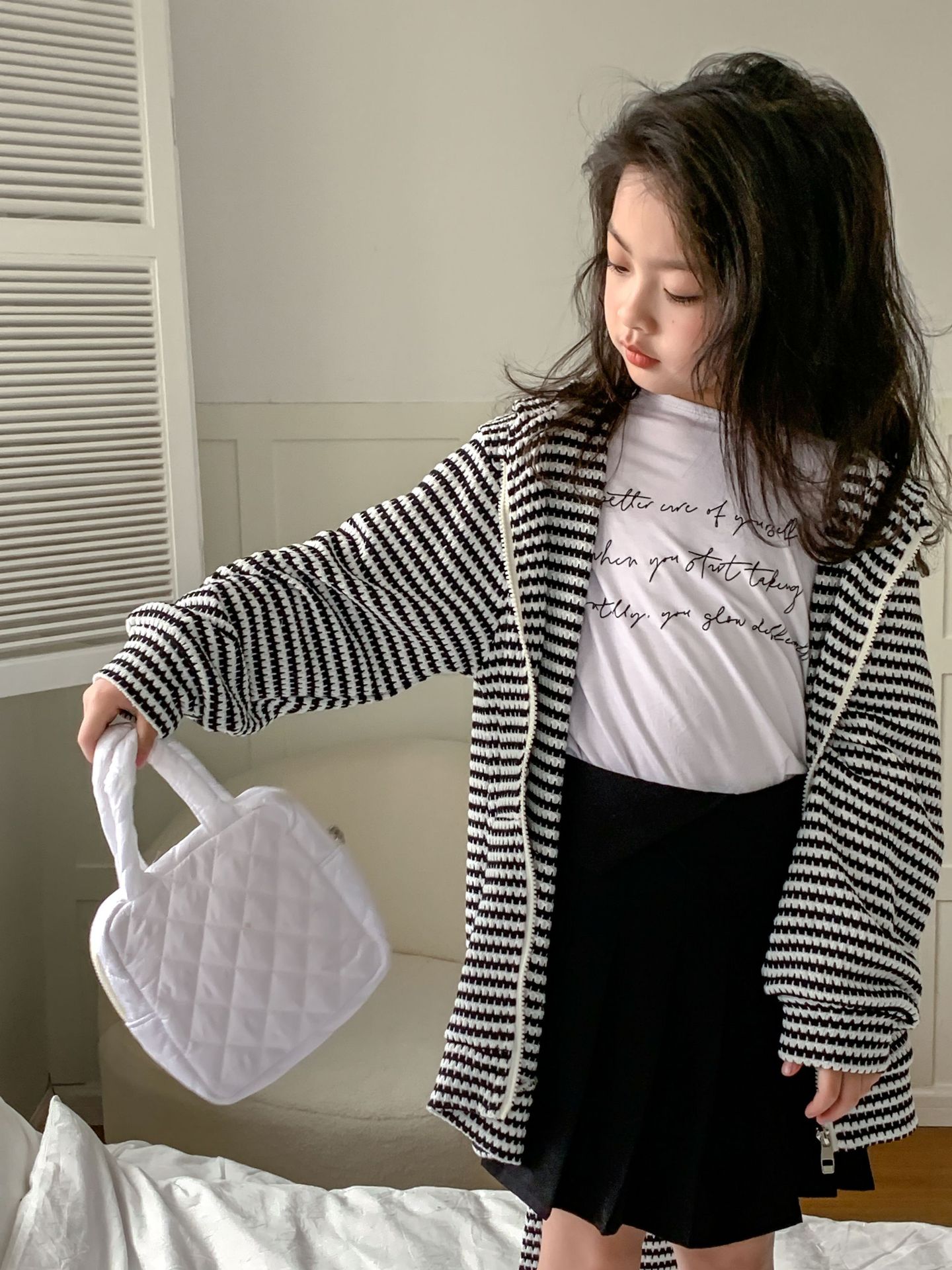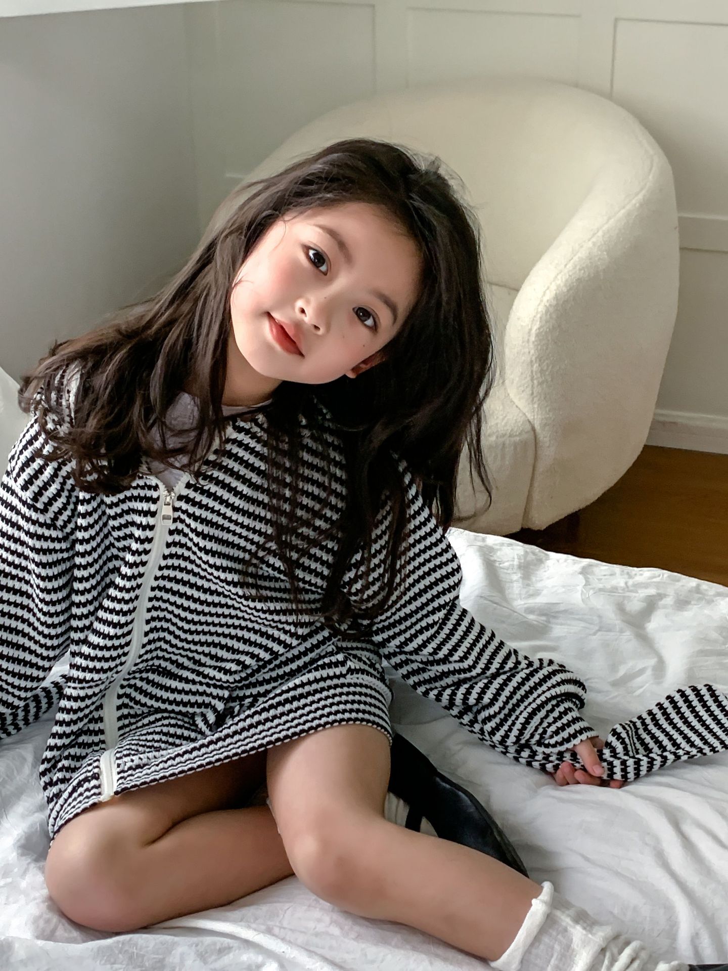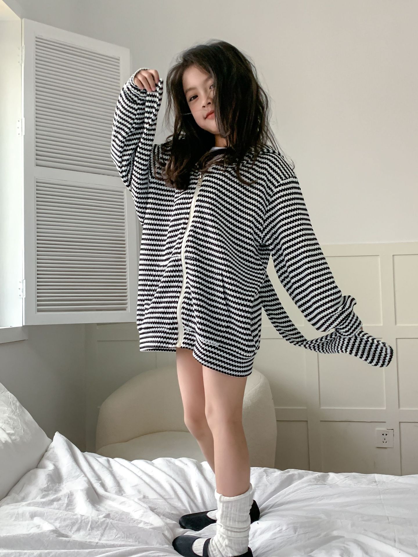 어린이 코트 2024 봄 소녀 줄무늬 토끼 귀 후드 코트 미디어와 큰 어린이 소녀의 트렌디 한 중간 길이 카디건스토어 가기
