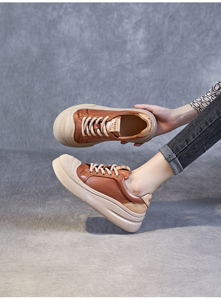 정품 가죽 플랫폼 비스킷 신발 2024 봄 새로운 라운드 토 머핀 싱글 레이어 신발 레이스 업 스포츠 경량 캐주얼 신발