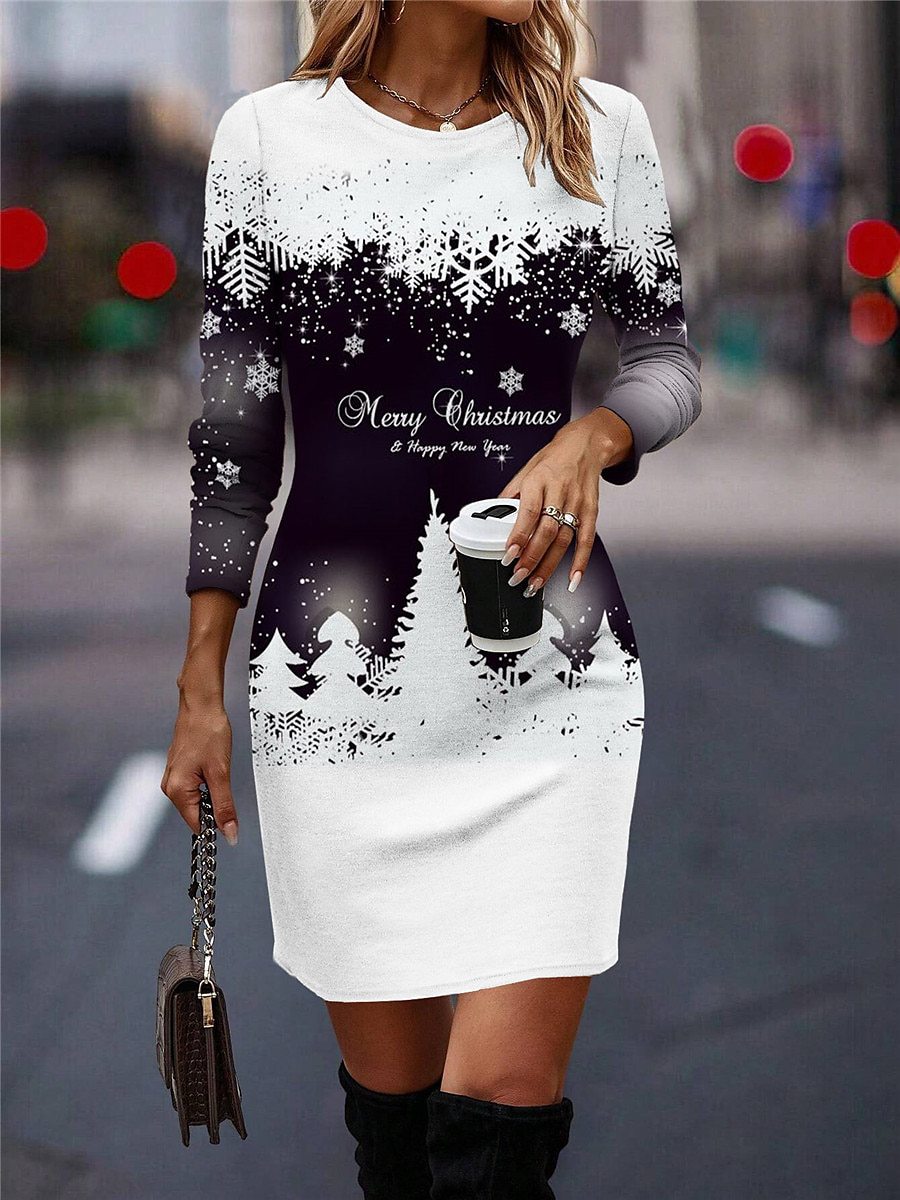 여성 크리스마스 원피스 활력 패션 야외 크리스마스 나들이 둥근 목 인쇄 크리스마스 트리 눈송이 느슨한 원피스