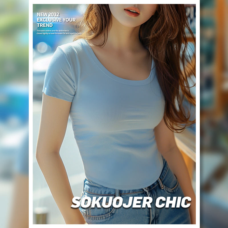 핫 걸스 아이스 실크 스레드 어깨 U 칼라 반팔 티셔츠 여성 여름 패션 올 매치 슬림 핏 슬리밍베이스 셔츠 고 탄성 탑스토어 가기