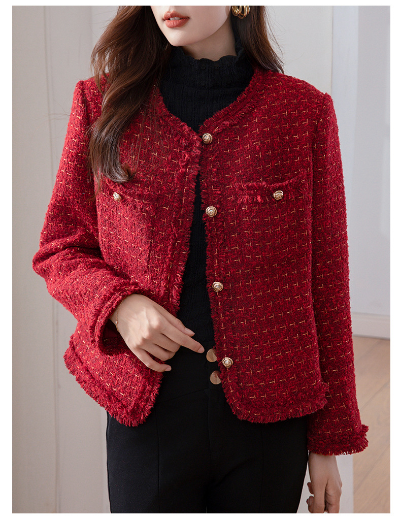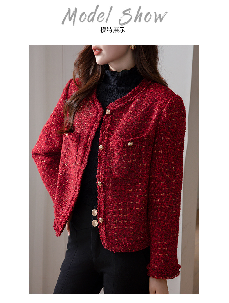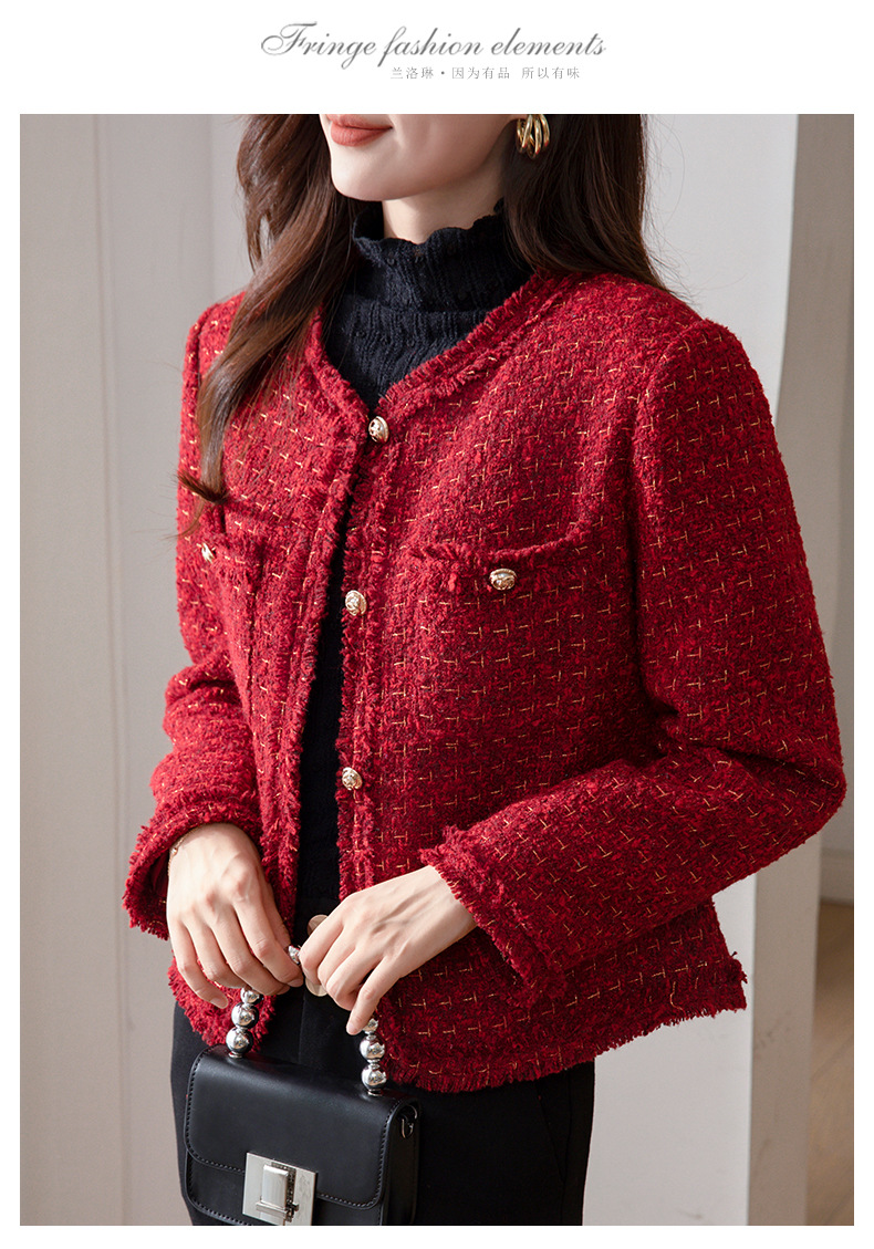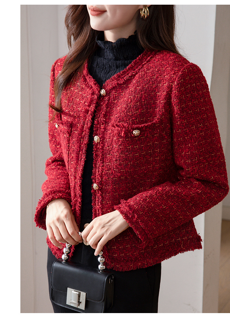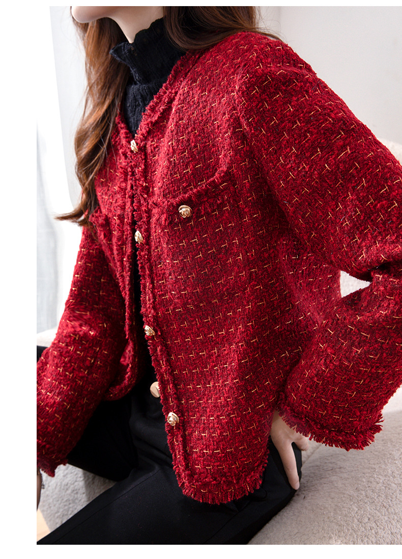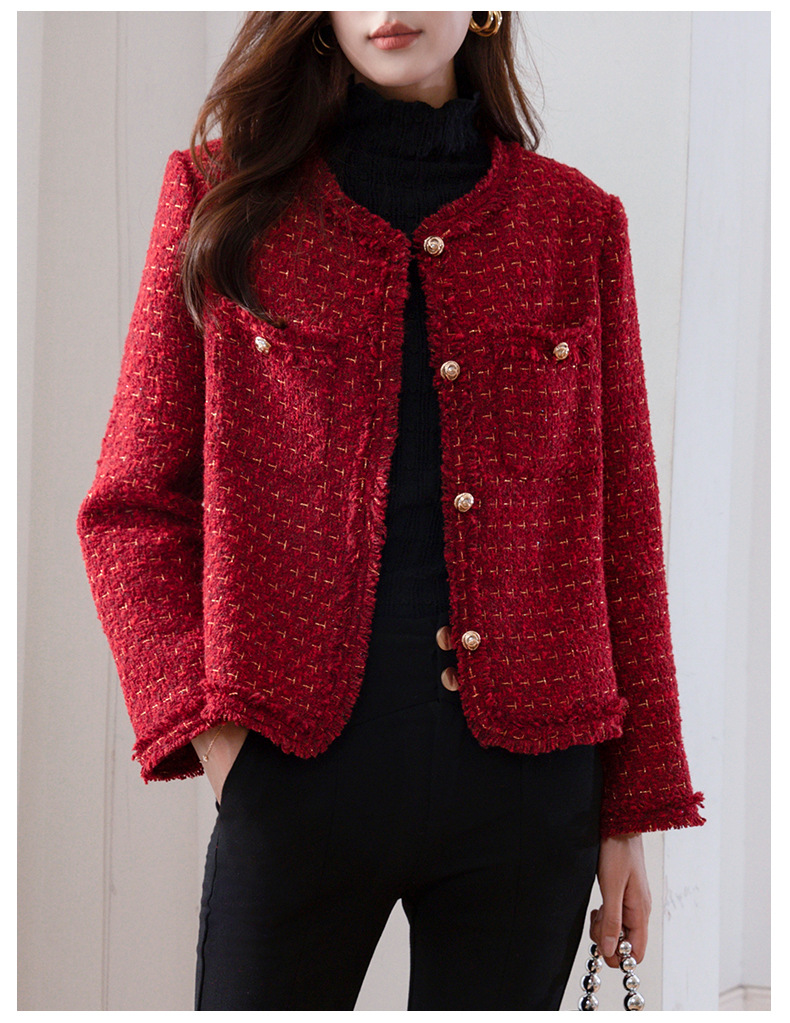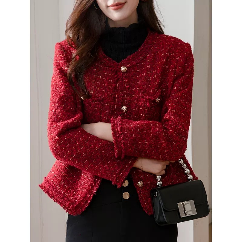 레드 하이 엔드 샤넬 스타일 모직 코트 여성의 가을과 겨울 2023 새로운 느슨한 슬리밍 프랑스 스타일 사교계 쇼트 탑