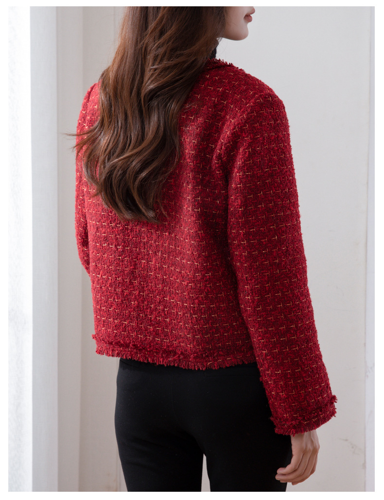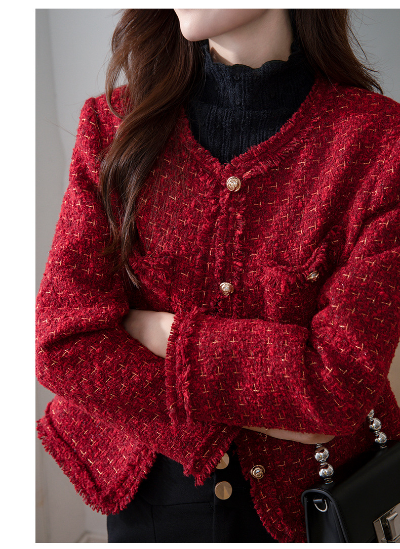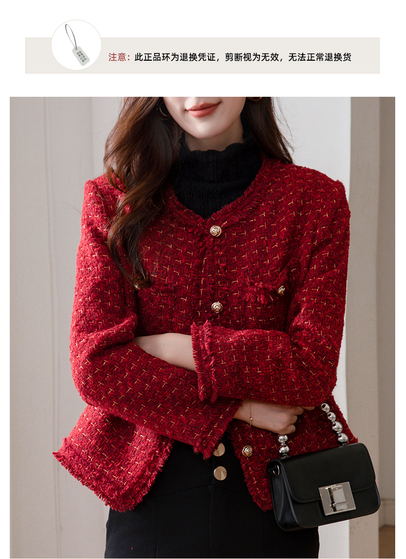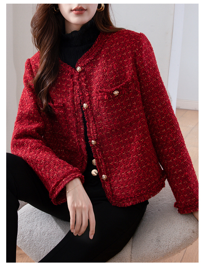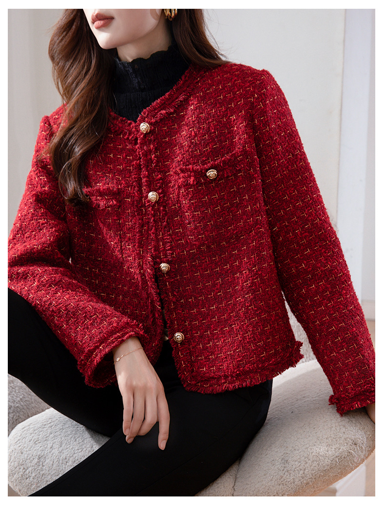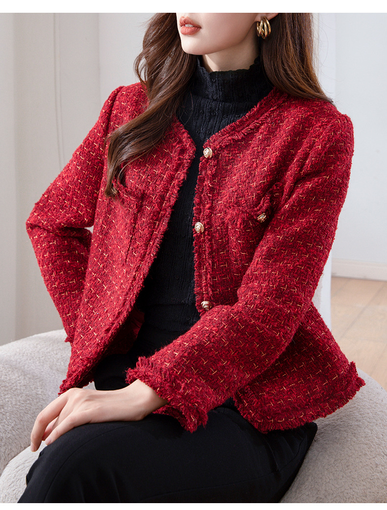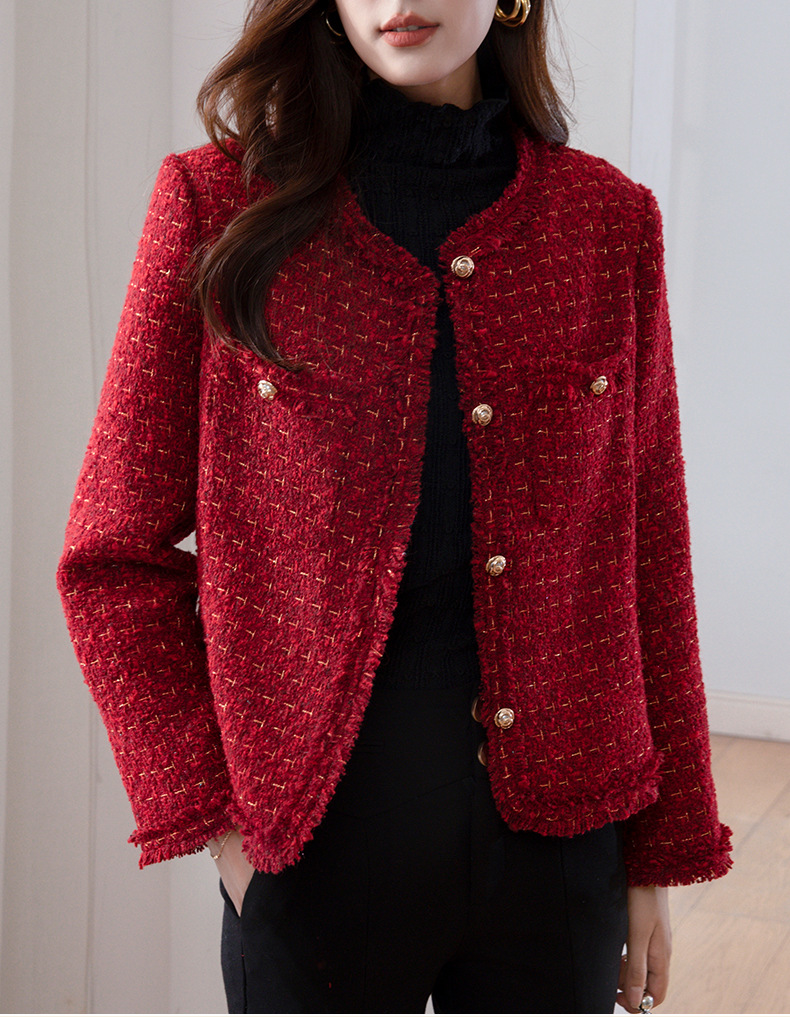 레드 하이 엔드 샤넬 스타일 모직 코트 여성의 가을과 겨울 2023 새로운 느슨한 슬리밍 프랑스 스타일 사교계 쇼트 탑