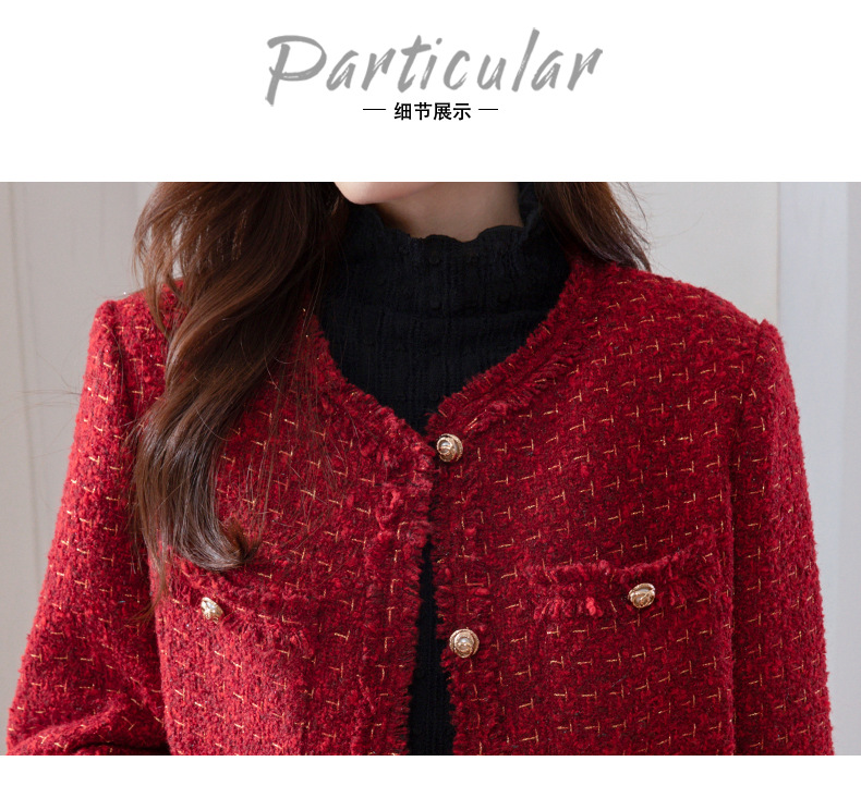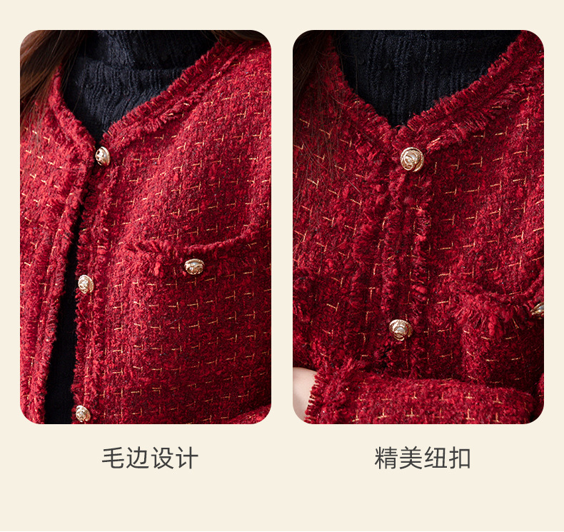 레드 하이 엔드 샤넬 스타일 모직 코트 여성의 가을과 겨울 2023 새로운 느슨한 슬리밍 프랑스 스타일 사교계 쇼트 탑스토어 가기