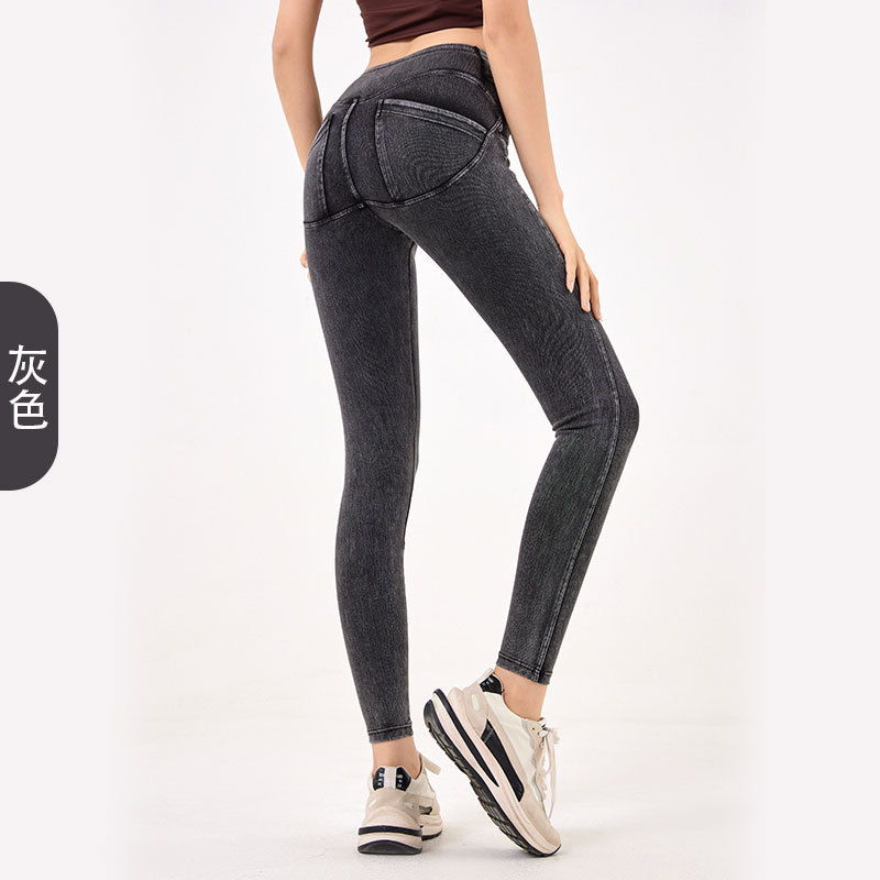 울트라 하이 허리 유럽과 미국의 배꼽 계약 피트니스 바지 여성용 타이트한 데님 스트레치 포켓 러닝 스포츠 슬리밍 엉덩이 리프팅 요가 바지