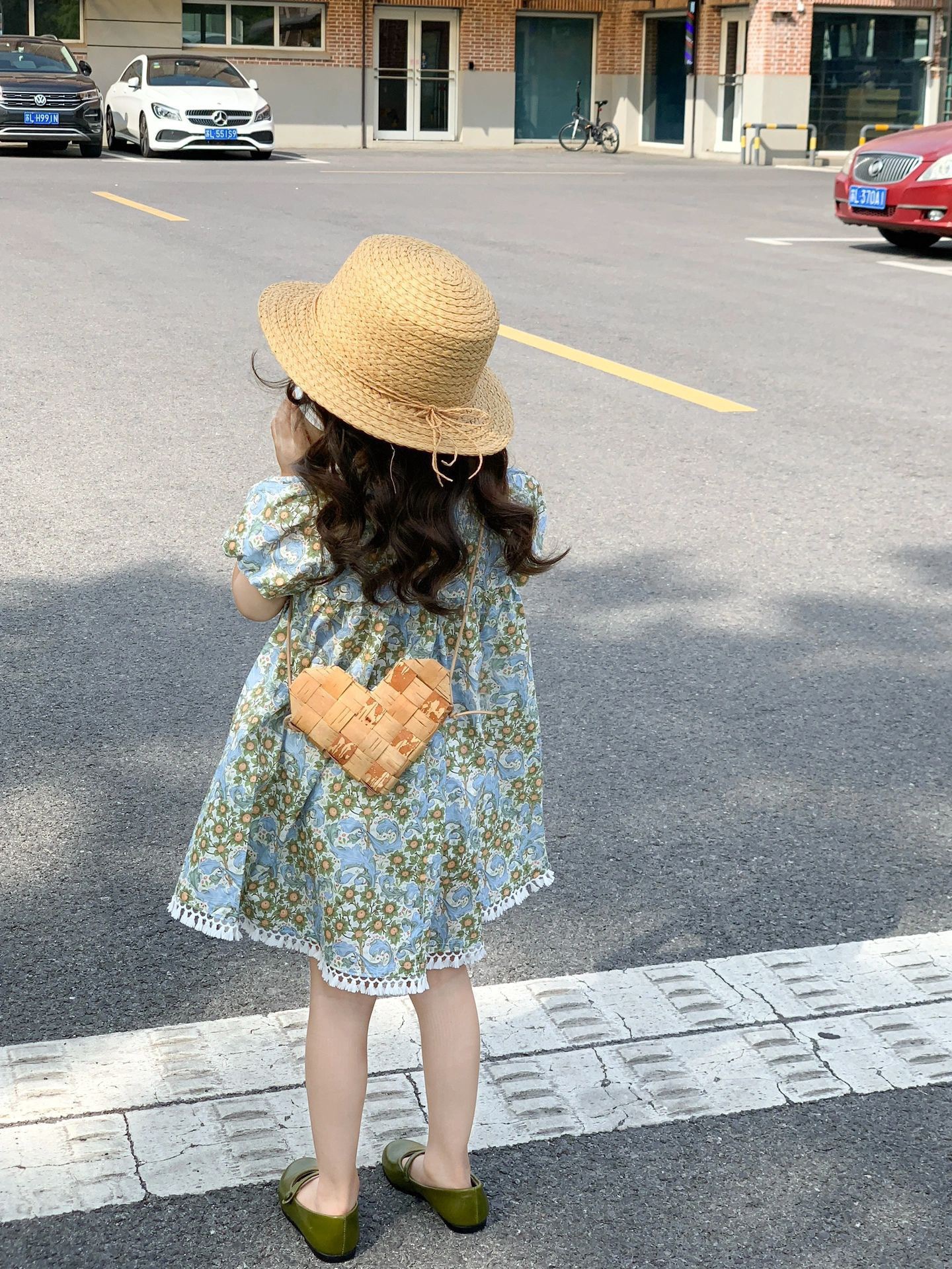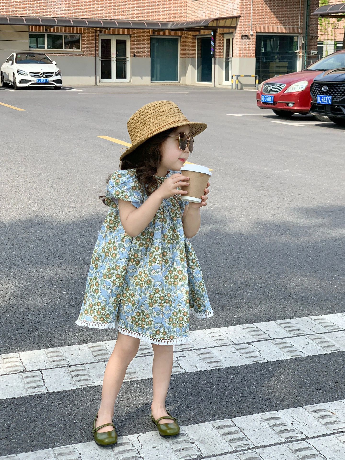 한국식 아동복 소녀 여름 블루 플로럴 스커트 프랑스 스타일 달콤한 공주 원피스 퍼프 소매 원피스스토어 가기