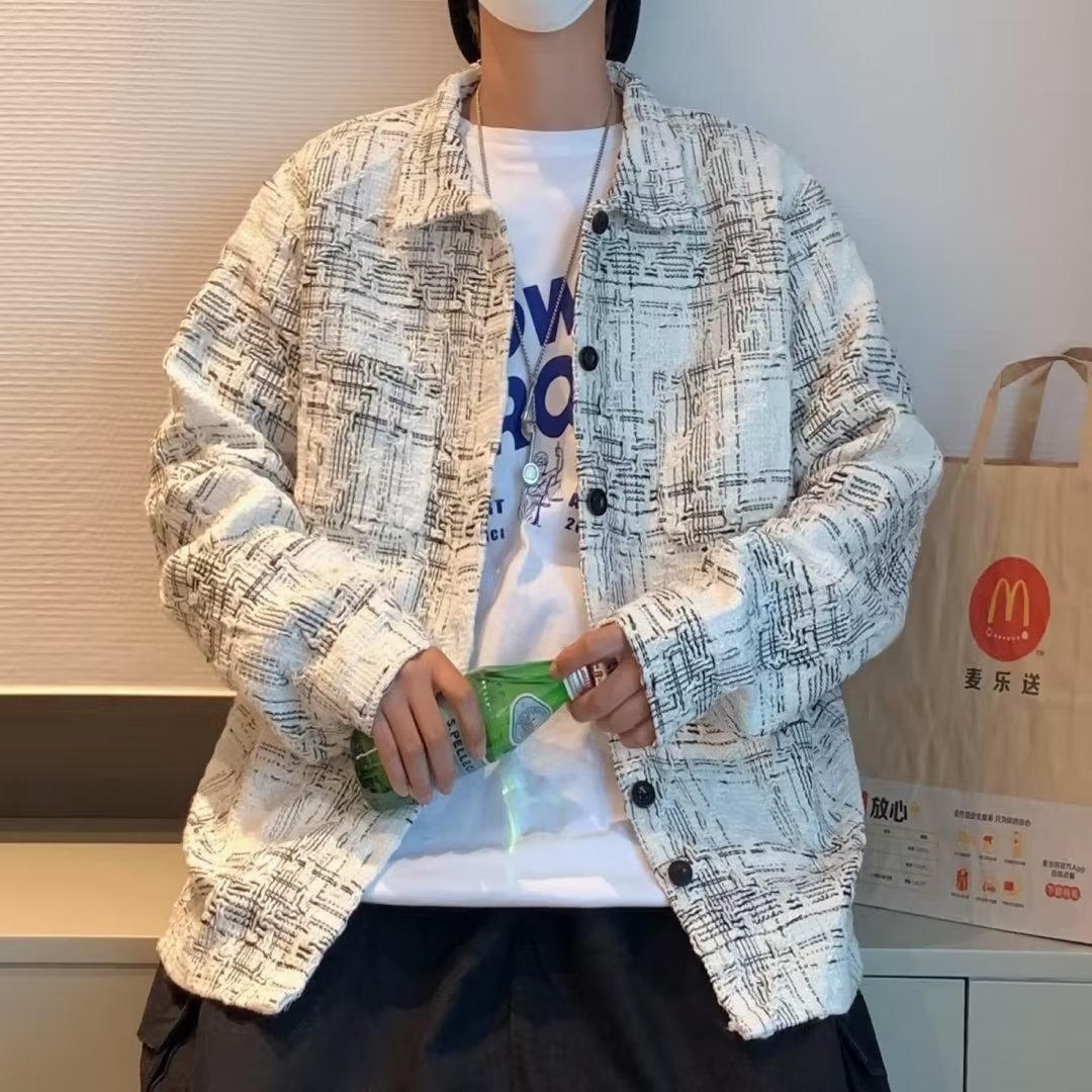샤넬 스타일 자켓 남자의 봄과 가을 느슨한 잘 생긴 유행 브랜드 격자 무늬 재킷 Ins 유행 홍콩 스타일 캐주얼 옷깃 탑스토어 가기
