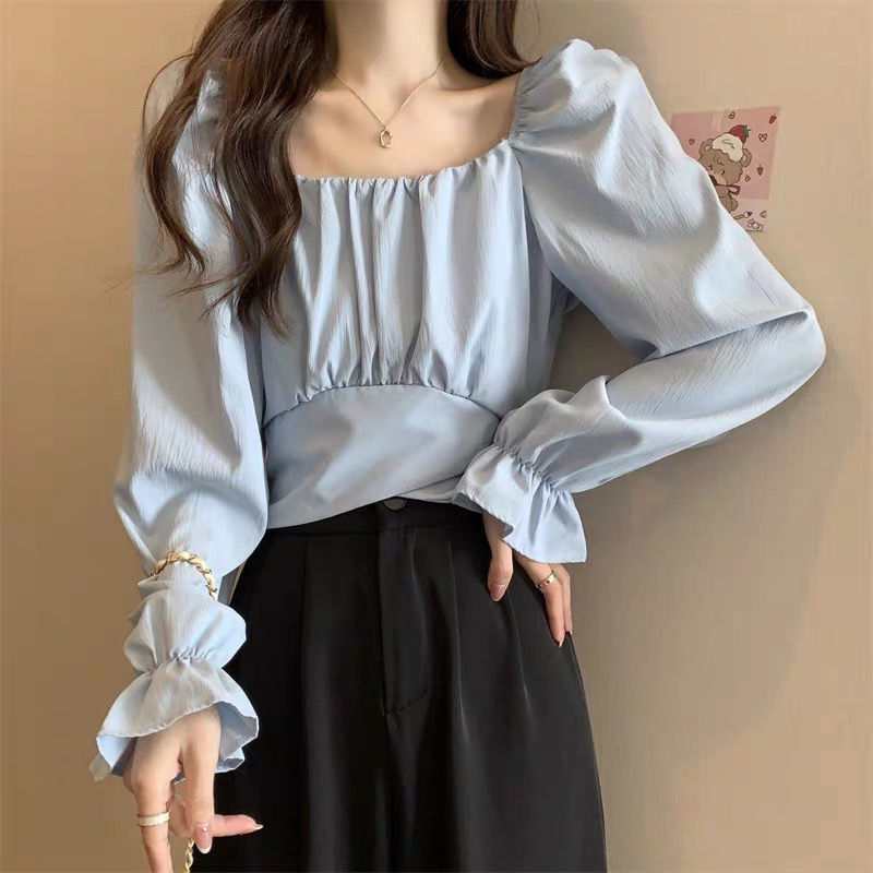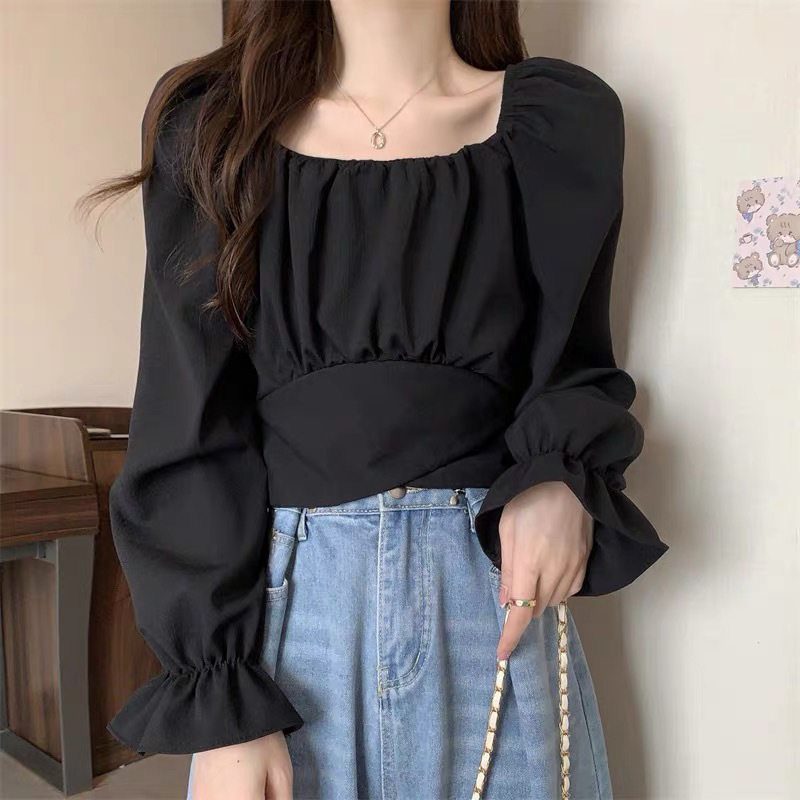 봄 2024 프랑스 스타일 쇄골 사각 칼라 퍼프 소매 셔츠 여성의 세련된 독특한 세련된 짧은 레이스 업 쉬폰 탑