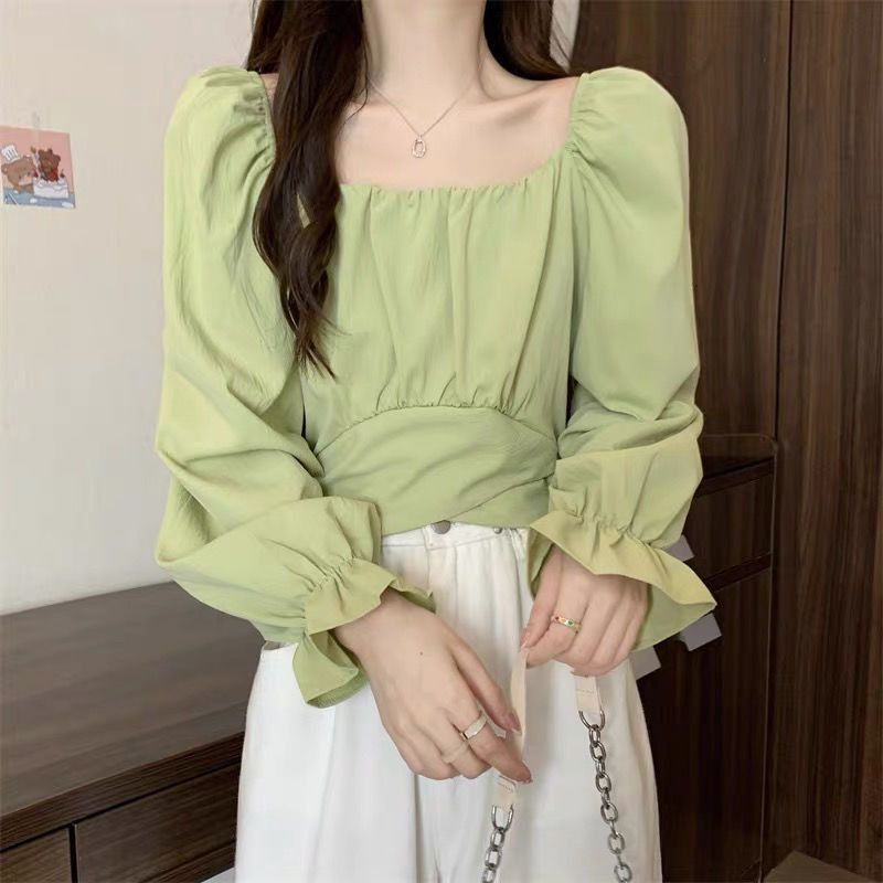 봄 2024 프랑스 스타일 쇄골 사각 칼라 퍼프 소매 셔츠 여성의 세련된 독특한 세련된 짧은 레이스 업 쉬폰 탑스토어 가기