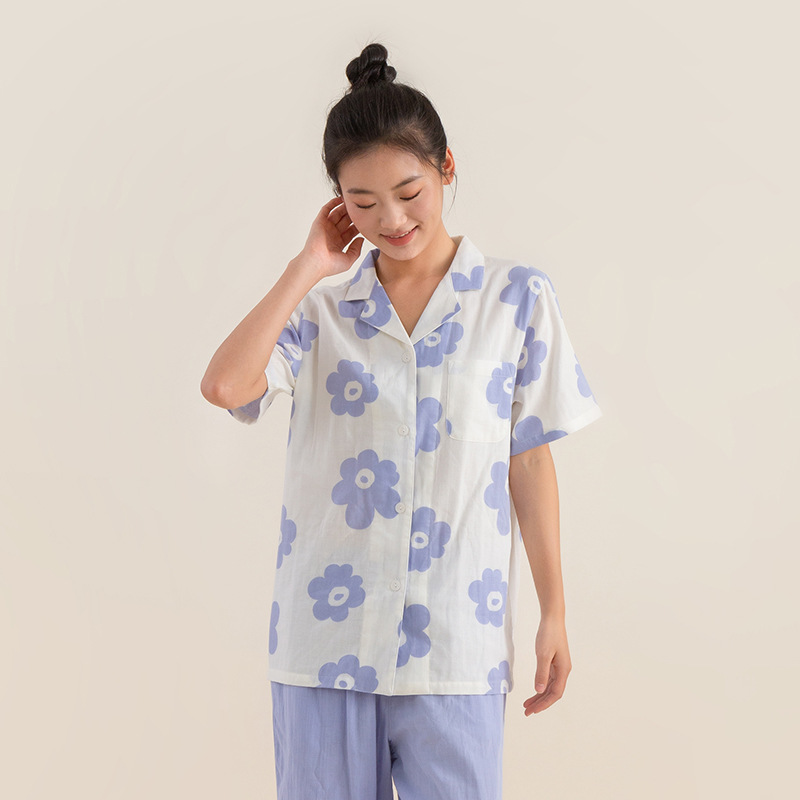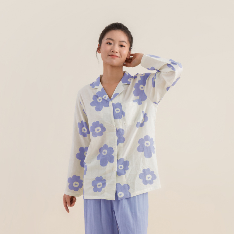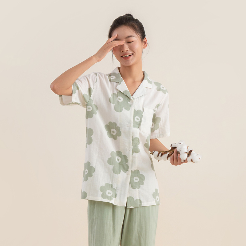 잠옷 여성면 긴팔 더블 레이어 거즈 코튼 여성의 봄과 가을 컬러 매칭 큰 꽃 여름 반팔 잠옷 세트스토어 가기