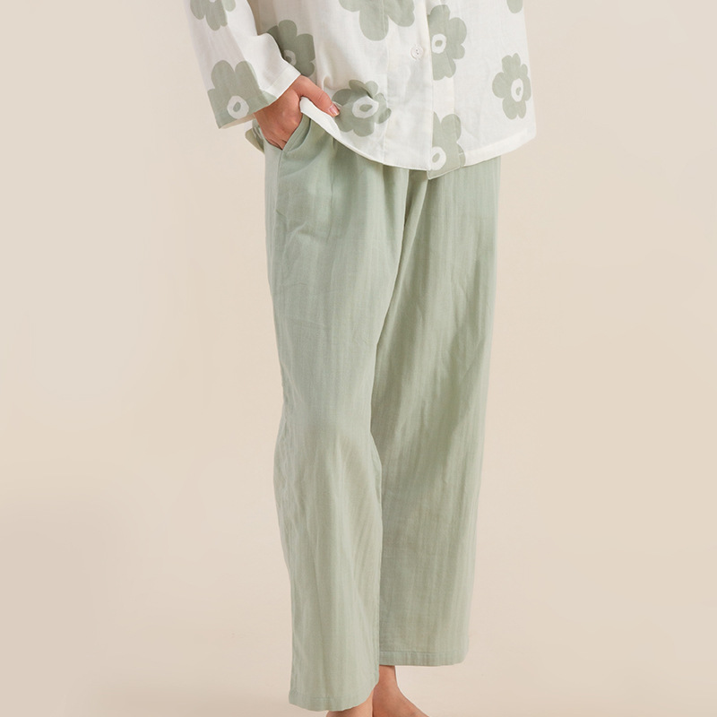 잠옷 여성면 긴팔 더블 레이어 거즈 코튼 여성의 봄과 가을 컬러 매칭 큰 꽃 여름 반팔 잠옷 세트