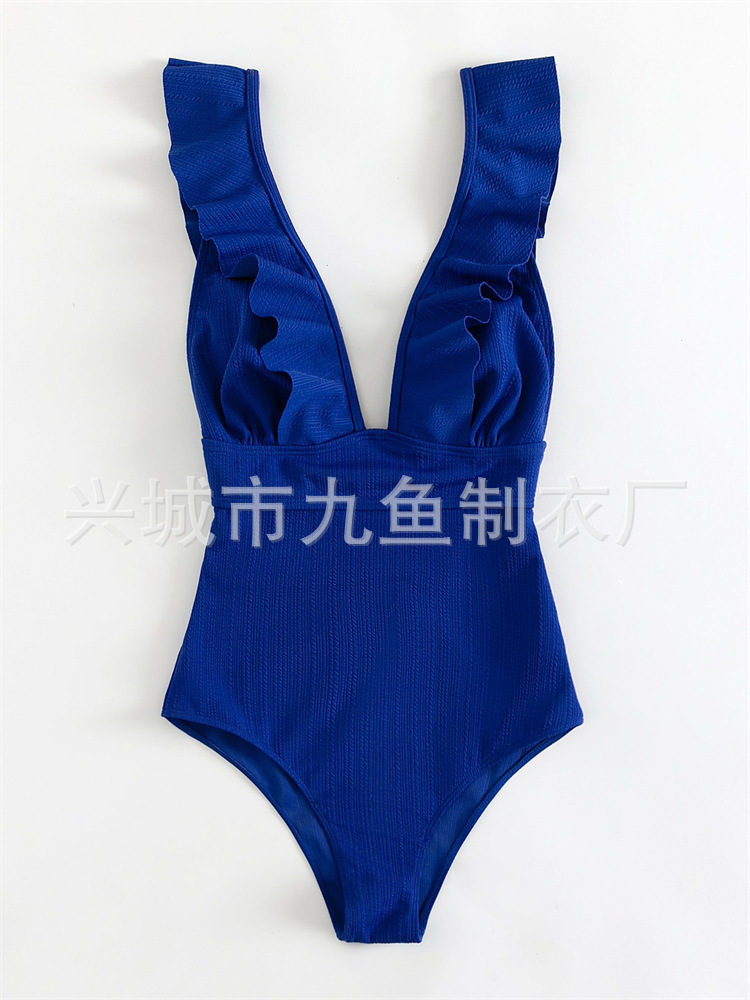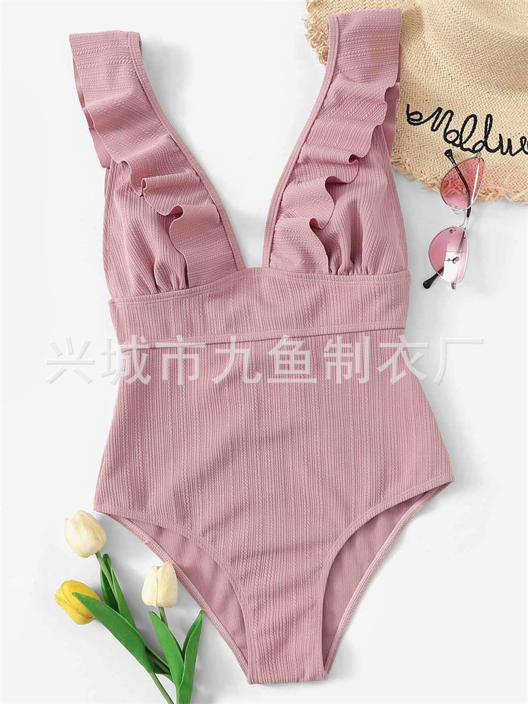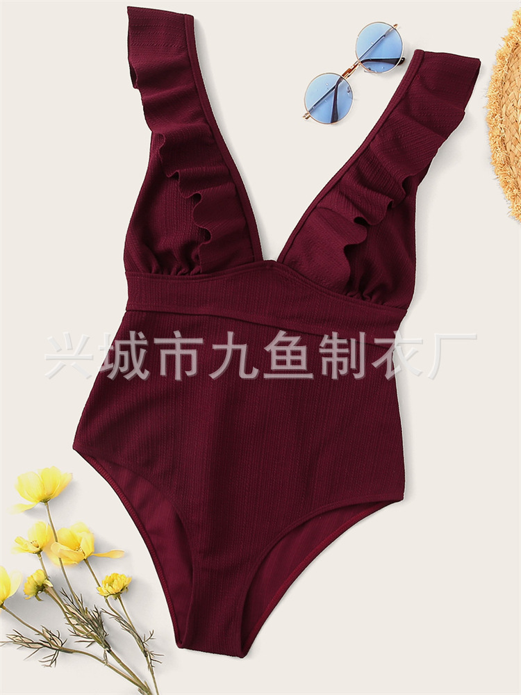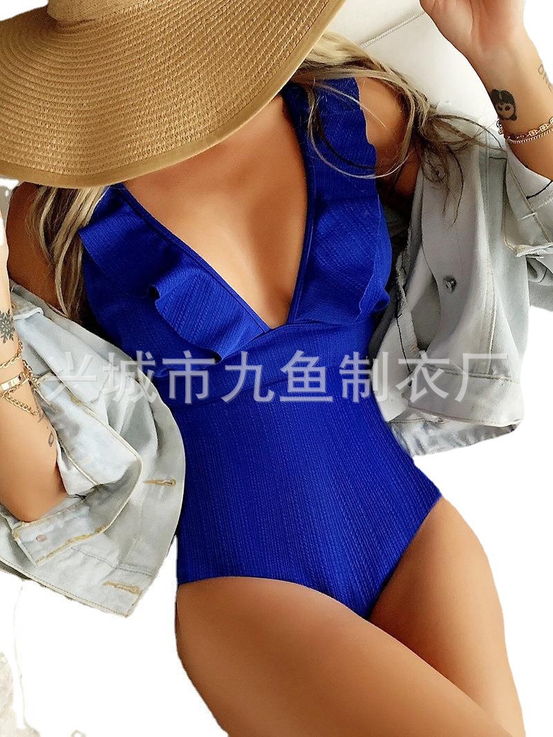 2024 유럽과 미국의 새로운 단색 원피스 수영복 여성의 섹시한 러프 드 딥 V 스트링 비키니 대외 무역 비키니