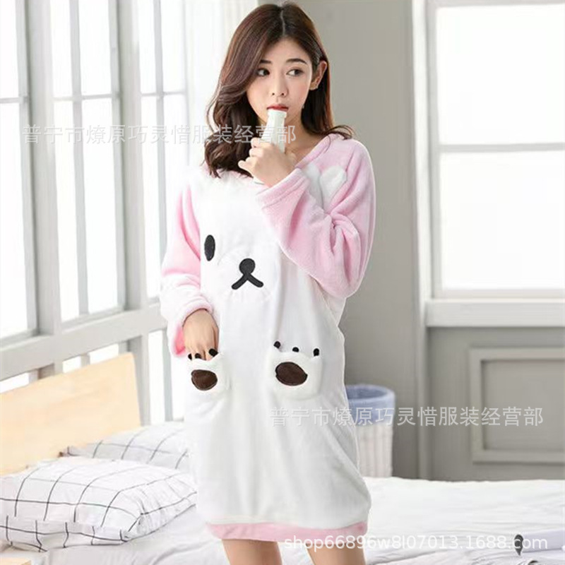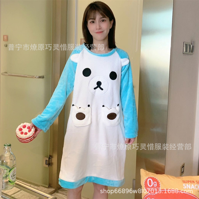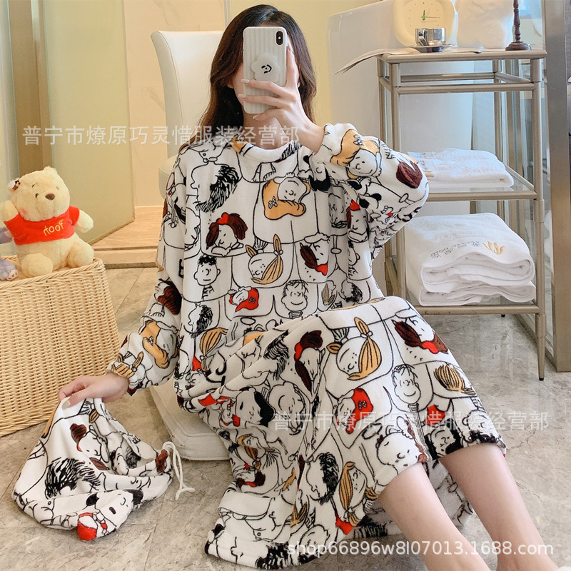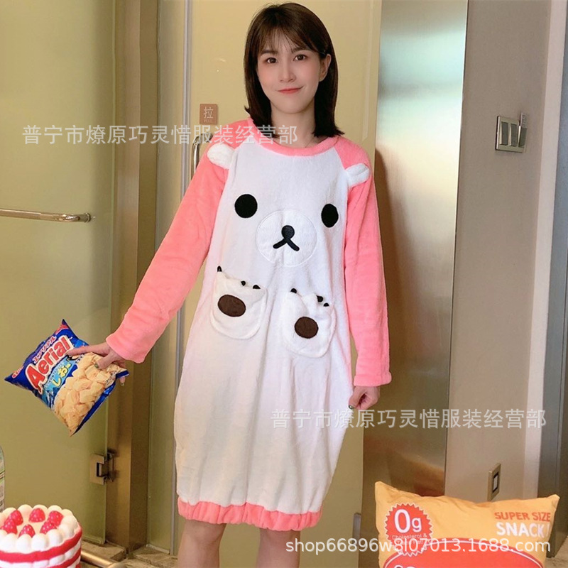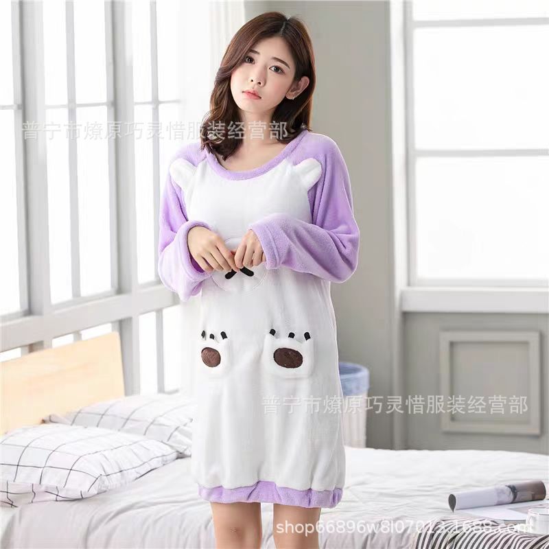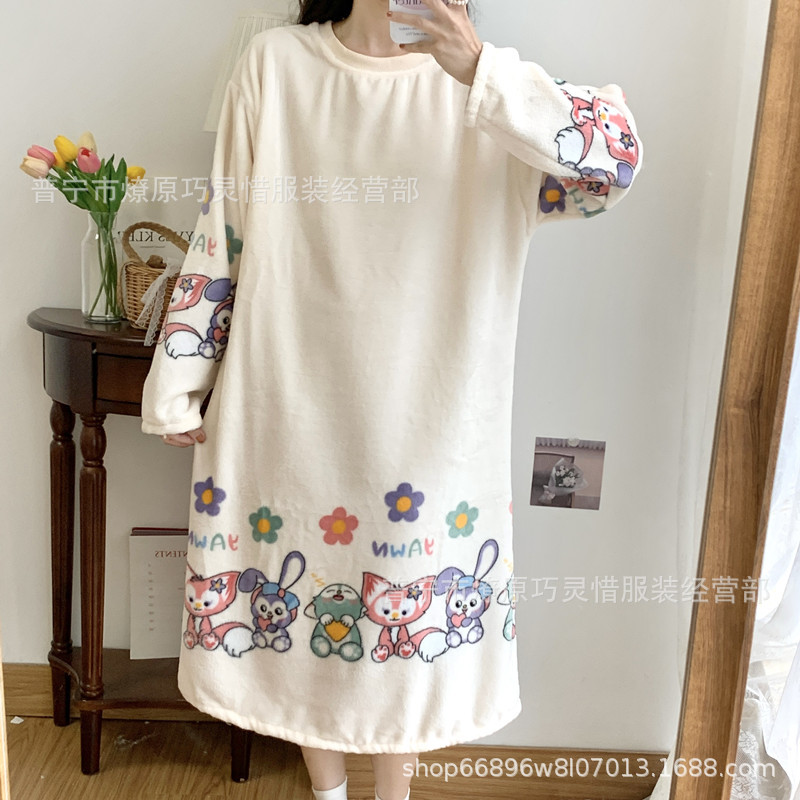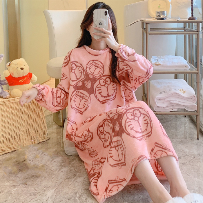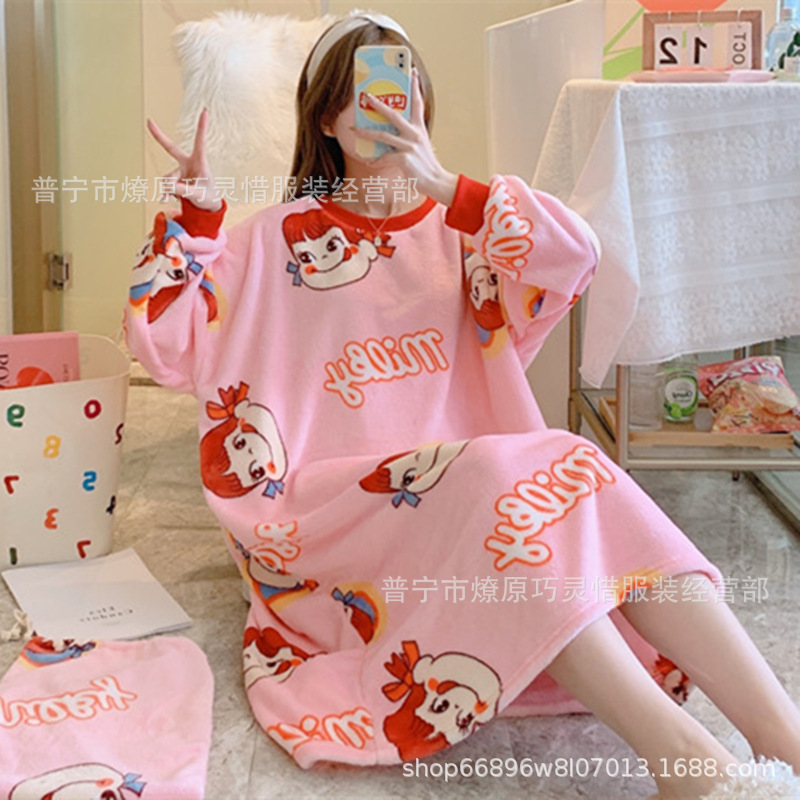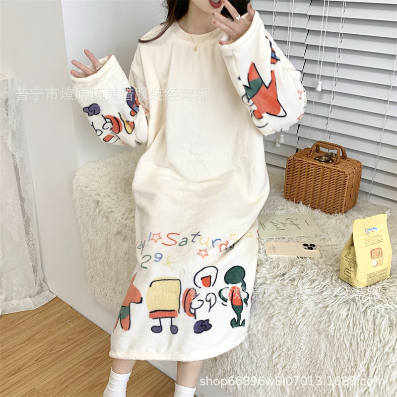나이트 드레스 여성의 가을과 겨울 플란넬 귀여운 만화 2023 새로운 산호 양털 두꺼운 따뜻한 원피스 홈 웨어스토어 가기
