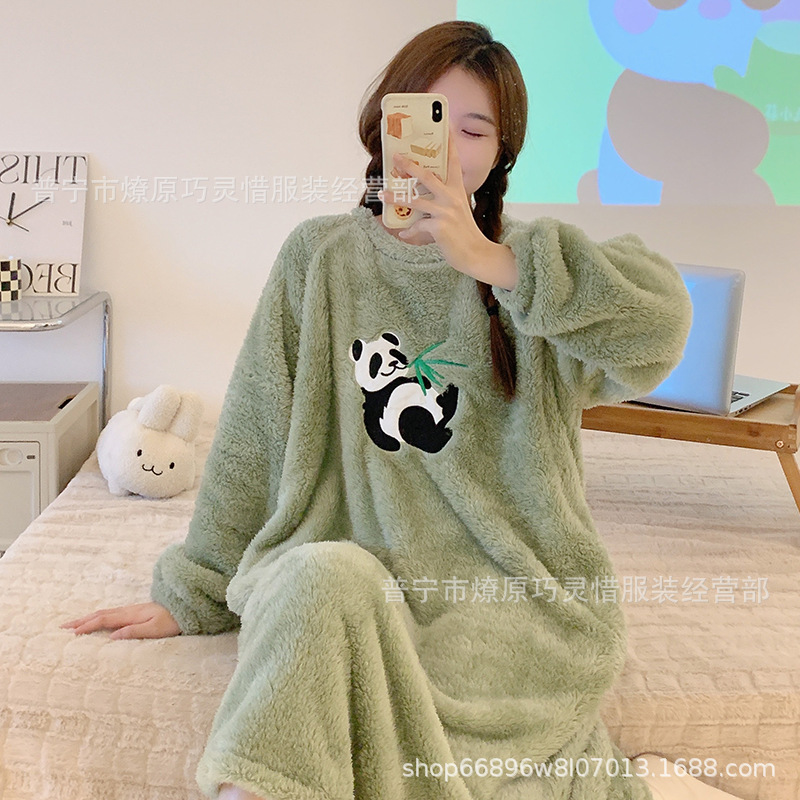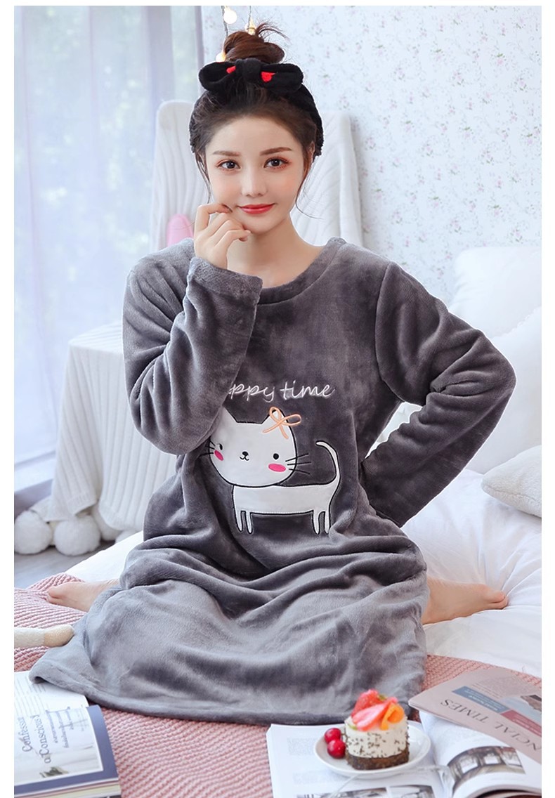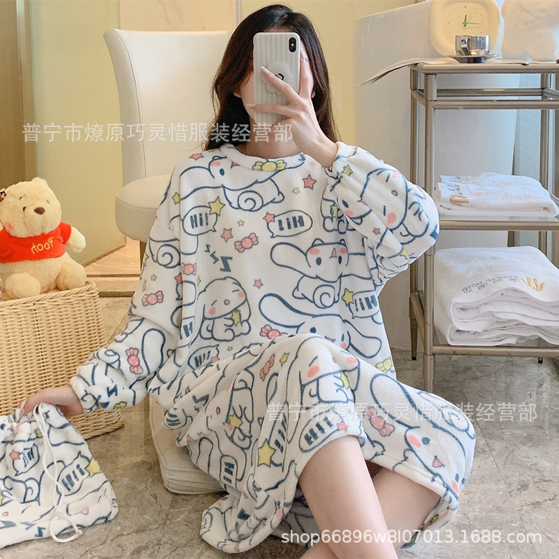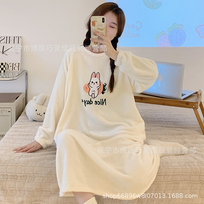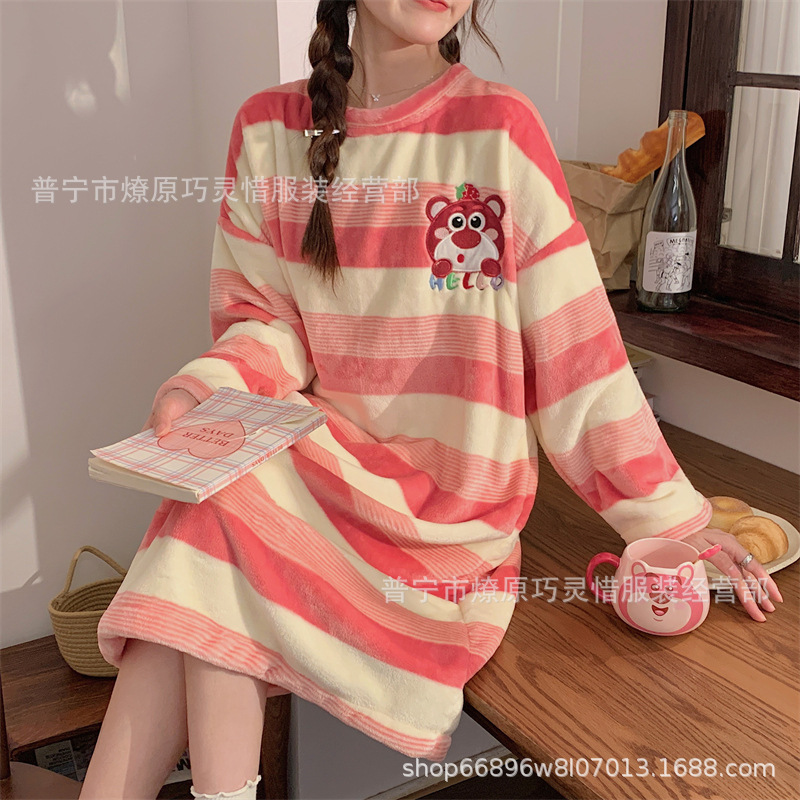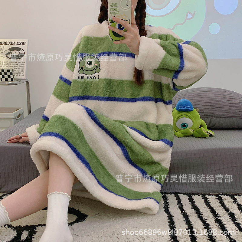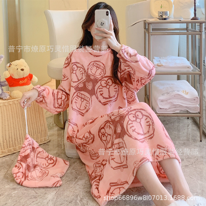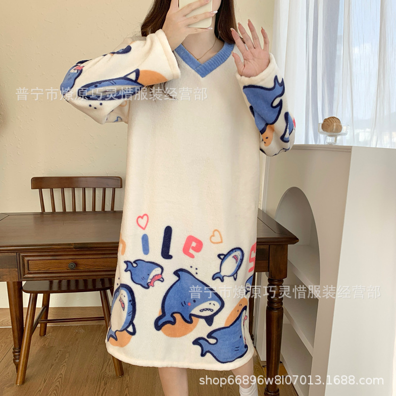 나이트 드레스 여성의 가을과 겨울 플란넬 귀여운 만화 2023 새로운 산호 양털 두꺼운 따뜻한 원피스 홈 웨어스토어 가기