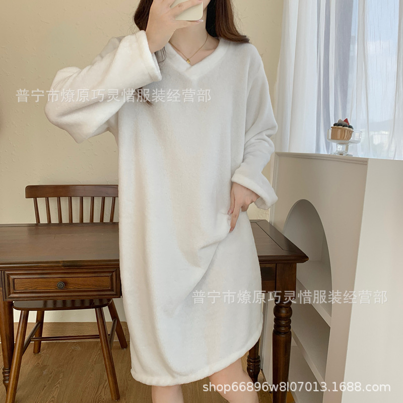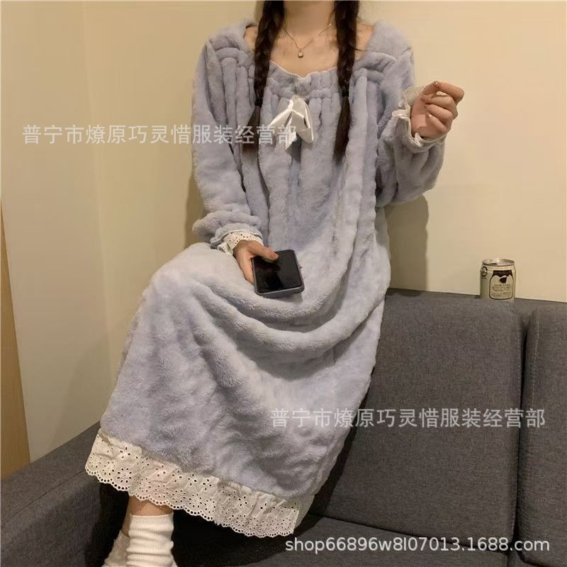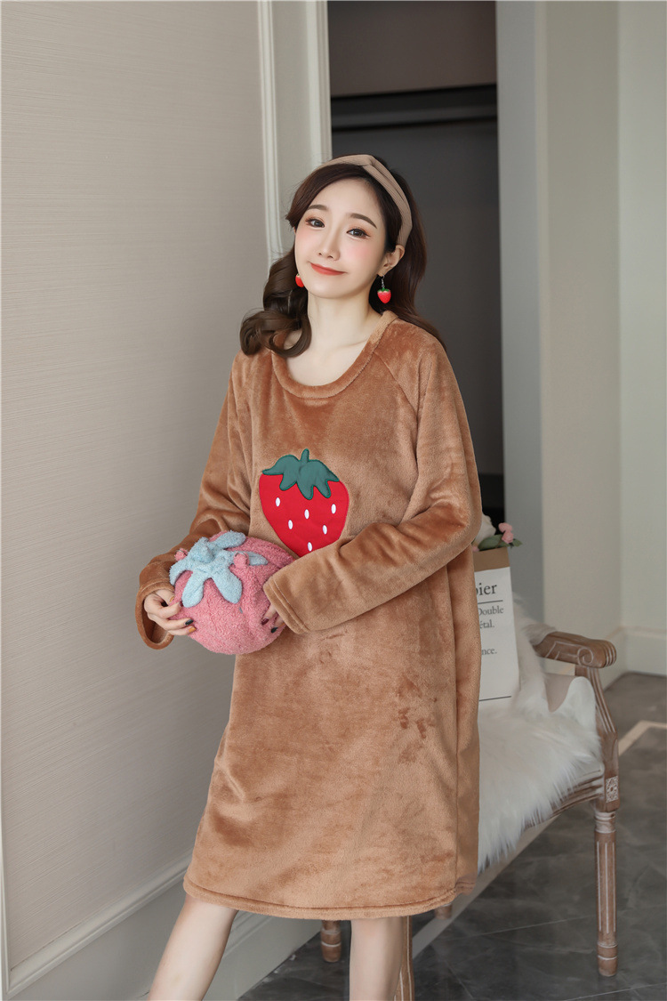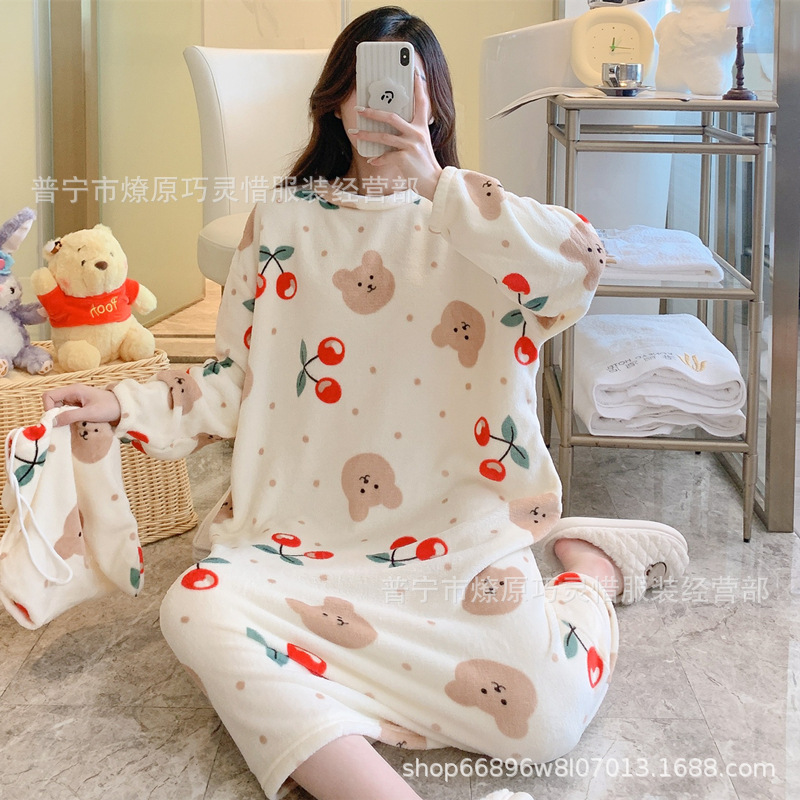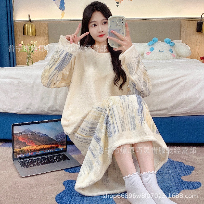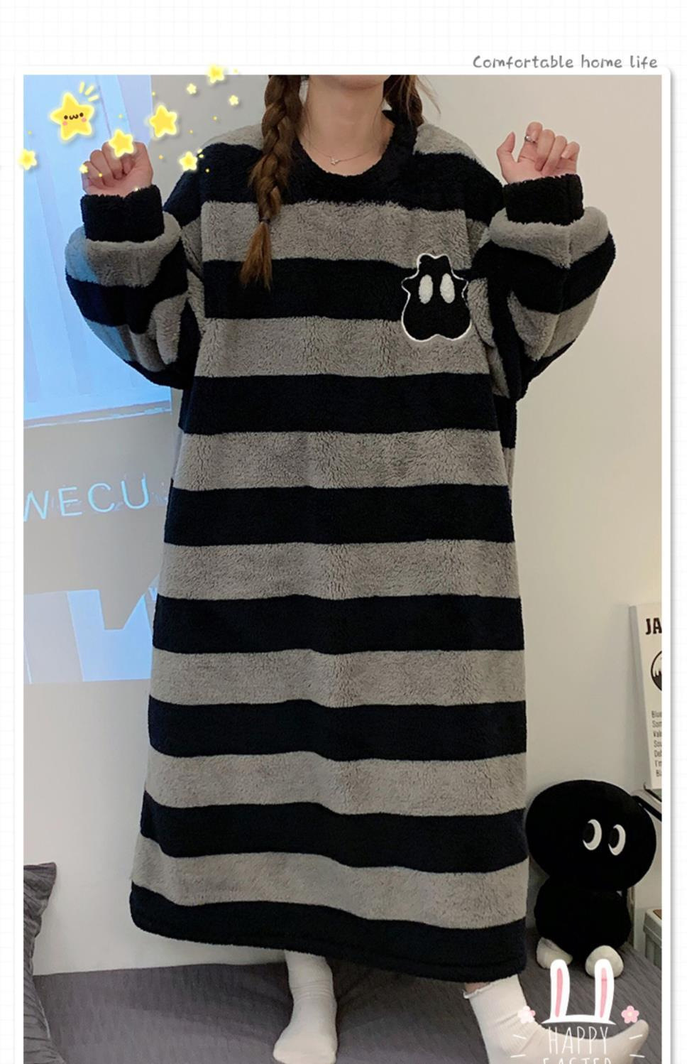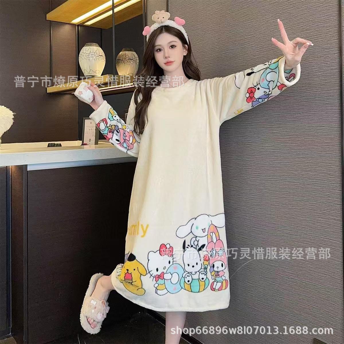 나이트 드레스 여성의 가을과 겨울 플란넬 귀여운 만화 2023 새로운 산호 양털 두꺼운 따뜻한 원피스 홈 웨어스토어 가기