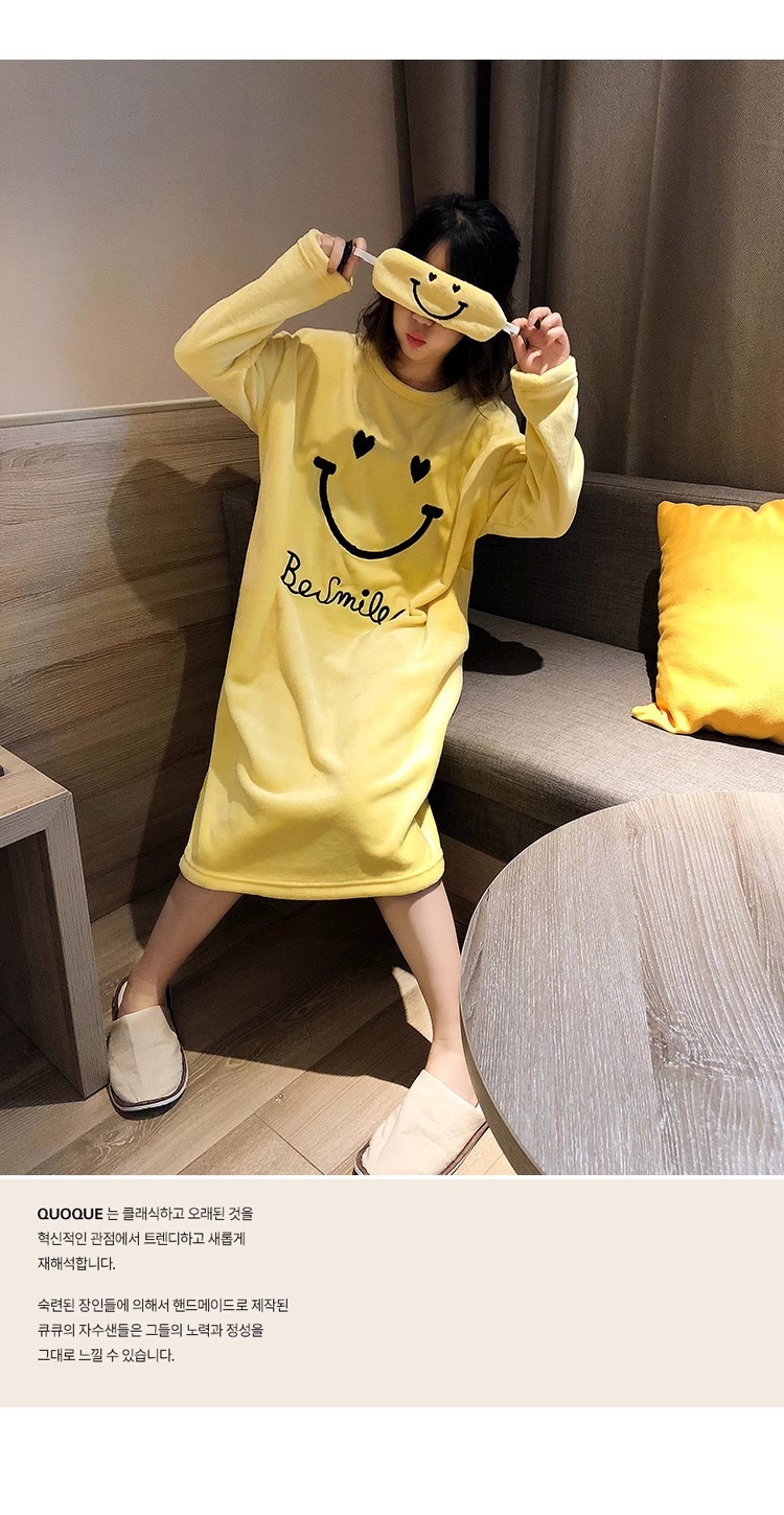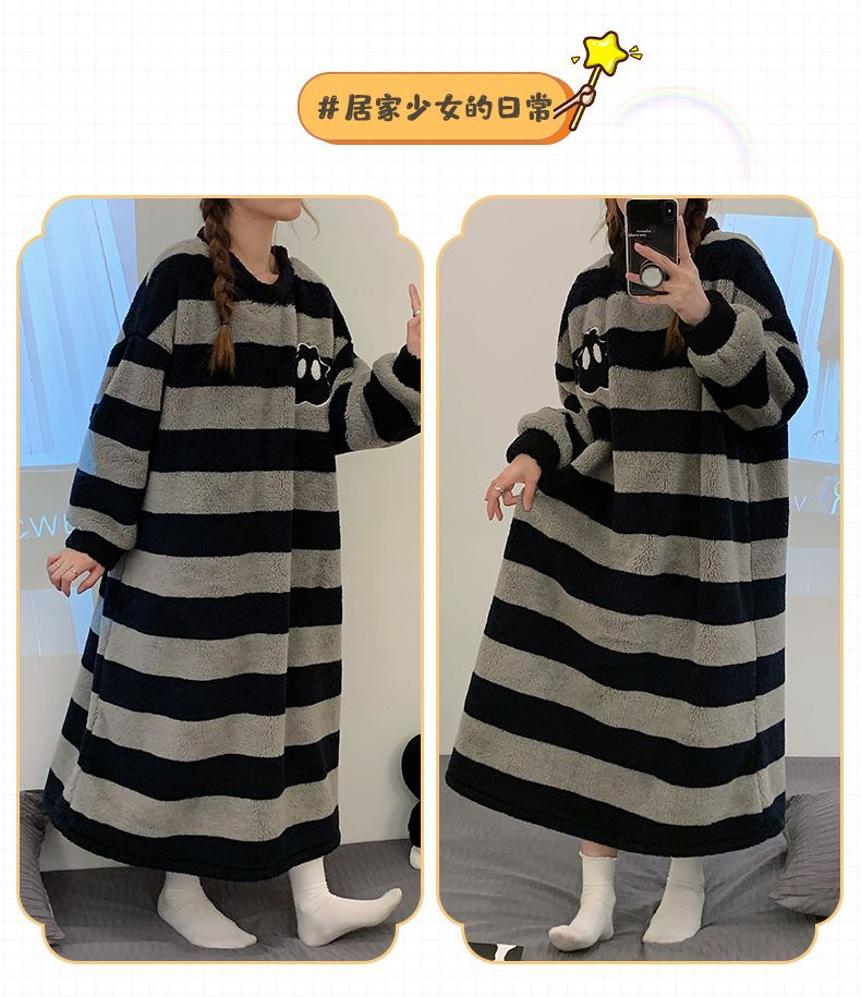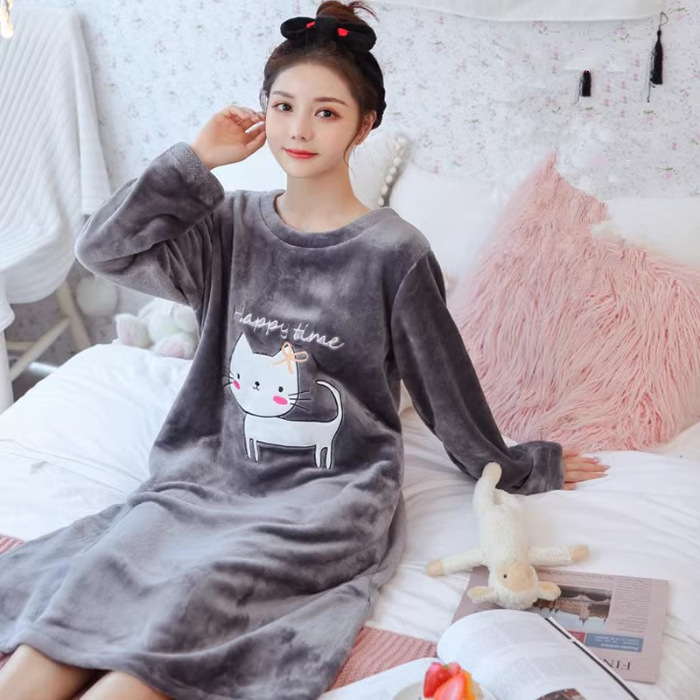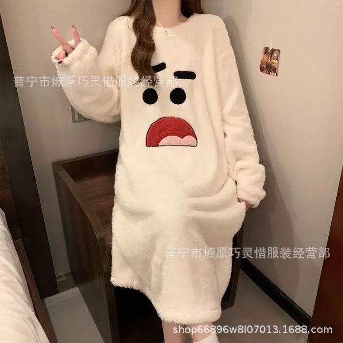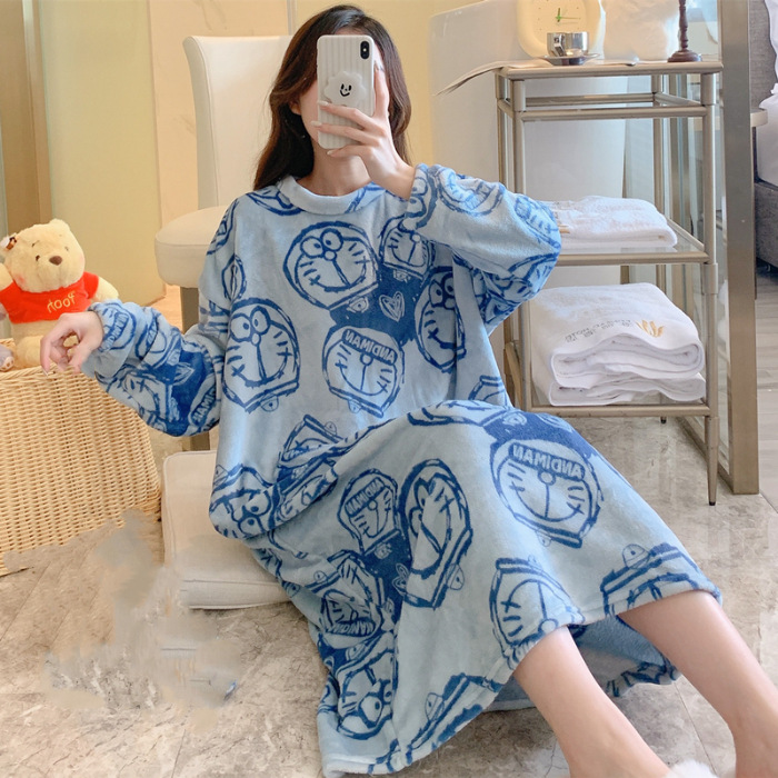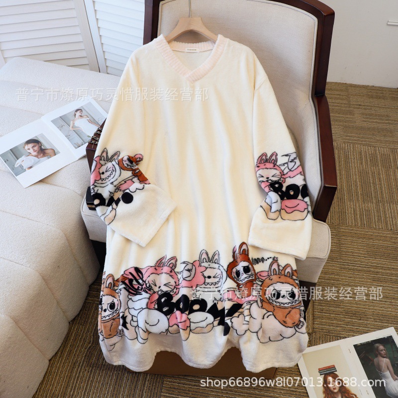 나이트 드레스 여성의 가을과 겨울 플란넬 귀여운 만화 2023 새로운 산호 양털 두꺼운 따뜻한 원피스 홈 웨어