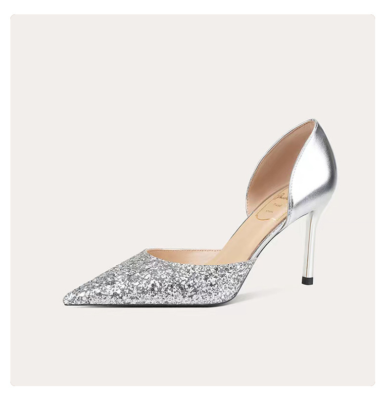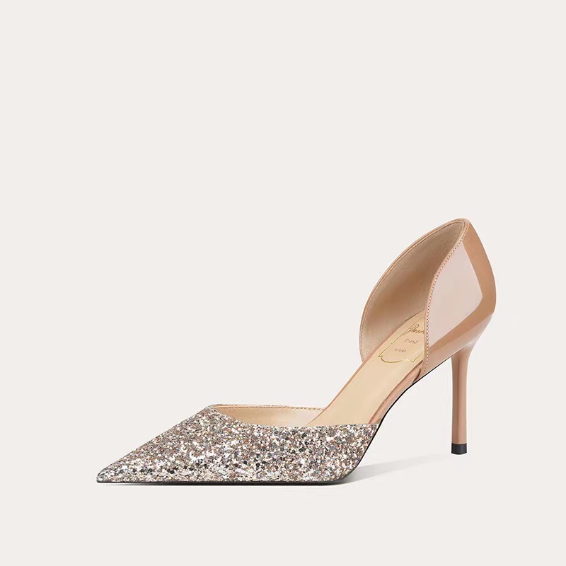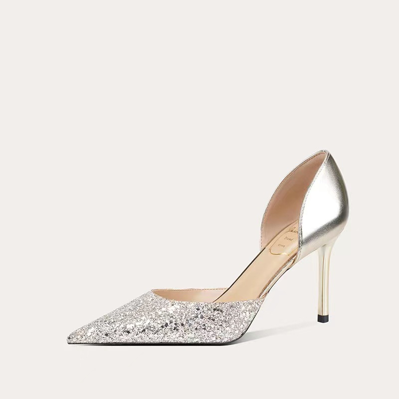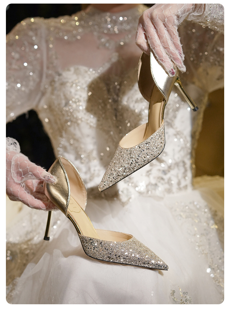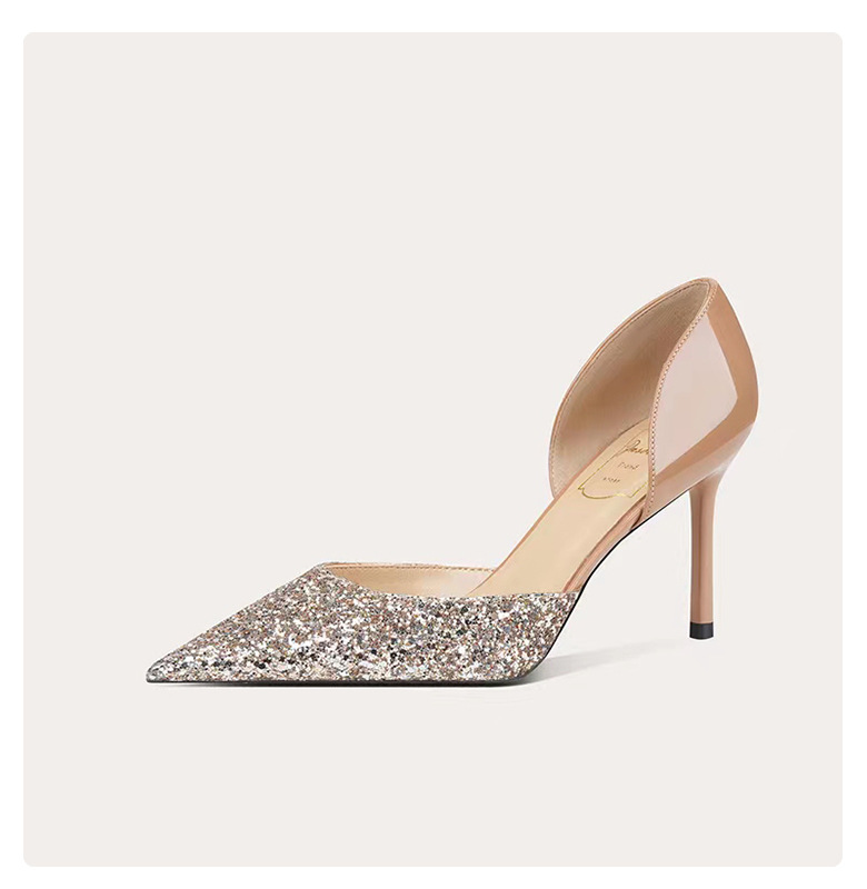 708-60 [취한 금색 팬] 얇은 뒤꿈치 얕은 하이힐 뾰족한 얇은 뒤꿈치 유럽과 미국의 양가죽 연회 중공 단일 신발