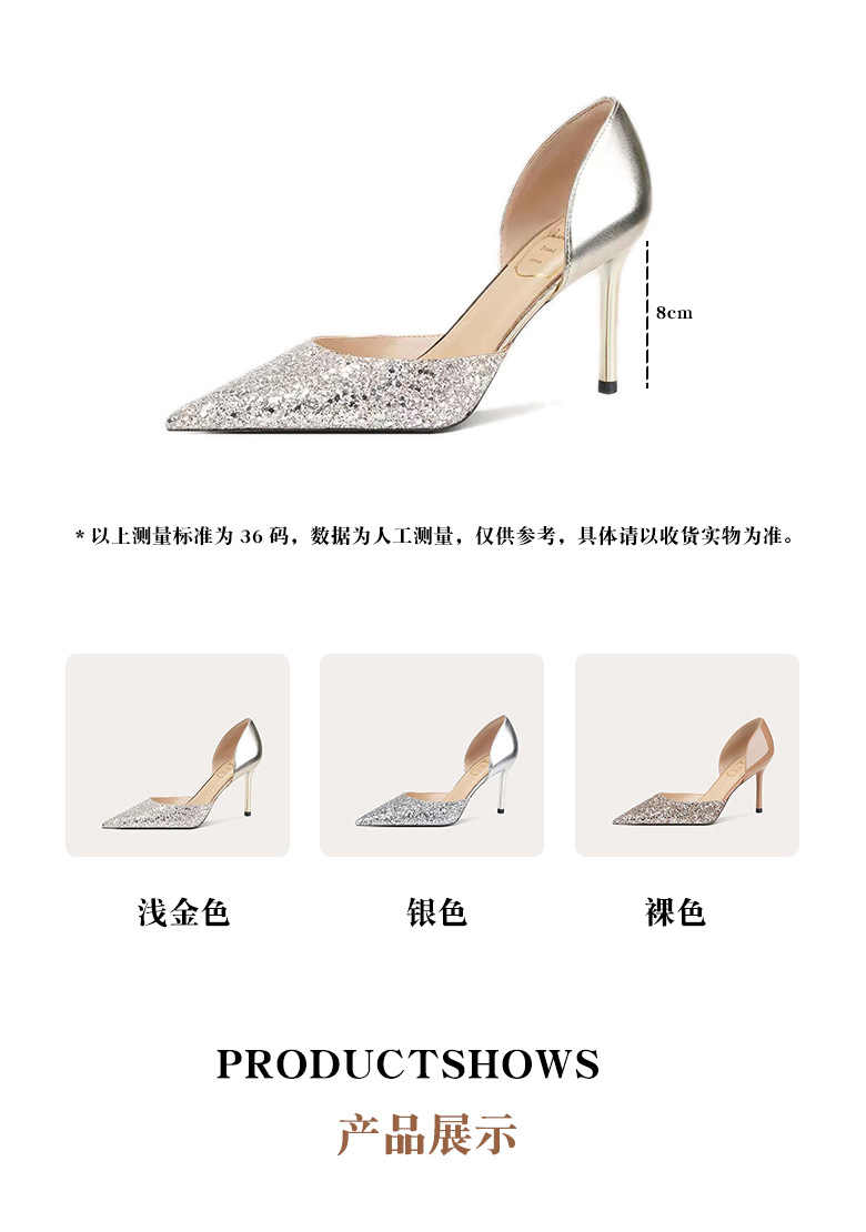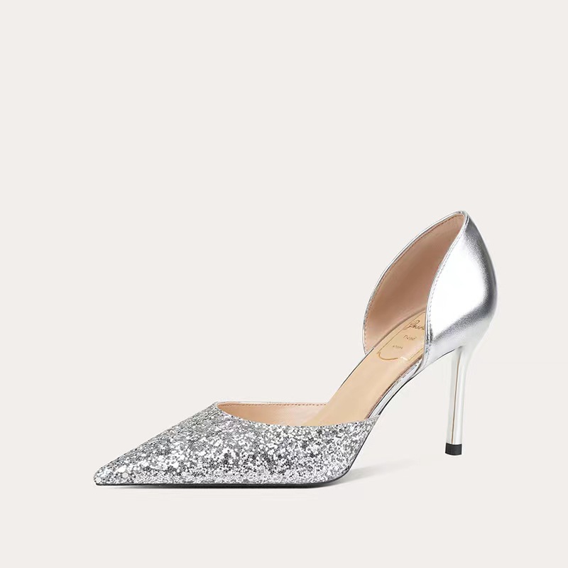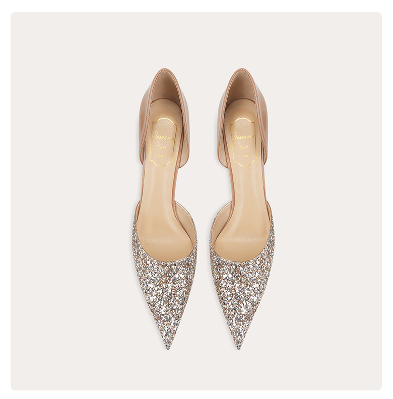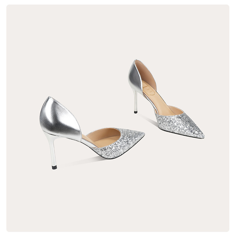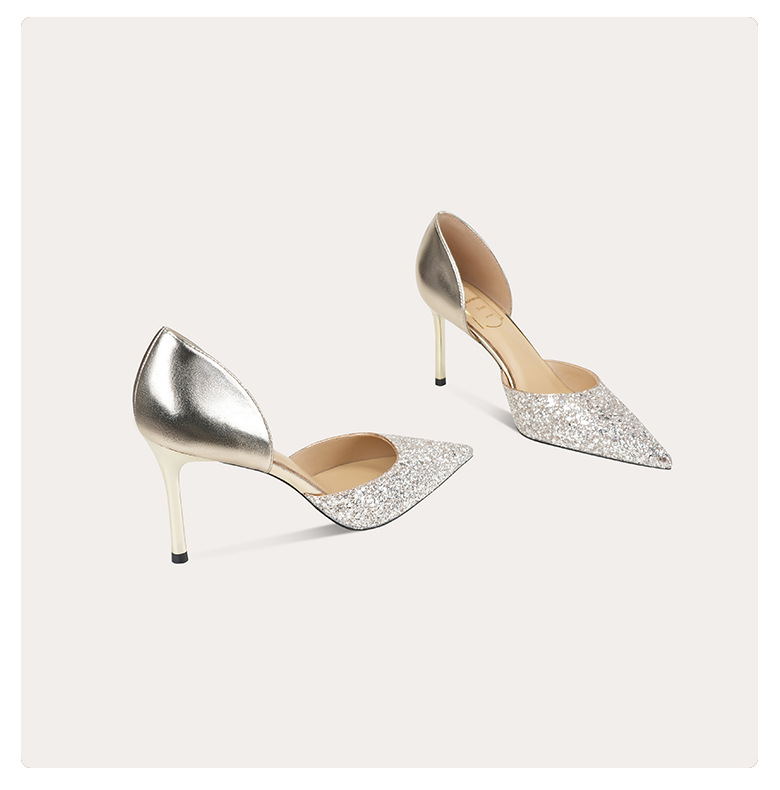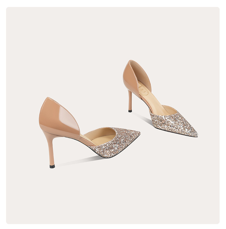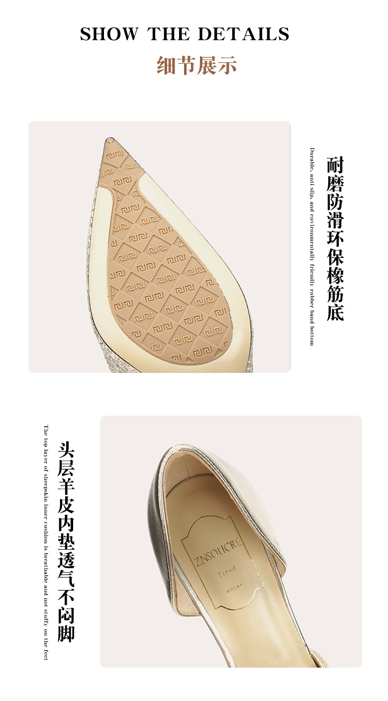 708-60 [취한 금색 팬] 얇은 뒤꿈치 얕은 하이힐 뾰족한 얇은 뒤꿈치 유럽과 미국의 양가죽 연회 중공 단일 신발스토어 가기