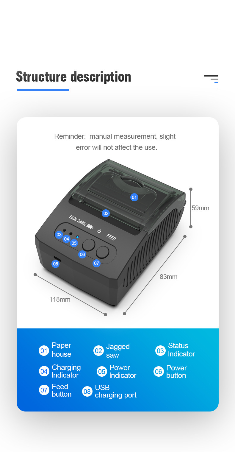58mm 휴대용 열 프린터 작은 티켓 라벨 바코드 금전 등록기 테이크 아웃 지폐 블루투스 열 프린터
