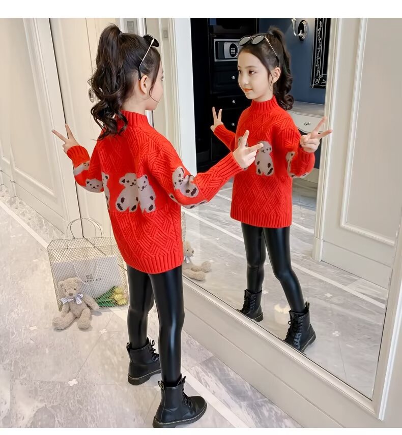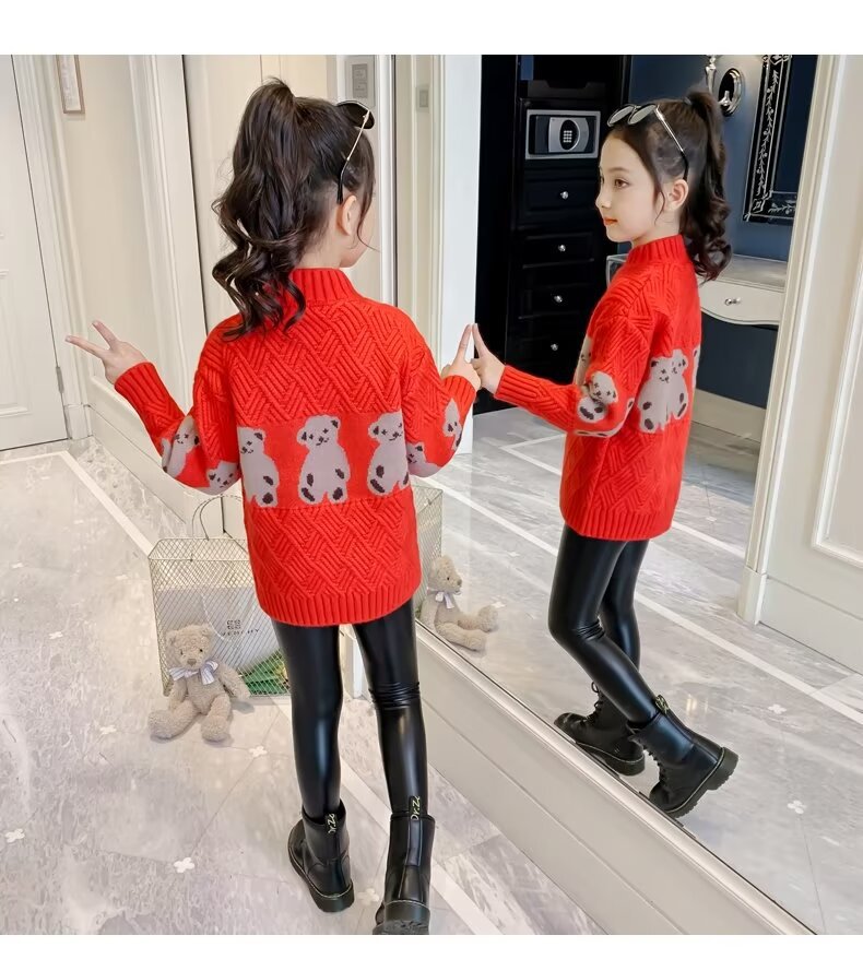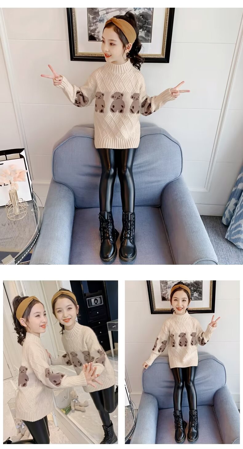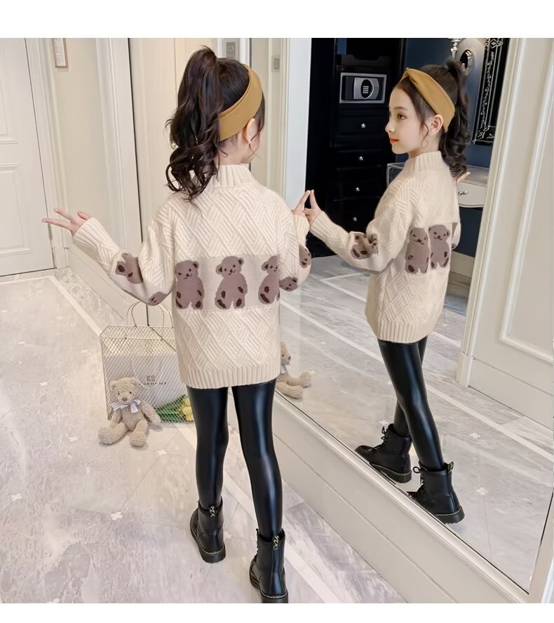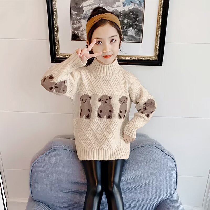 여자 스웨터 2024 봄과 가을 새로운 스타일 중대형 어린이 풀오버 플러스 벨벳 두꺼운 따뜻한 아기 소녀 니트 스웨터