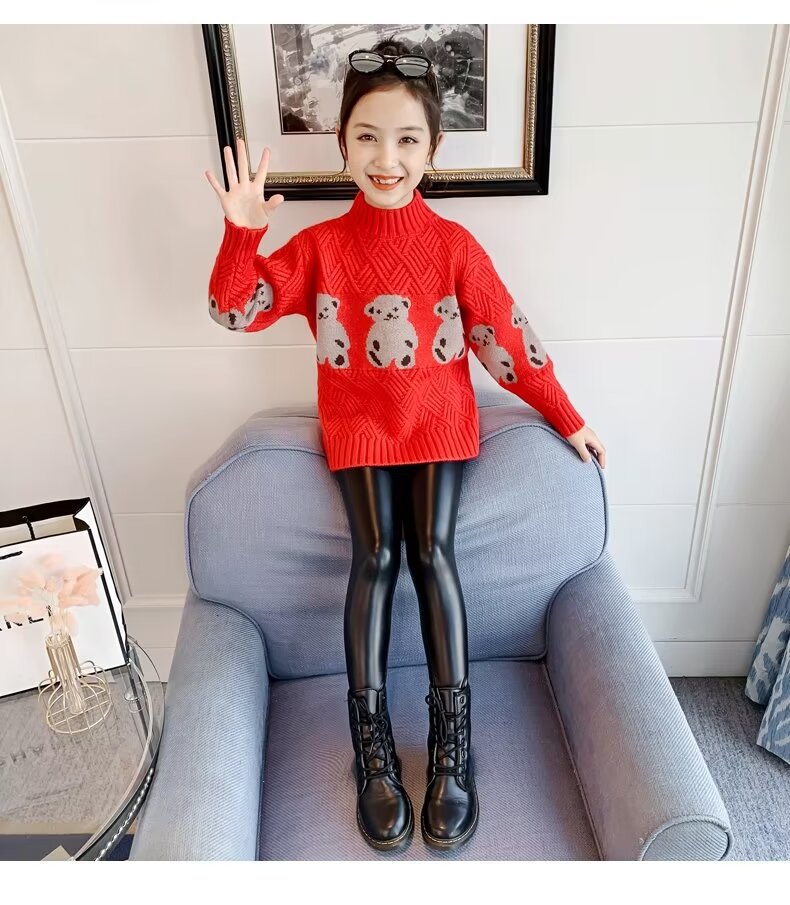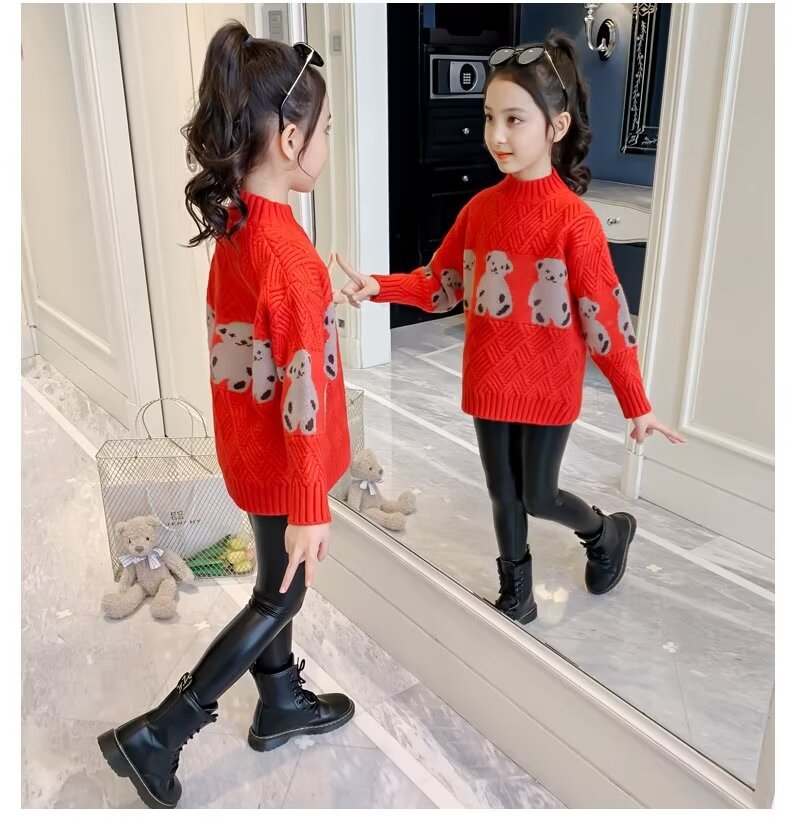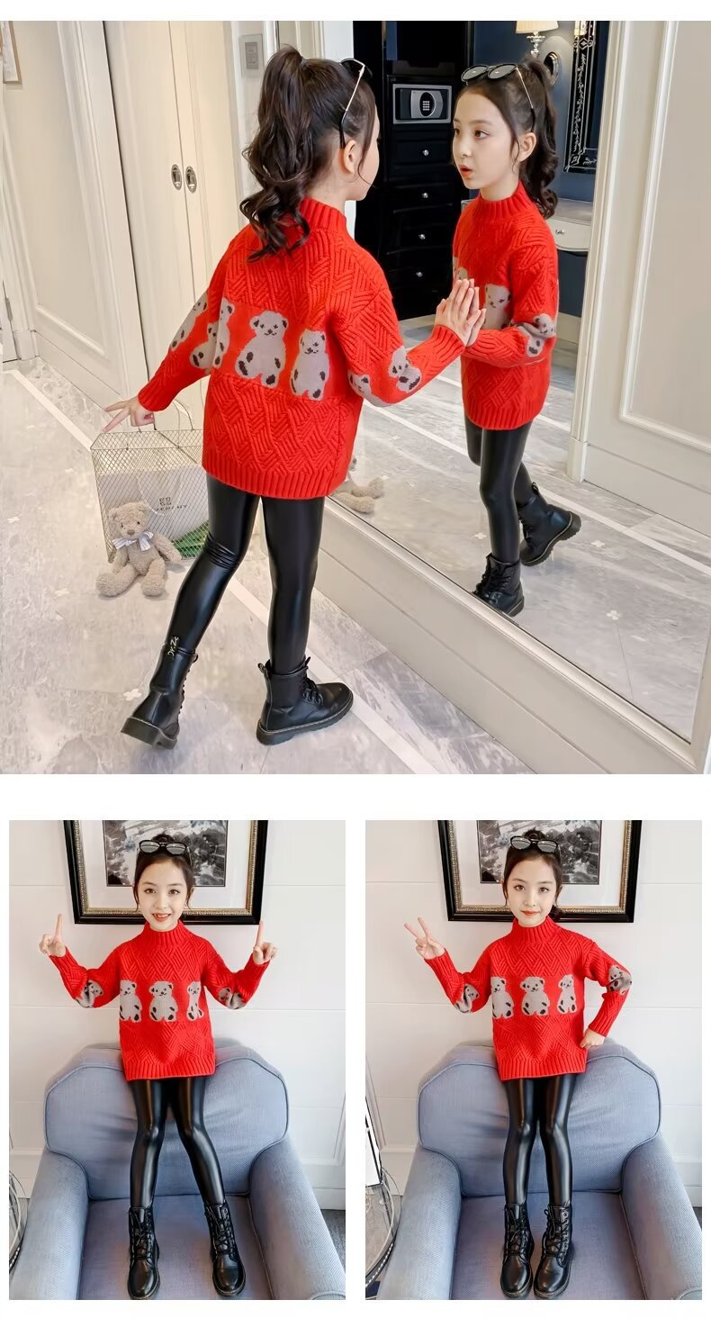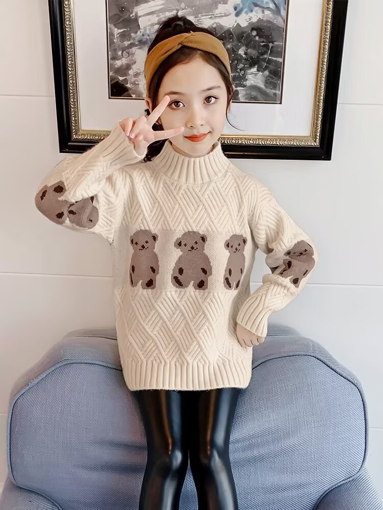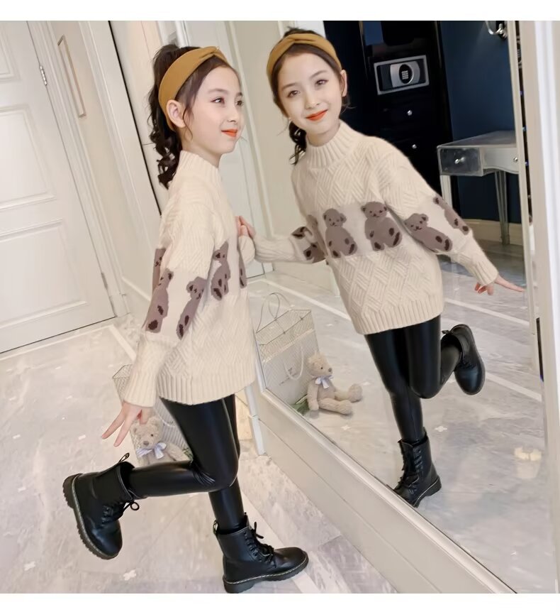 여자 스웨터 2024 봄과 가을 새로운 스타일 중대형 어린이 풀오버 플러스 벨벳 두꺼운 따뜻한 아기 소녀 니트 스웨터