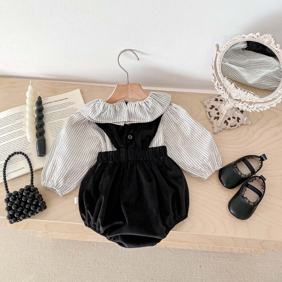 아기 옷 2024 봄 새 소녀 스트랩 하셀 로터스 칼라 셔츠 세트 아기의 원피스 등반 세트