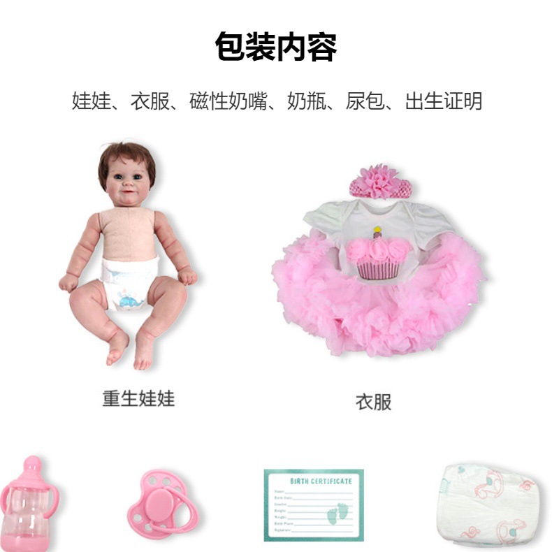 包装内容:娃娃、衣服、磁性奶嘴、奶瓶、出生证明
