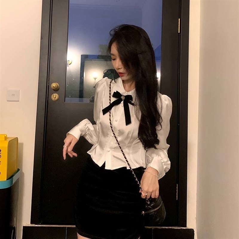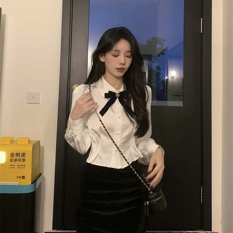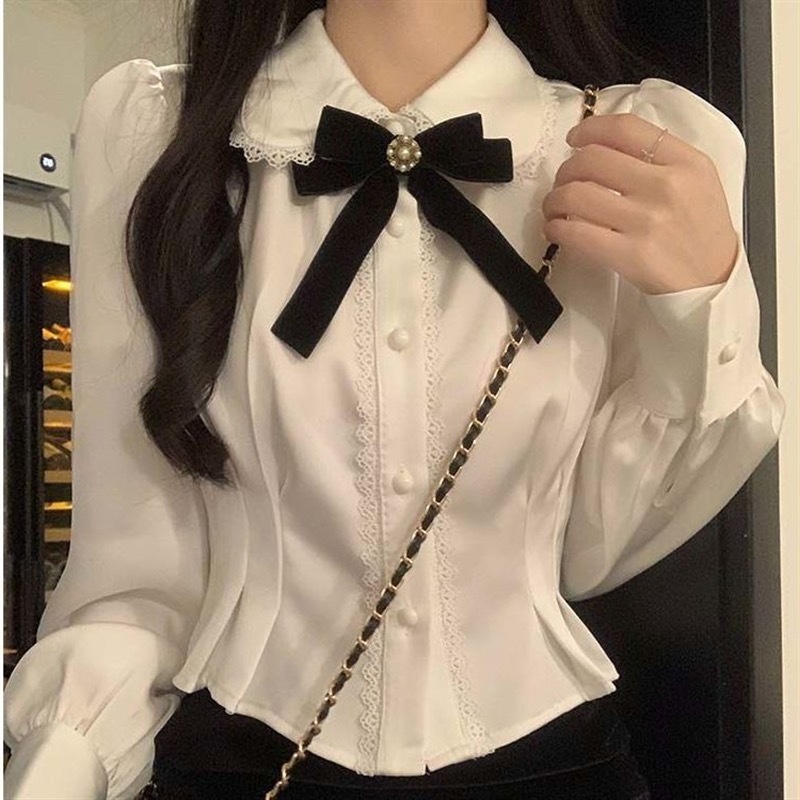 봄과 가을 2024 여성을위한 프레피 스타일 달콤한 인형 칼라 셔츠 긴팔 셔츠 새로운 타이트한 허리 짧은 디자인 셔츠스토어 가기
