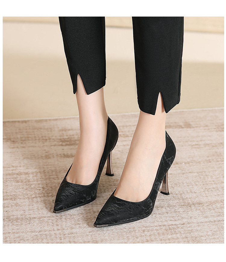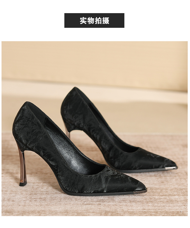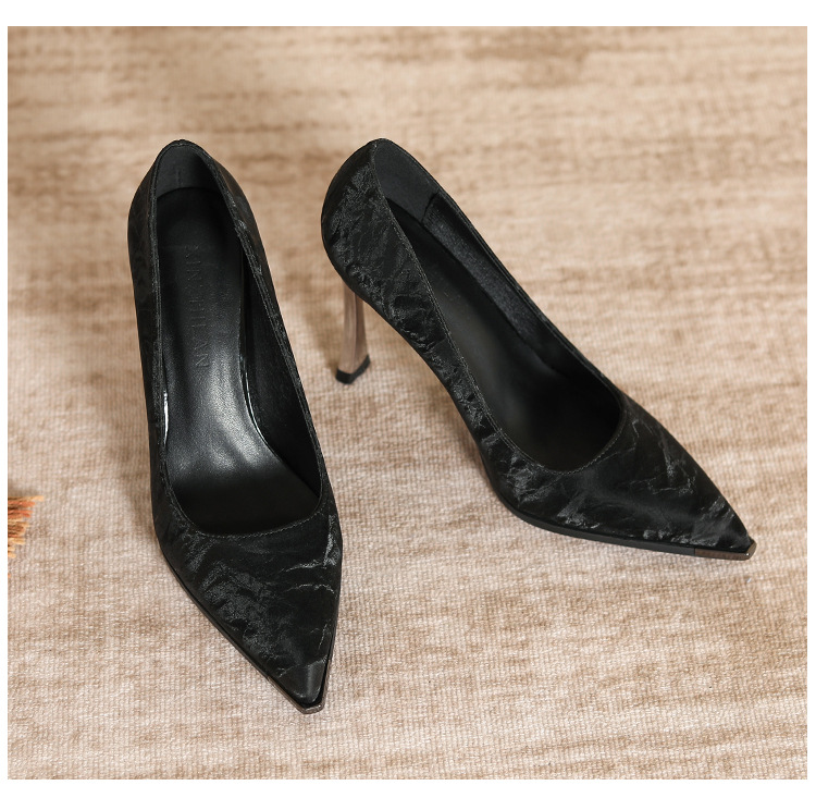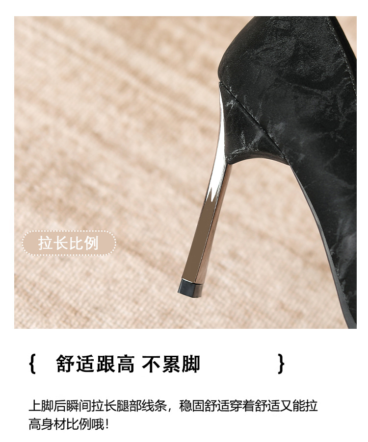 뾰족한 스틸레토 힐 전기 도금 하이힐 신발 통근 다용도 작업 신발 여성 스톤 패턴 PU 뱀파이어 단색 블랙