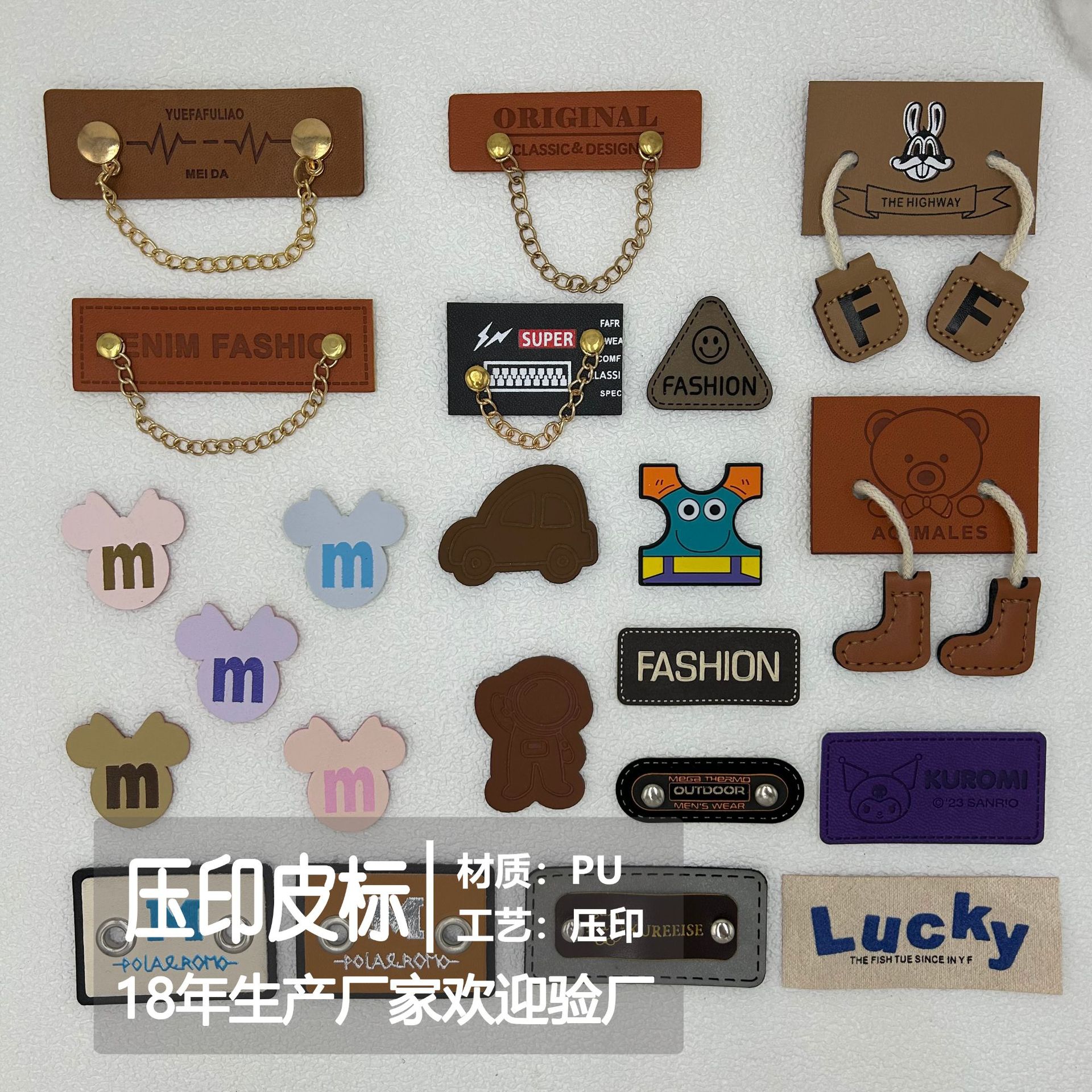 本厂主做皮标(跟皮料有关的皮条、皮袢、皮套、杯垫等)、pvc滴塑标/合模胶章、布标、TPU高周波电压标、刻字膜烫标、激光皮标、硅胶烫标、冲型皮标等,可以把不同材质复合,如滴塑复合到皮标上、tpu复合到织带上、刻字膜转压到皮标上、硅胶标转烫到布标上等等。所涉及到的工艺繁多,如压印、彩印、uv印皮标、金属电镀皮牌,烫金(热烫、冷烫)、皮标、滴塑标带背胶/魔术贴、皮标打扣、车线、油边、锁边、刺绣等。