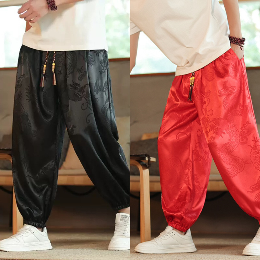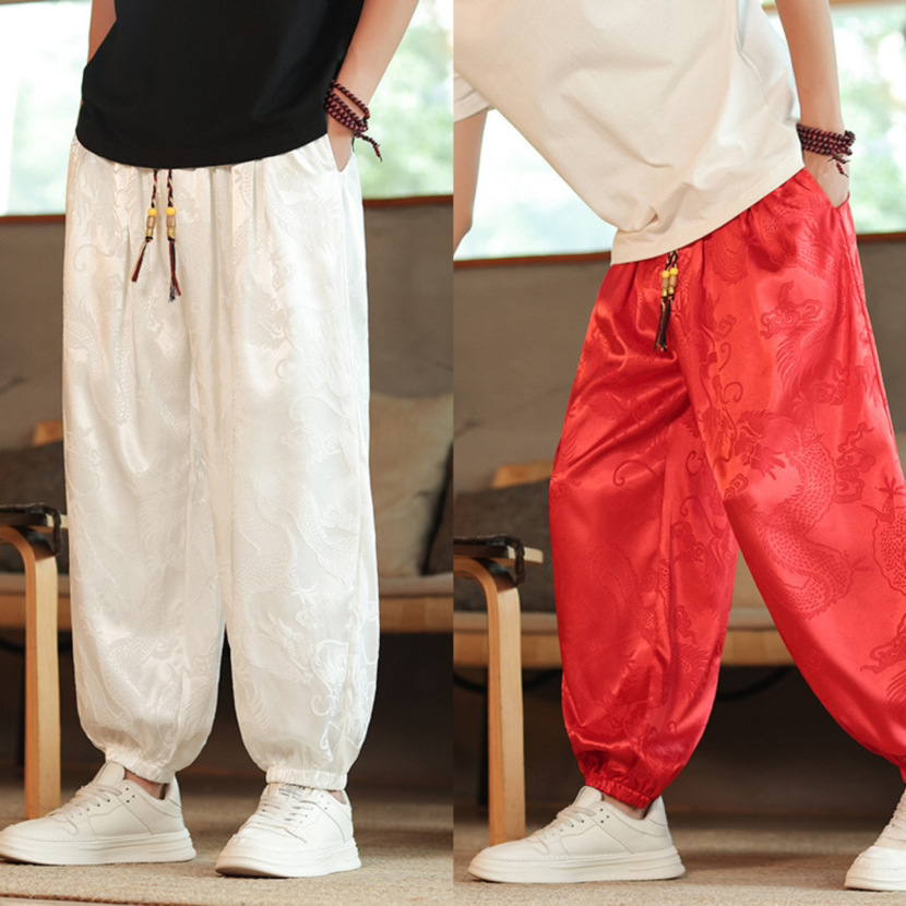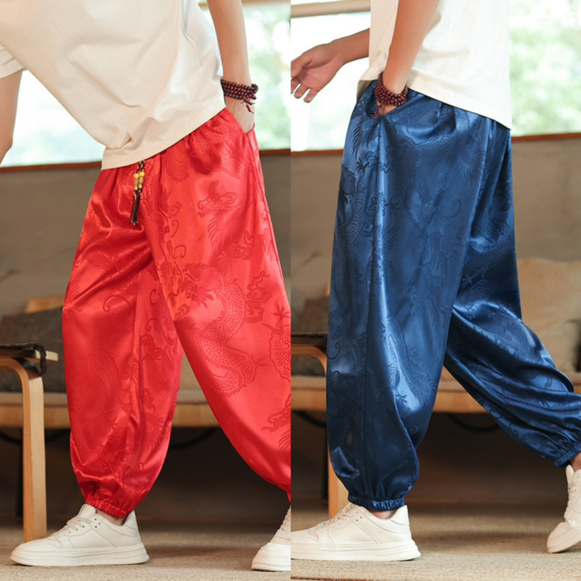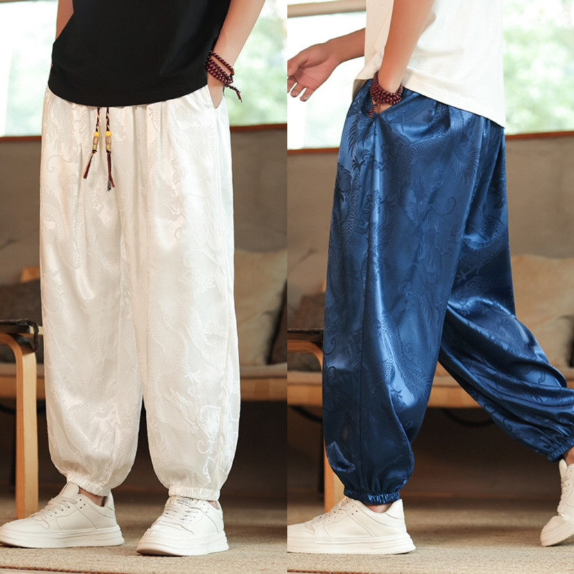 아이스 실크 캐주얼 바지 남자 여름 얇은 넥타이 다리 하렌 바지 중국 스타일 드래곤 패턴 인쇄 유행 브랜드 탕 스타일 자른 바지