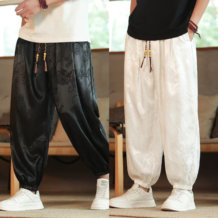 아이스 실크 캐주얼 바지 남자 여름 얇은 넥타이 다리 하렌 바지 중국 스타일 드래곤 패턴 인쇄 유행 브랜드 탕 스타일 자른 바지스토어 가기