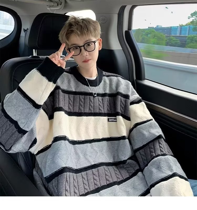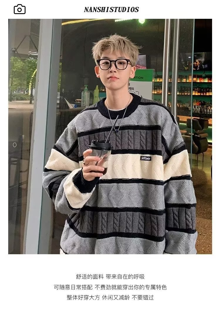 2023 줄무늬 스웨터 가을과 겨울 남성 패션 느슨한 트위스트 스웨터 둥근 목 게으른 스타일 녹색 패션스토어 가기