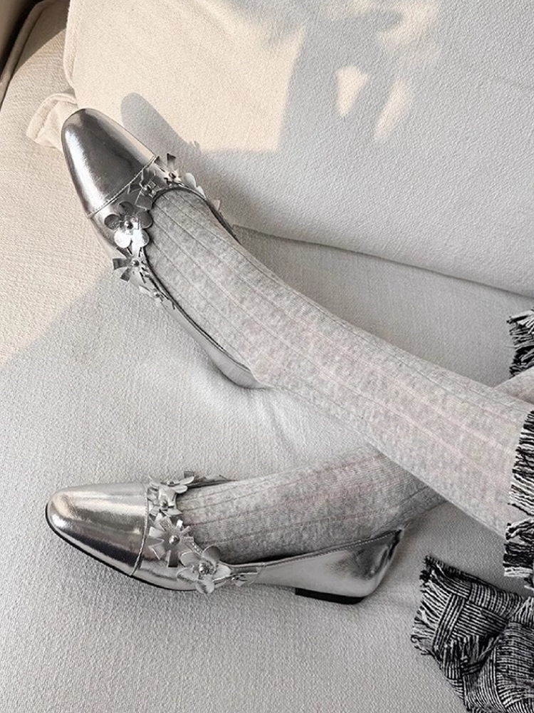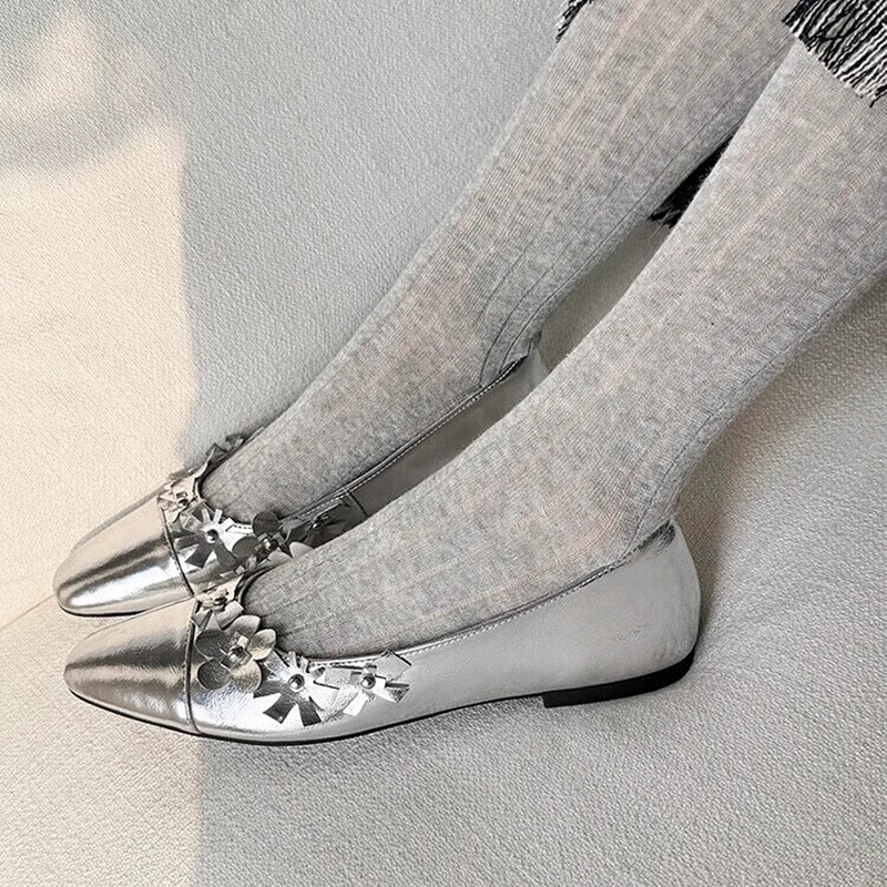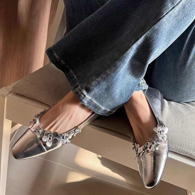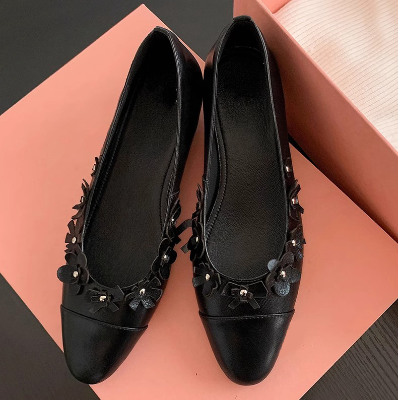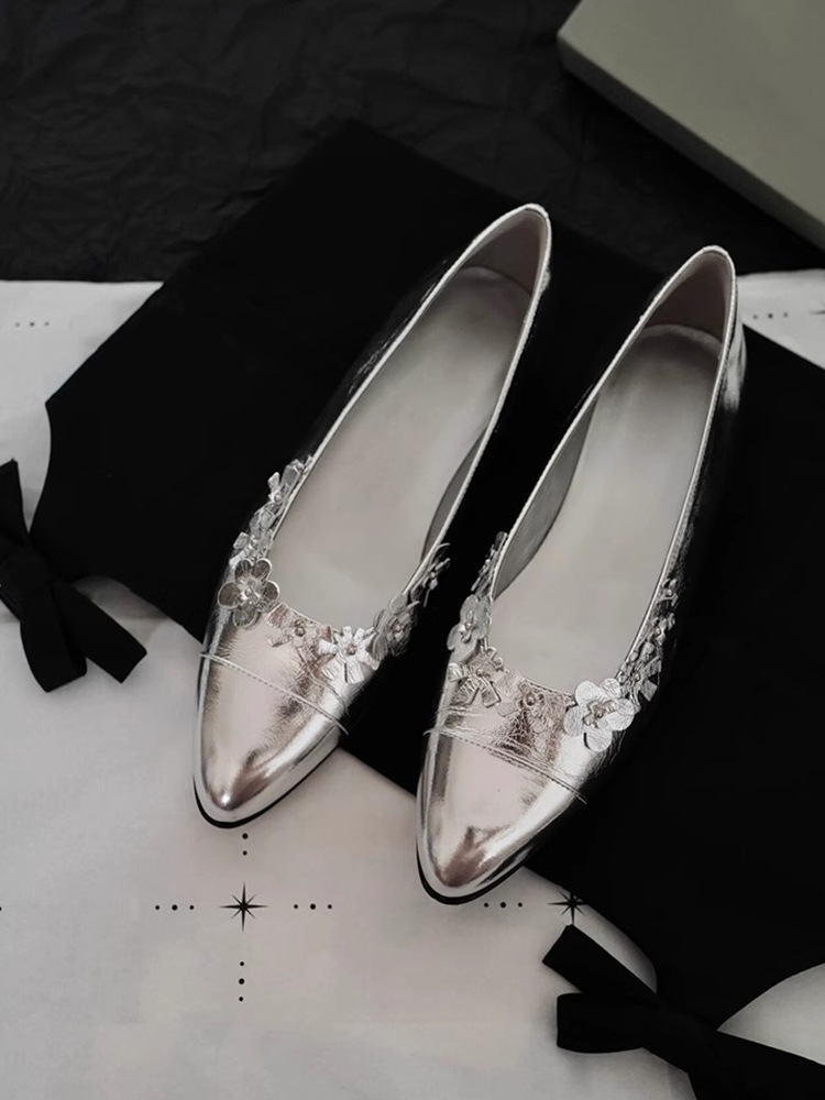프랑스 플랫 얕은 입 메리 제인 여성 신발 새로운 틈새 특허 가죽 꽃 장식 레이디 포인팅 신발 슬립 온 신발스토어 가기