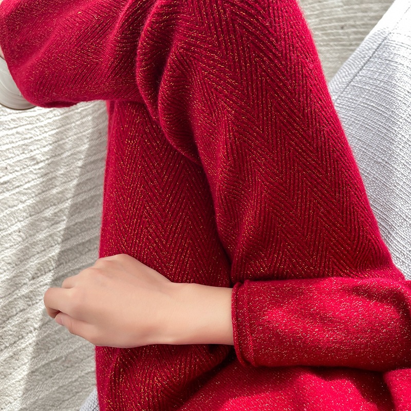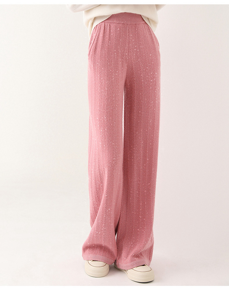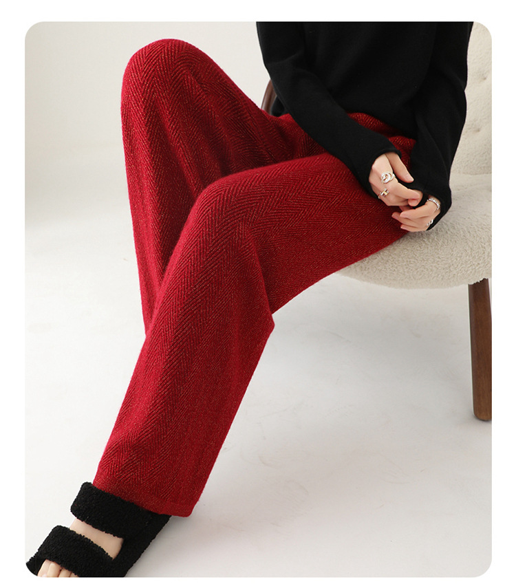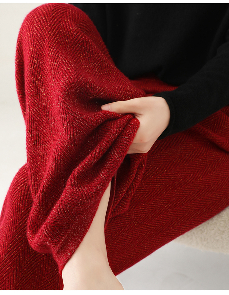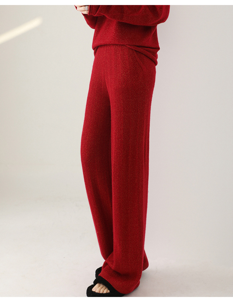 금색과 실버 실크 순수 양모 니트 넓은 다리 바지 여성용 외부 착용 높은 허리 포켓 스트레이트 슬림 레드 캐시미어 바지