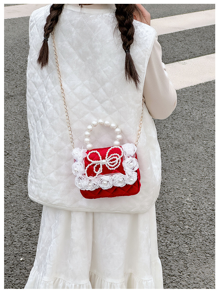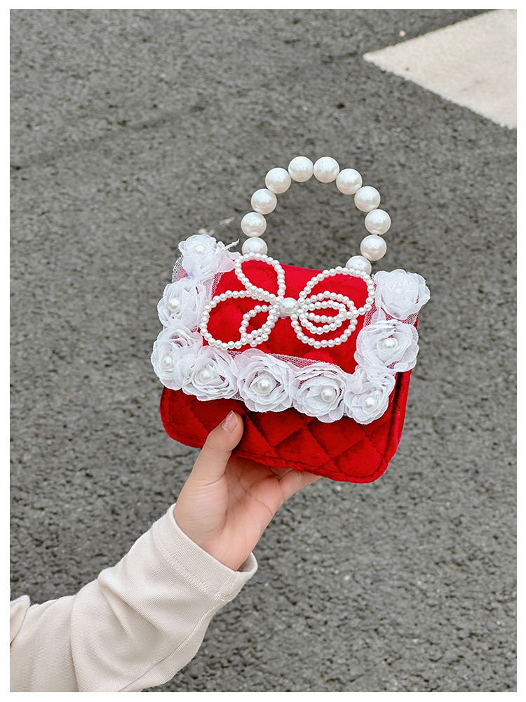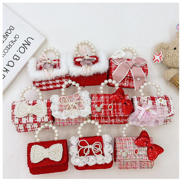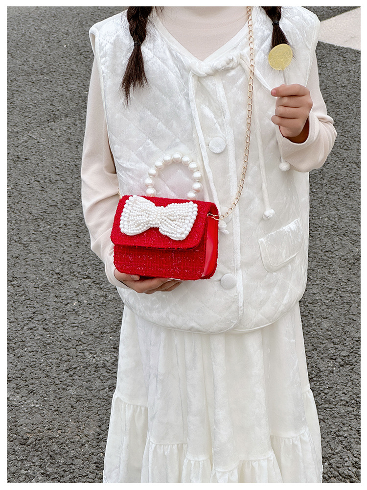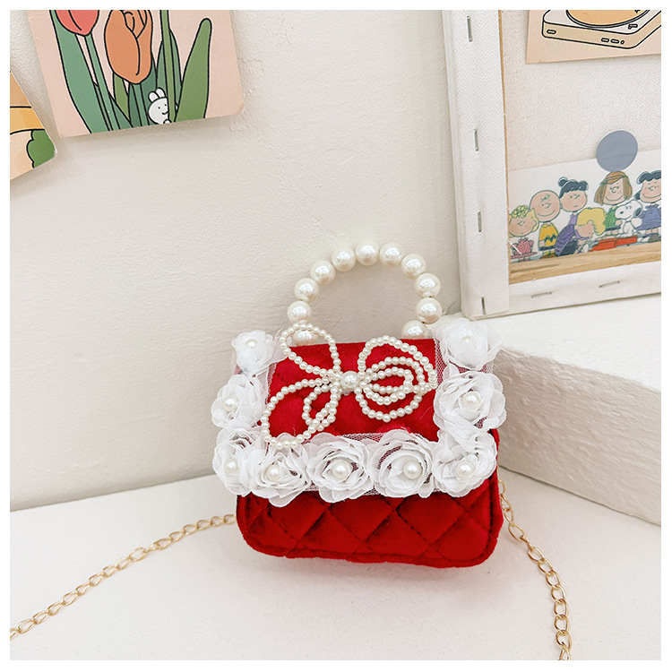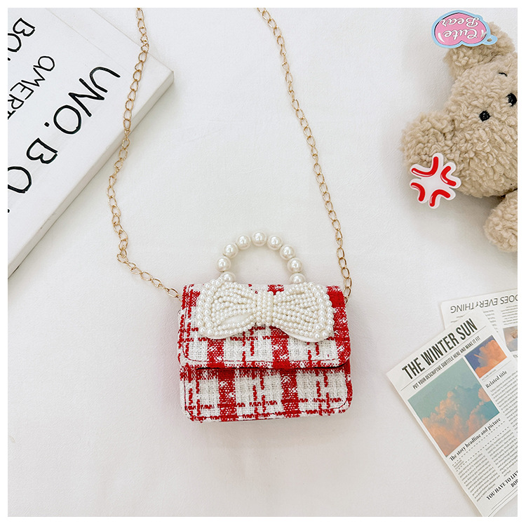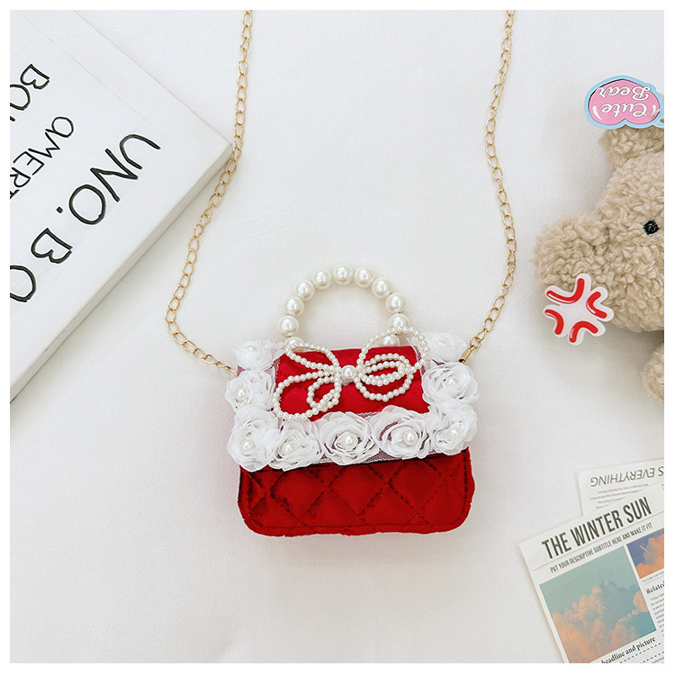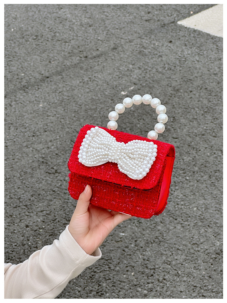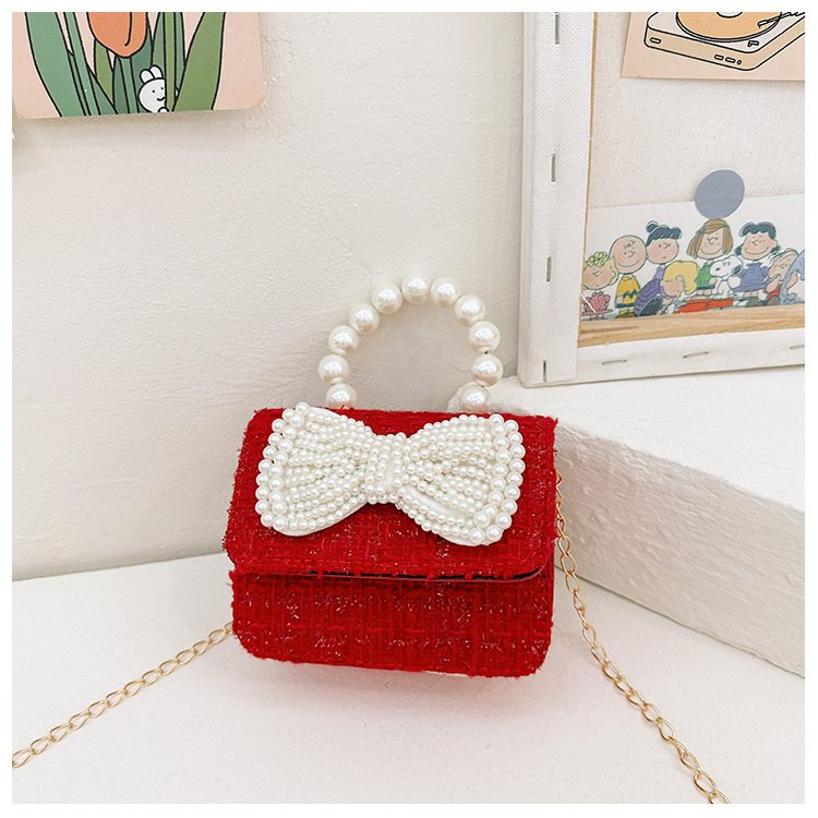 가을과 겨울 새로운 어린이 공주 가방 빨간 작은 광장 가방 소녀 체인 어깨 크로스 바디 가방 진주 손 동전 지갑