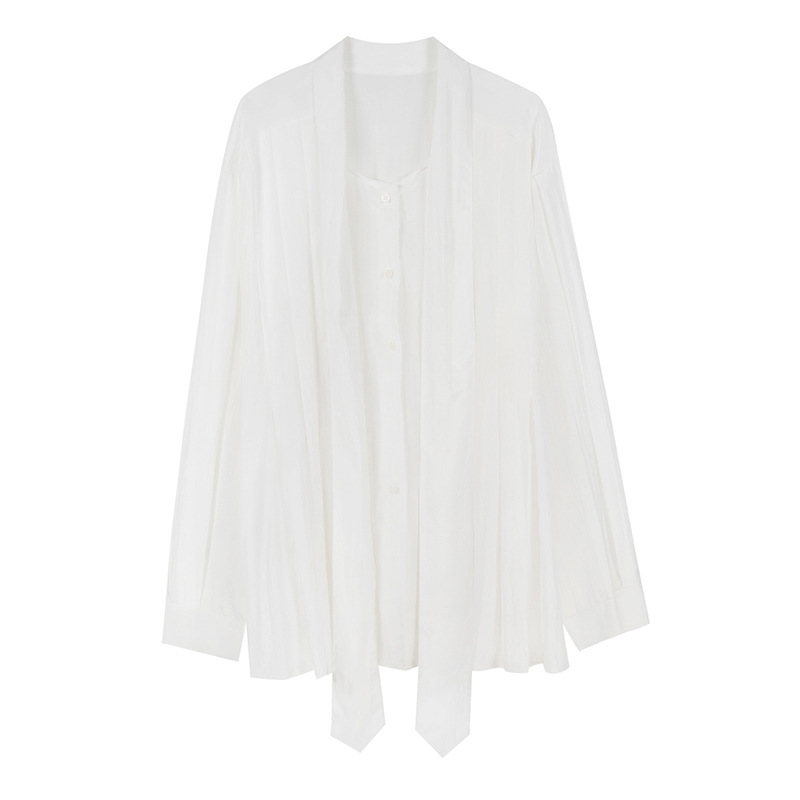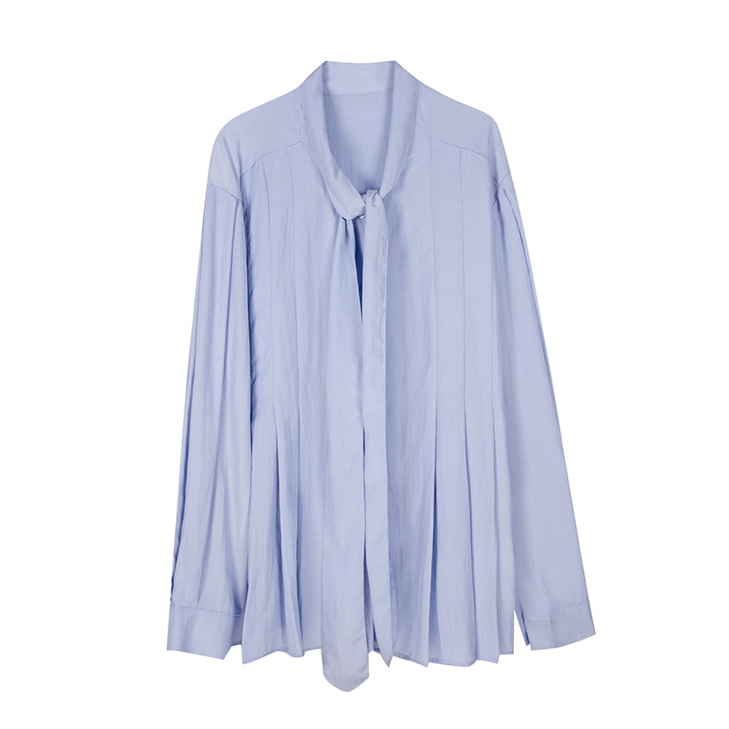 Wanwei 프렌치 글로시 플리츠 셔츠 여성 2025 봄, 가을 새로운 디자인 넥 레이스 업 셔츠 P1211스토어 가기