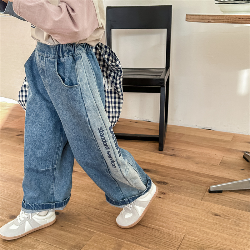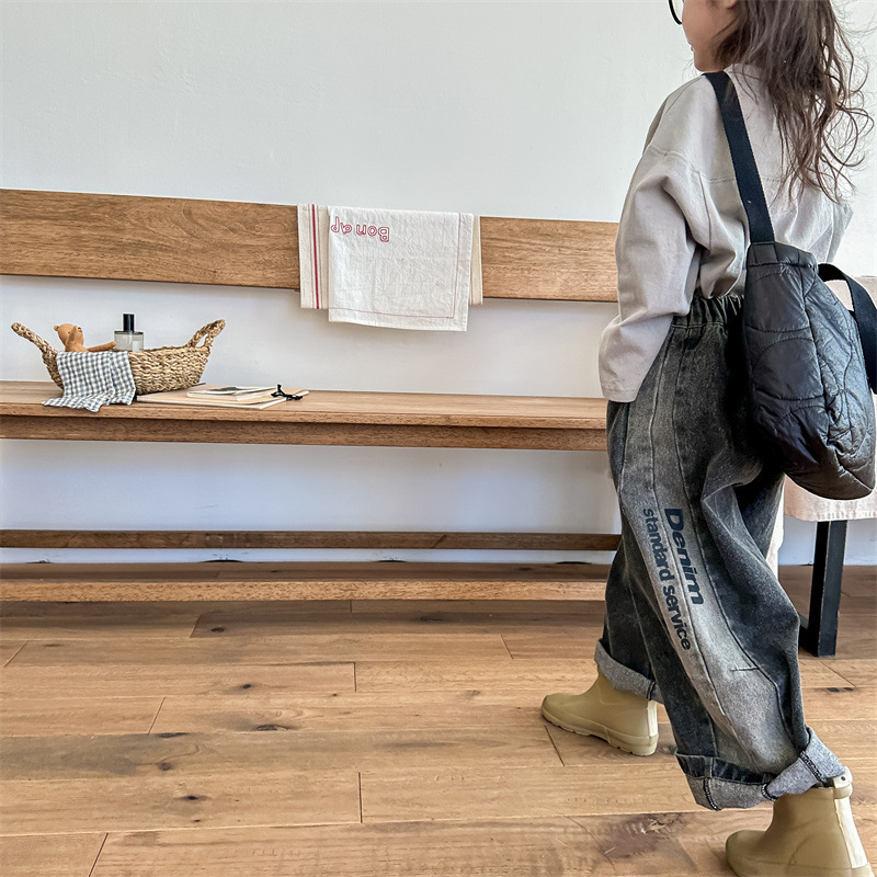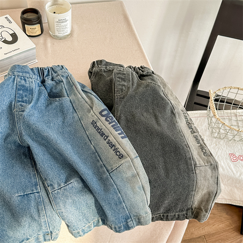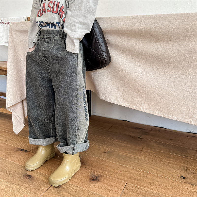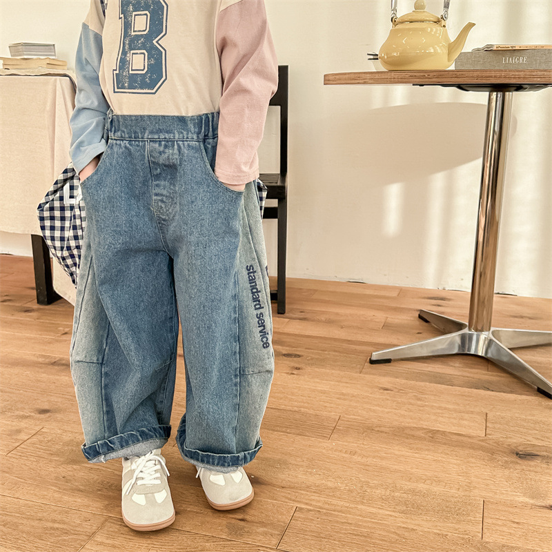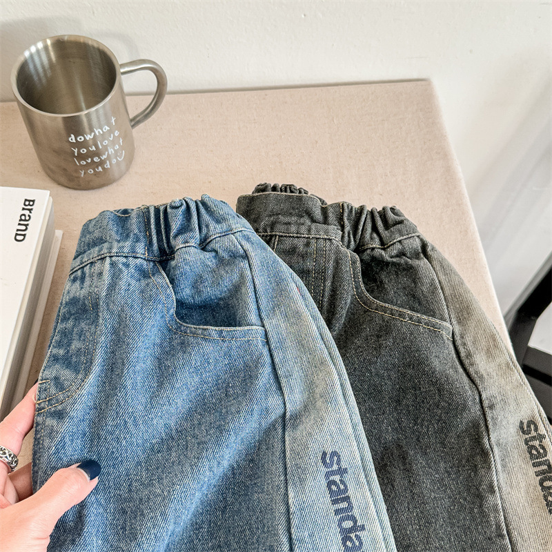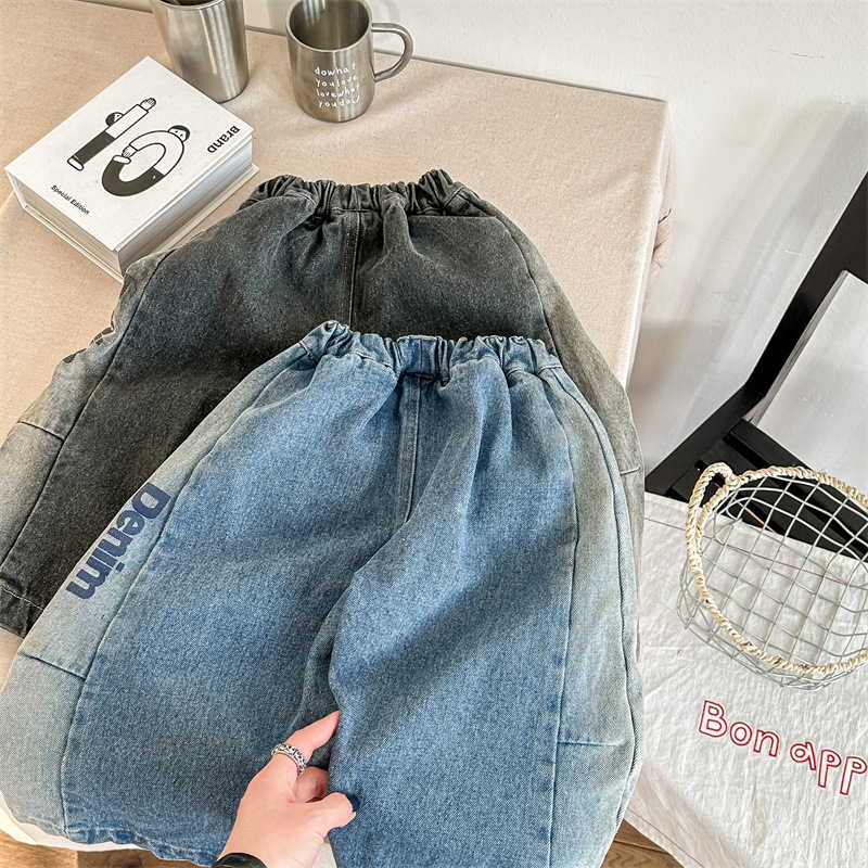 봄 2024 어린이 청바지 소년 한국식 편지 인쇄 복고풍 청바지 하렘 바지 유행 바지스토어 가기