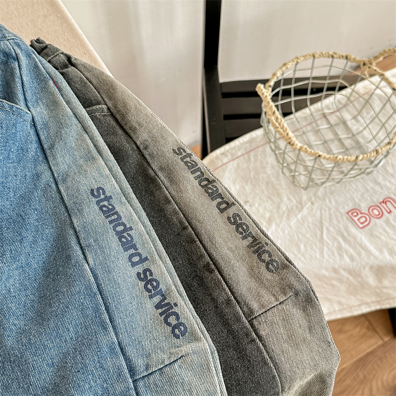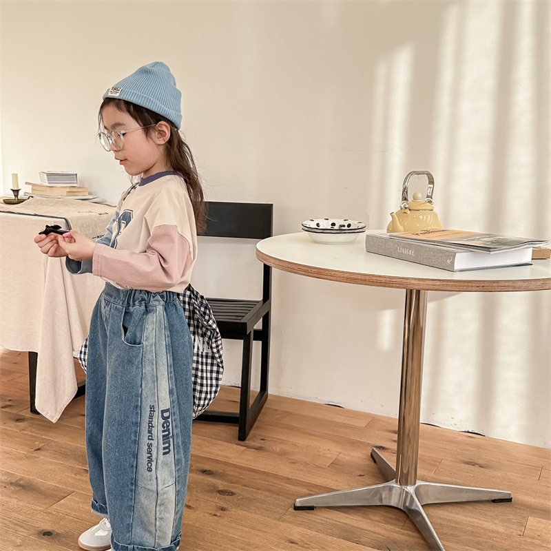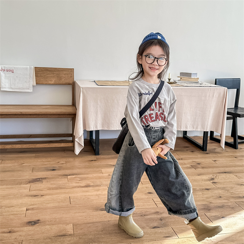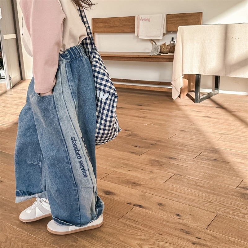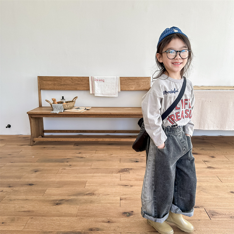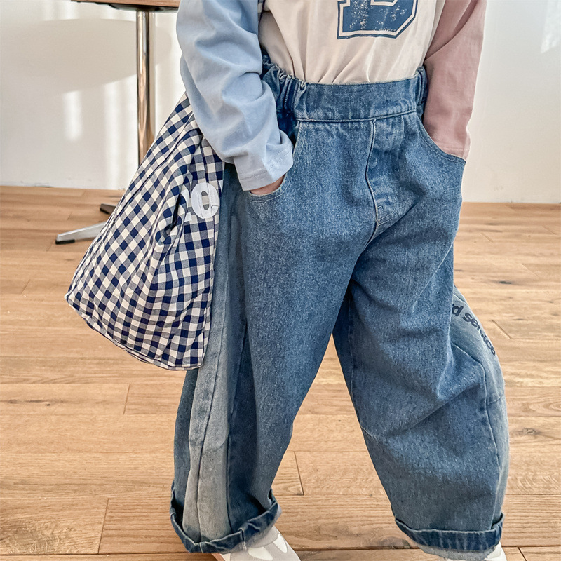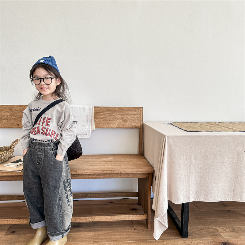봄 2024 어린이 청바지 소년 한국식 편지 인쇄 복고풍 청바지 하렘 바지 유행 바지스토어 가기
