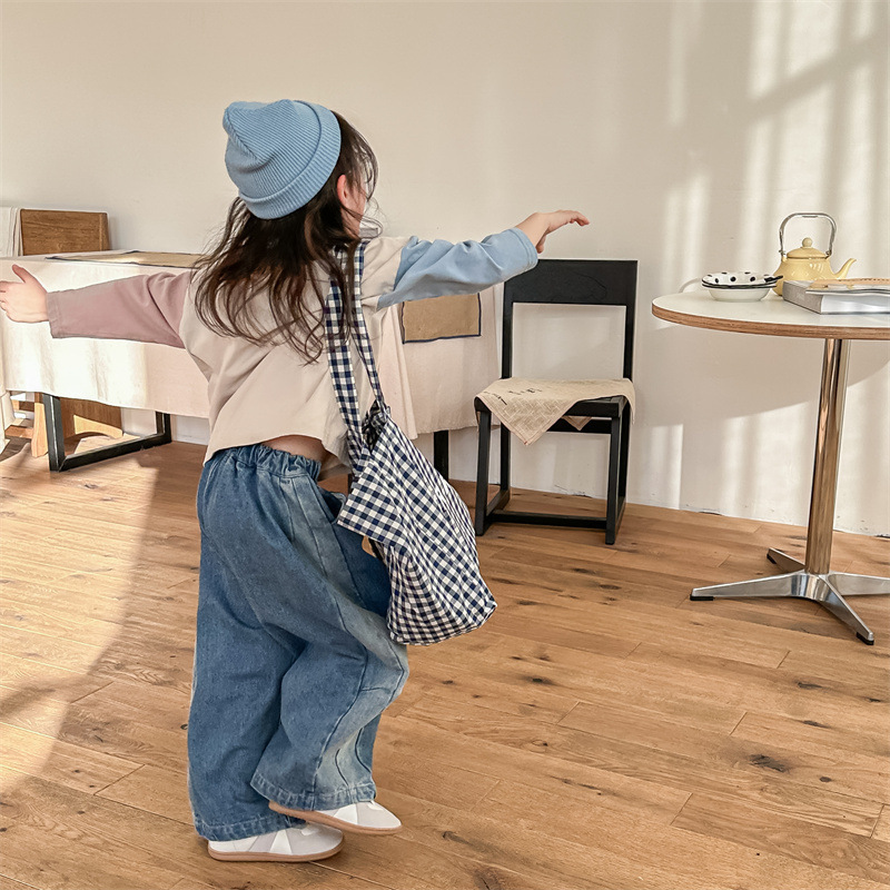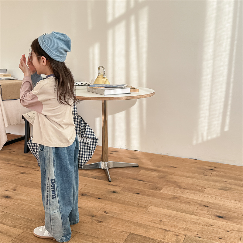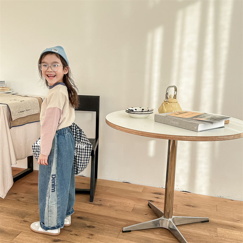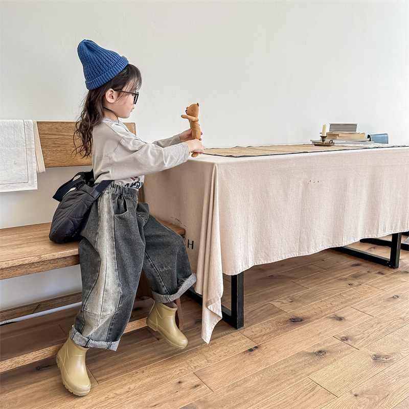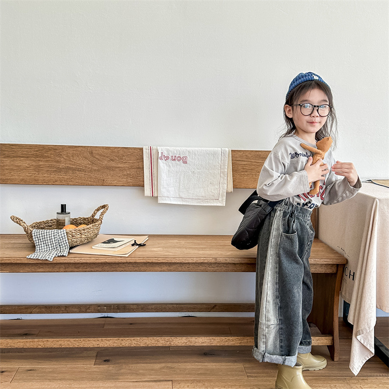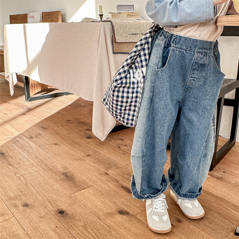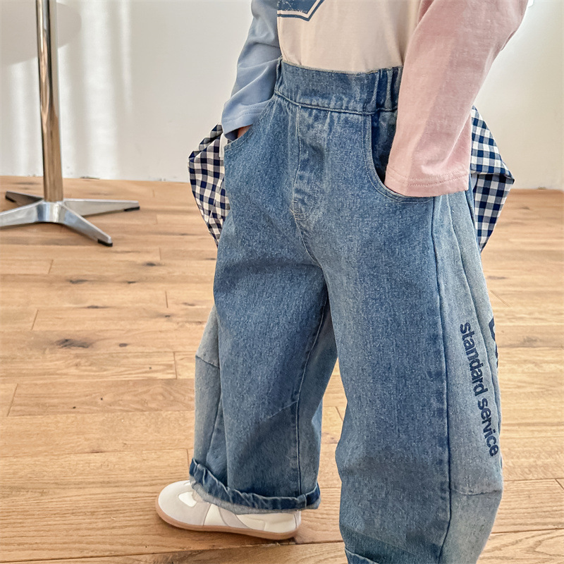 봄 2024 어린이 청바지 소년 한국식 편지 인쇄 복고풍 청바지 하렘 바지 유행 바지스토어 가기